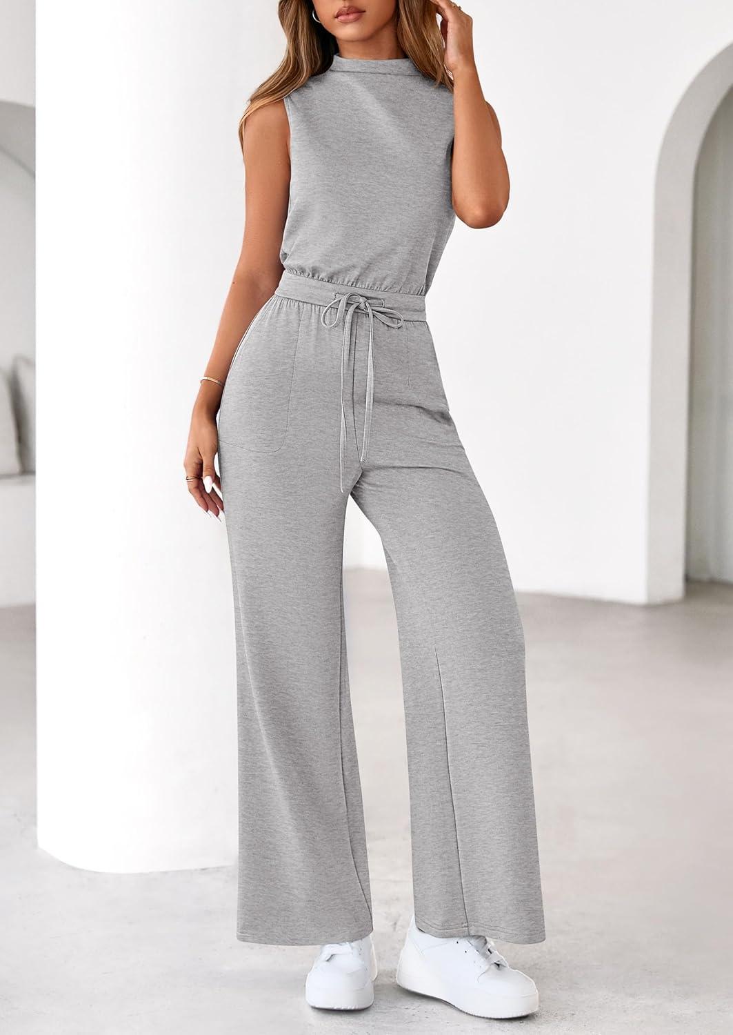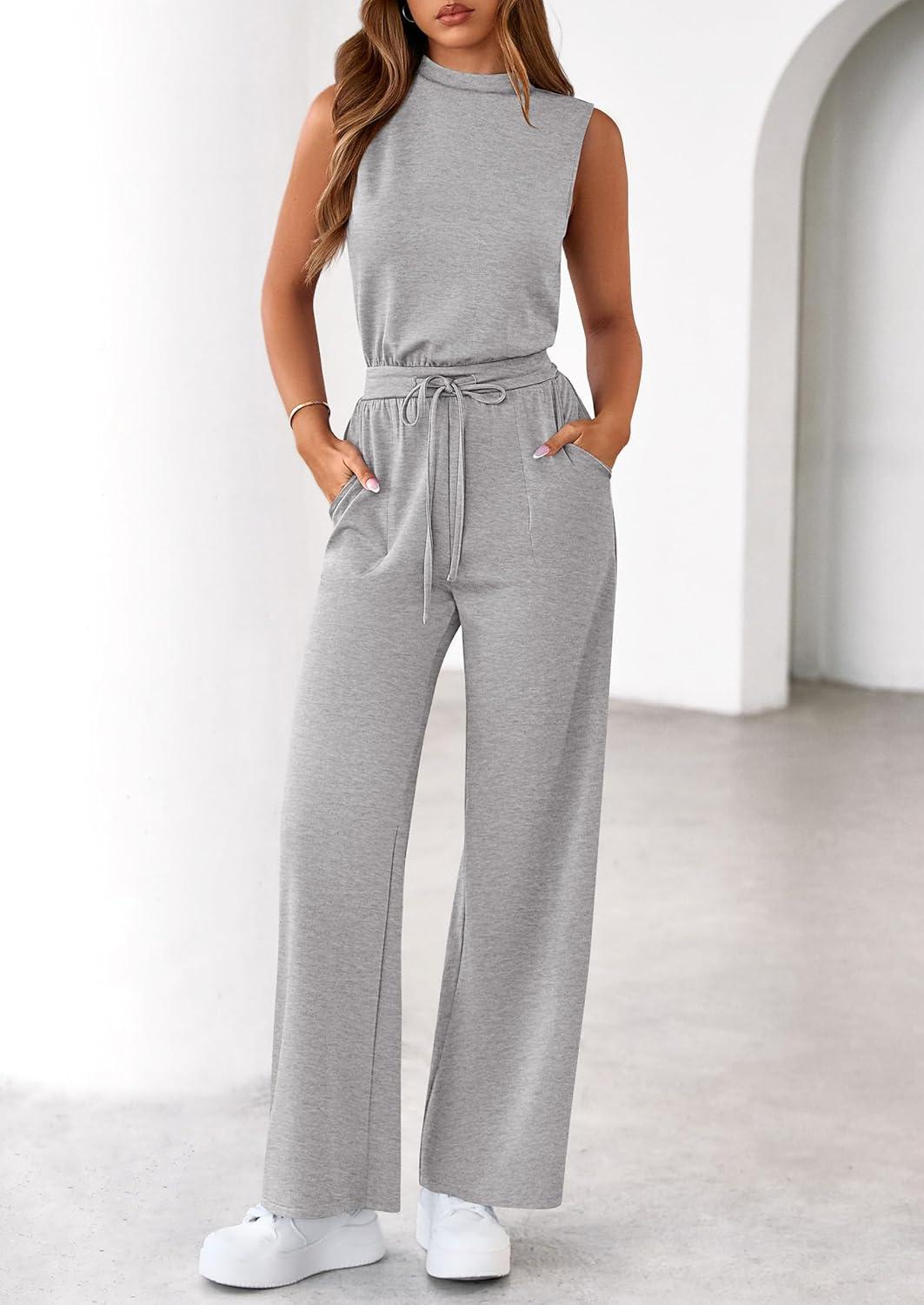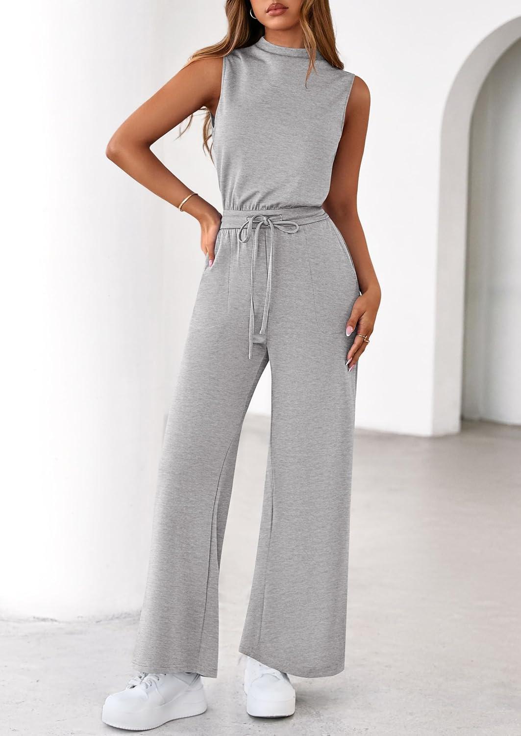 PRETTYGARDEN One Piece Jumpsuits for Women Dressy Summer Business Casual Outifts Sleeveless Mock Neck Wide Leg Rompers(Grey)