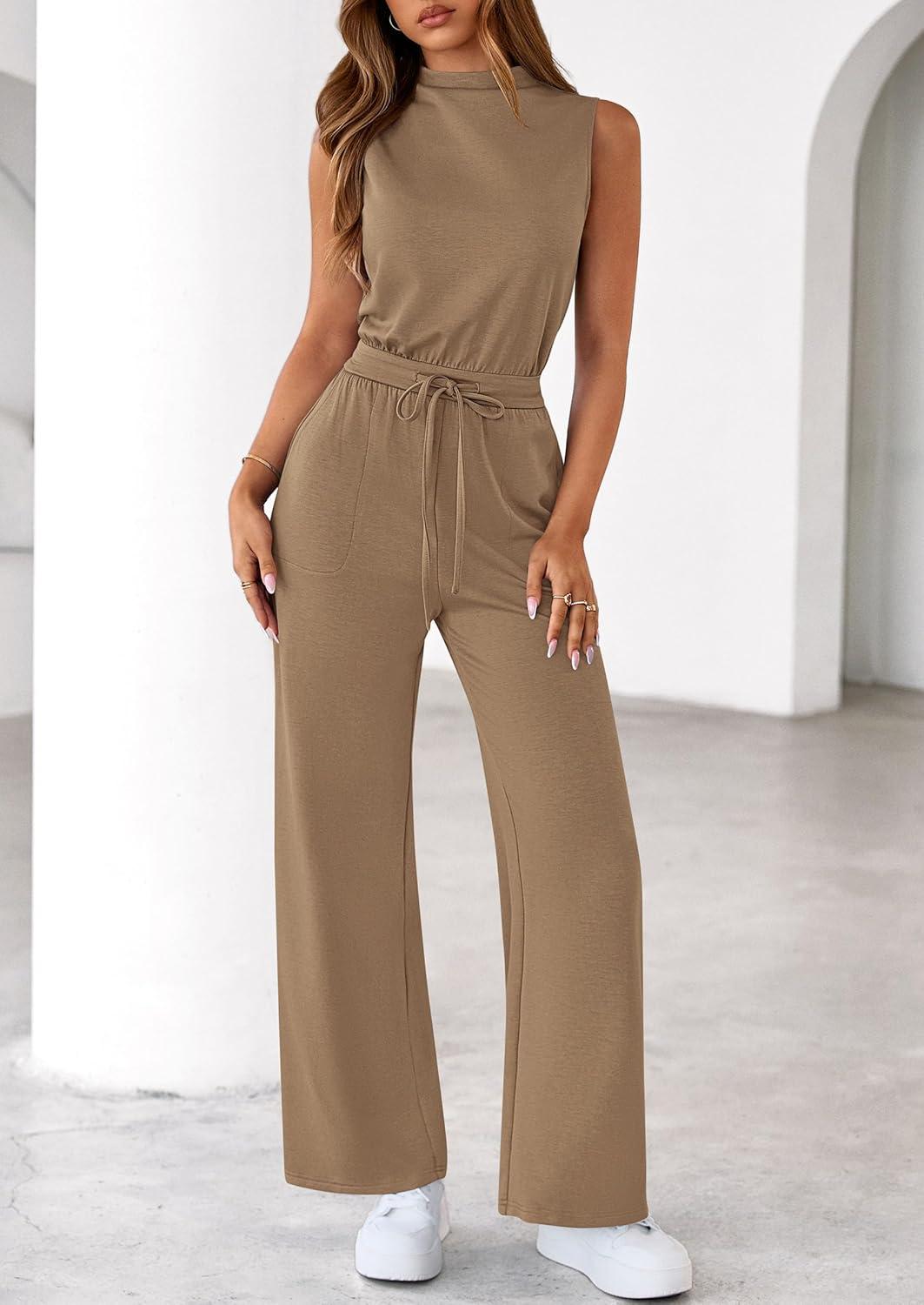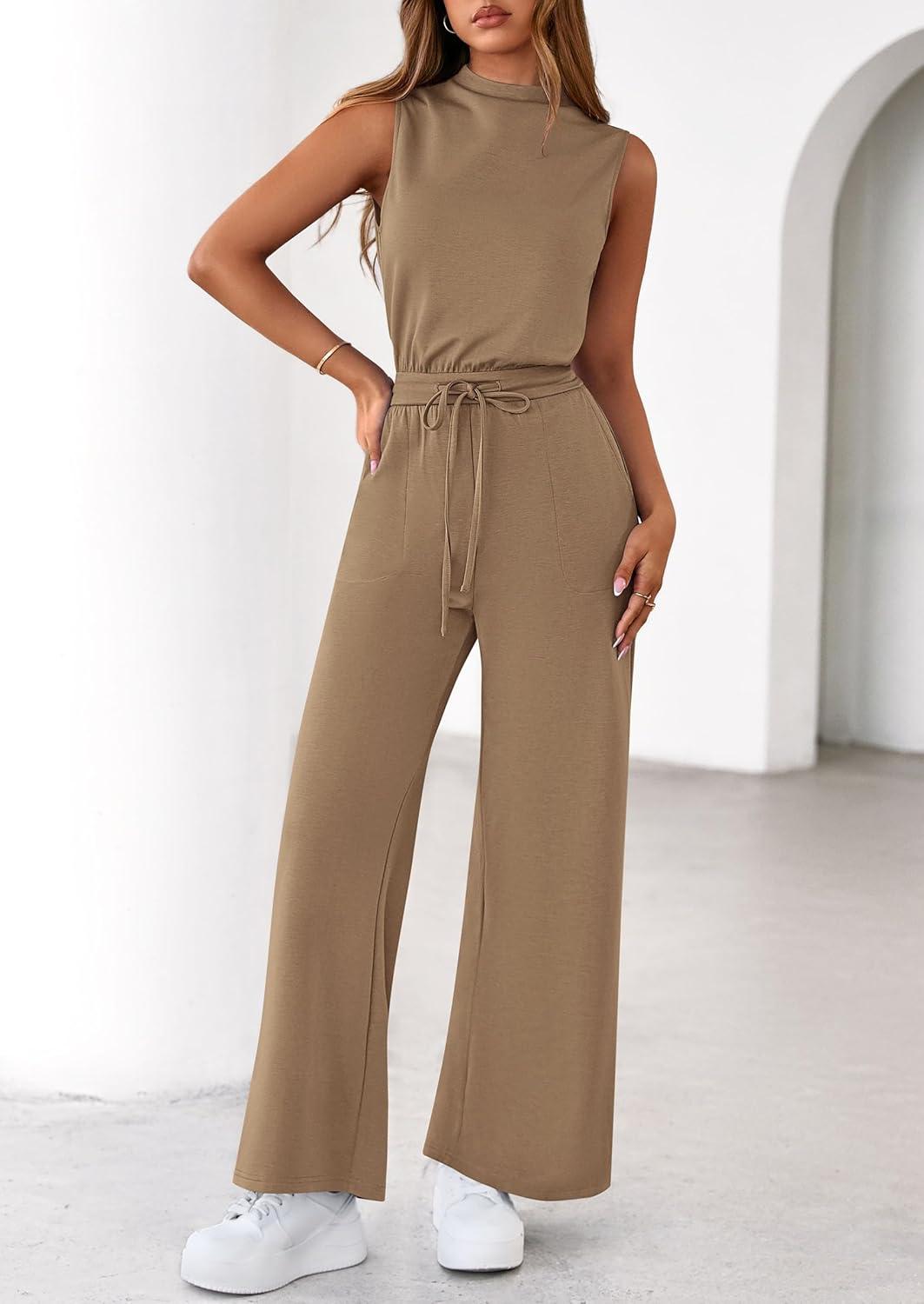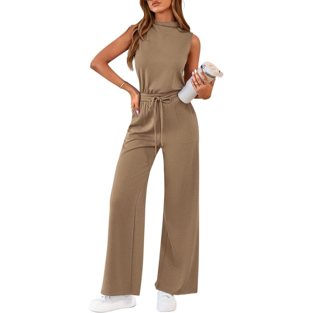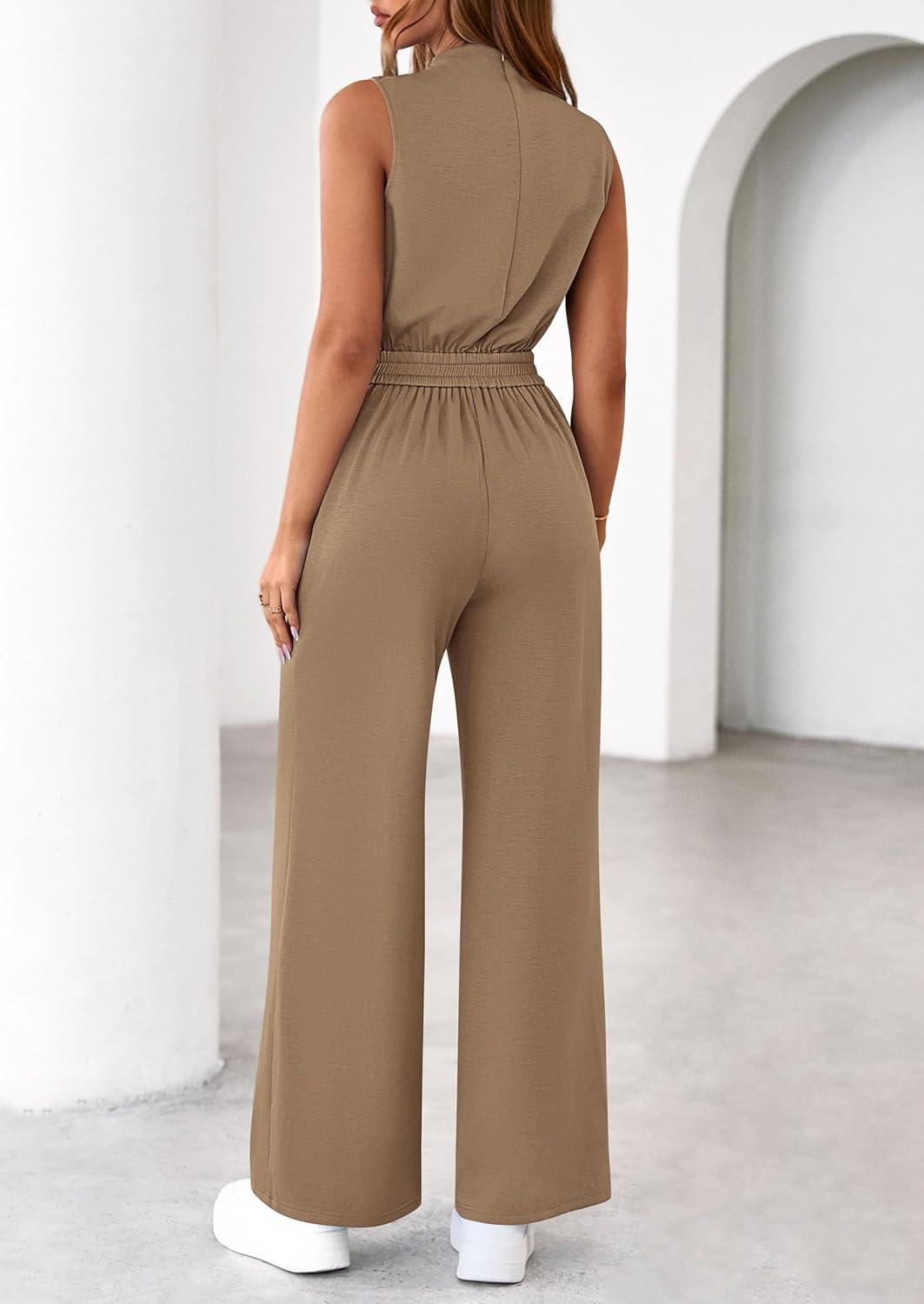 PRETTYGARDEN One Piece Jumpsuits for Women Dressy Summer Business Casual Outifts Sleeveless Mock Neck Wide Leg Rompers(Khaki)