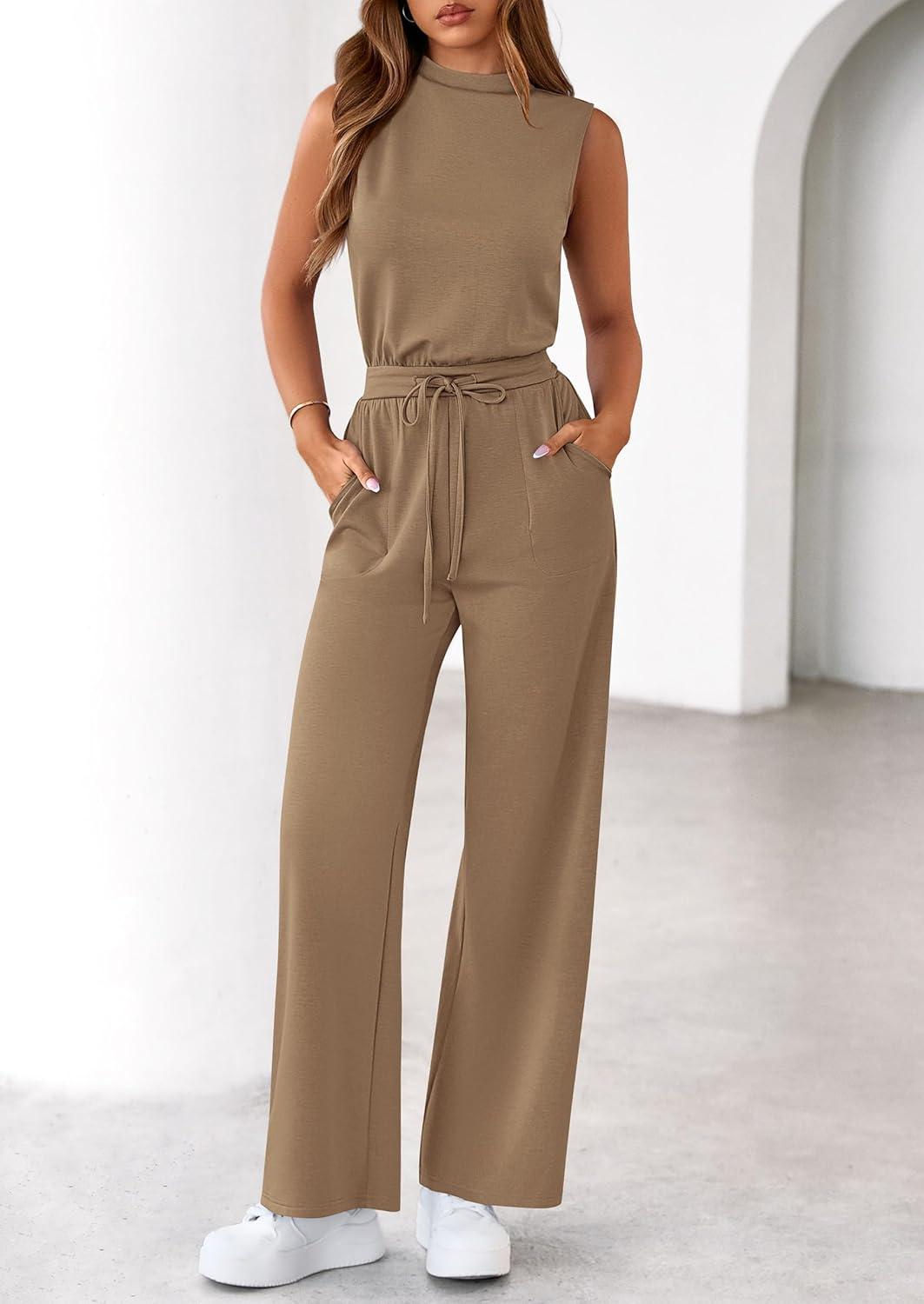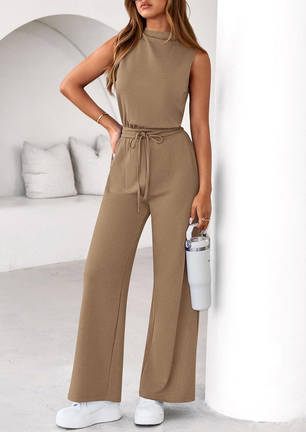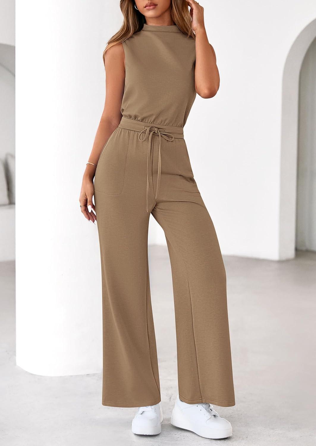 PRETTYGARDEN One Piece Jumpsuits for Women Dressy Summer Business Casual Outifts Sleeveless Mock Neck Wide Leg Rompers(Khaki)
