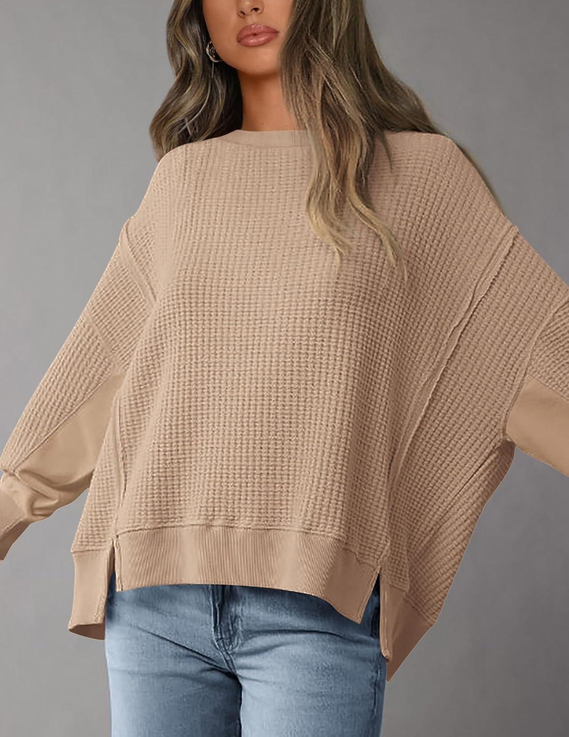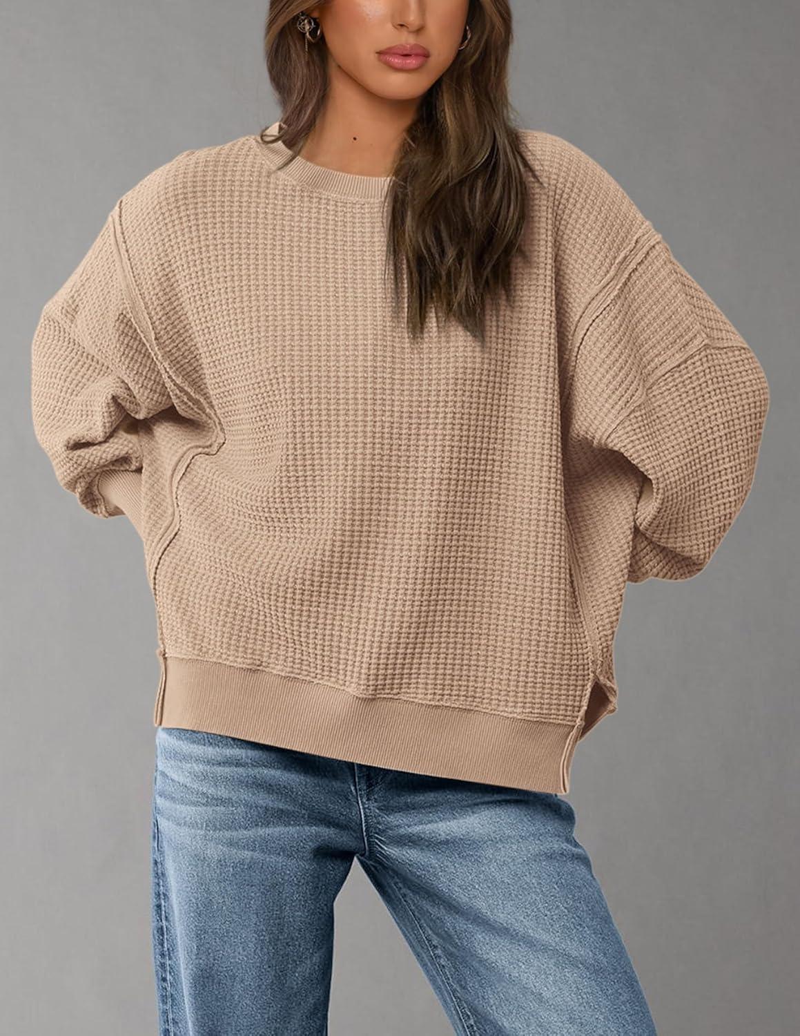 imagePRETTYGARDEN Oversized Sweatshirt for Women 2025 Fashion Crewneck Long Sleeve Pullover Waffle Knit Tops Fall Trendy ClothesApricot