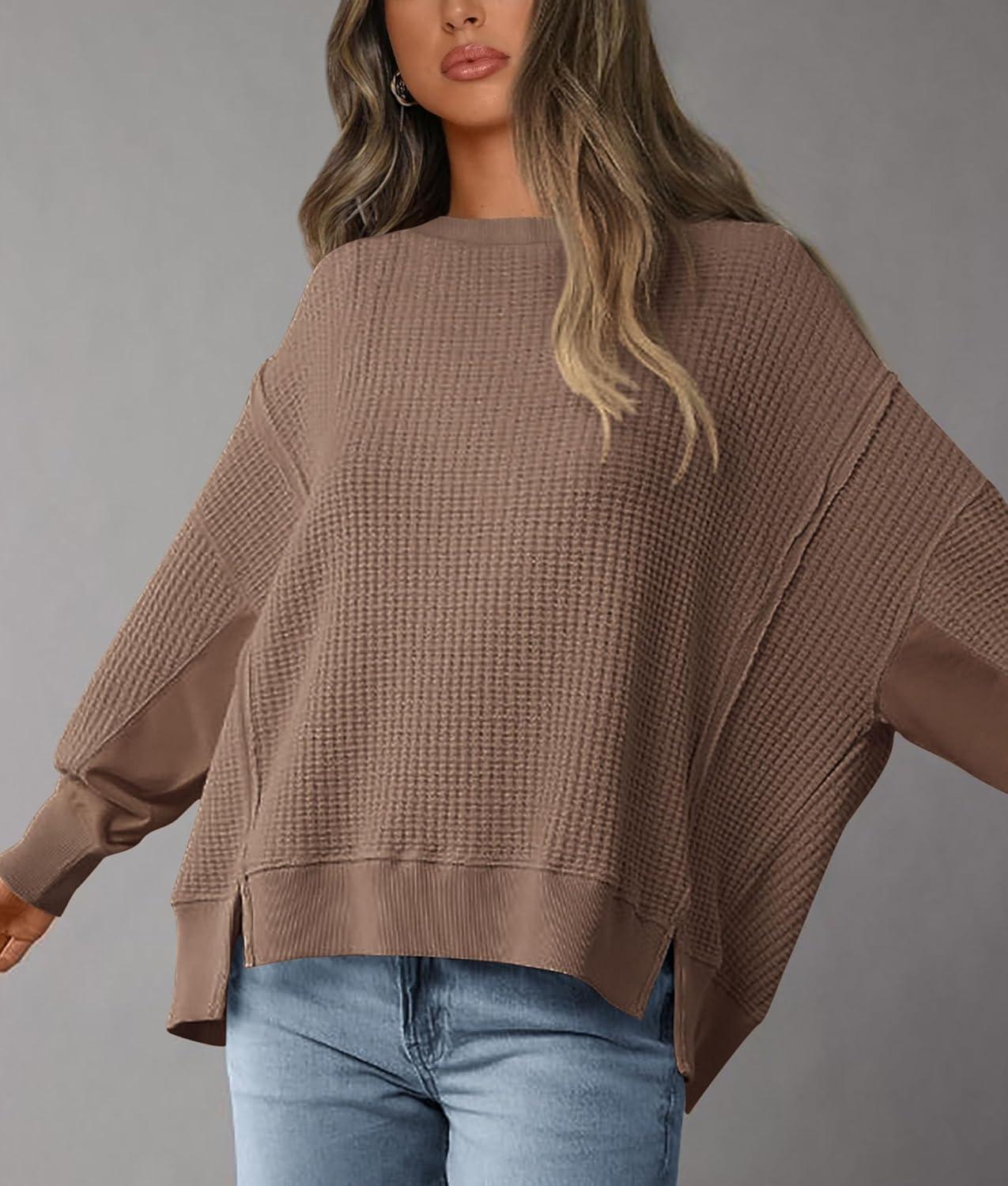 PRETTYGARDEN Oversized Sweatshirt for Women 2025 Fashion Crewneck Long Sleeve Pullover Waffle Knit Tops Fall Trendy Clothes(Brown)