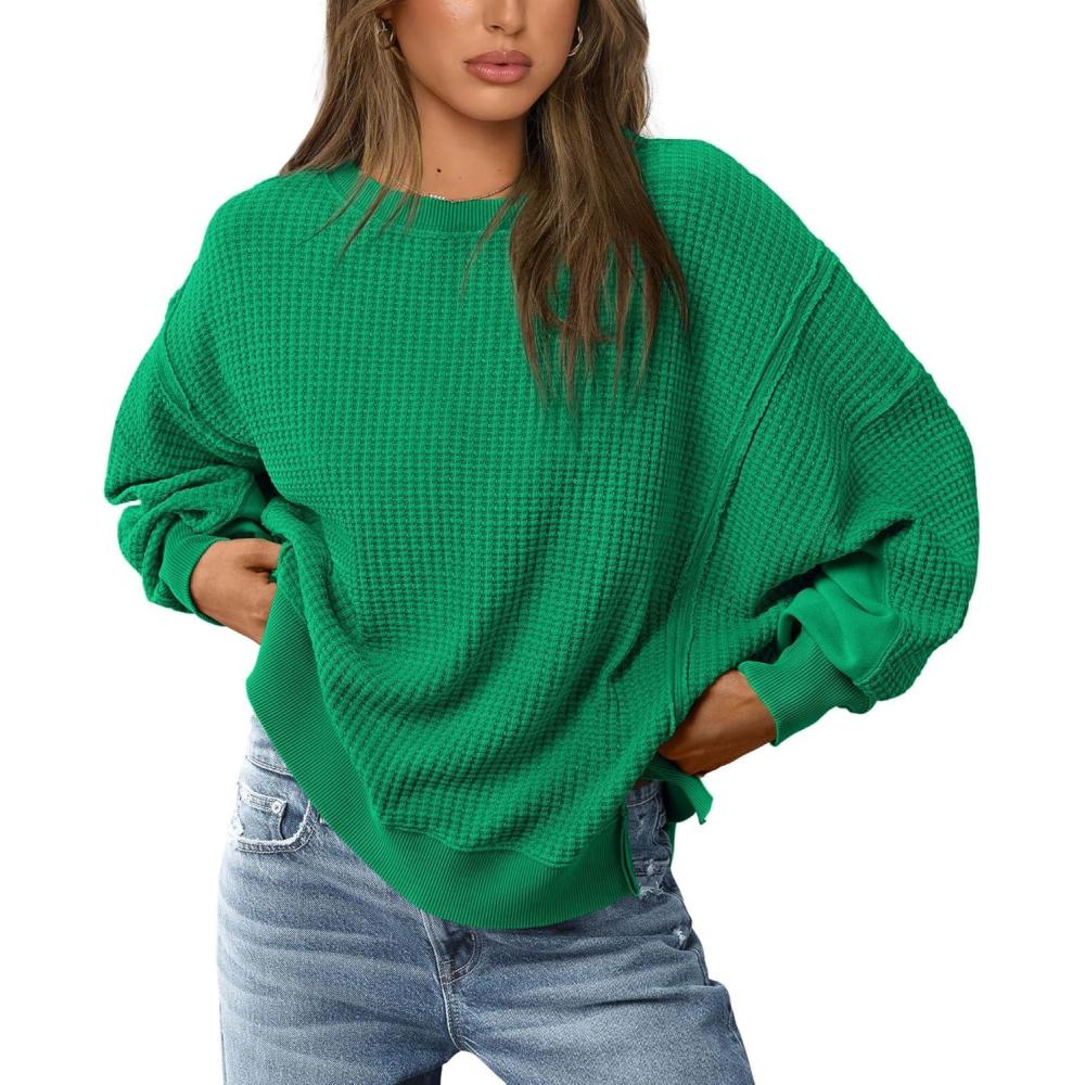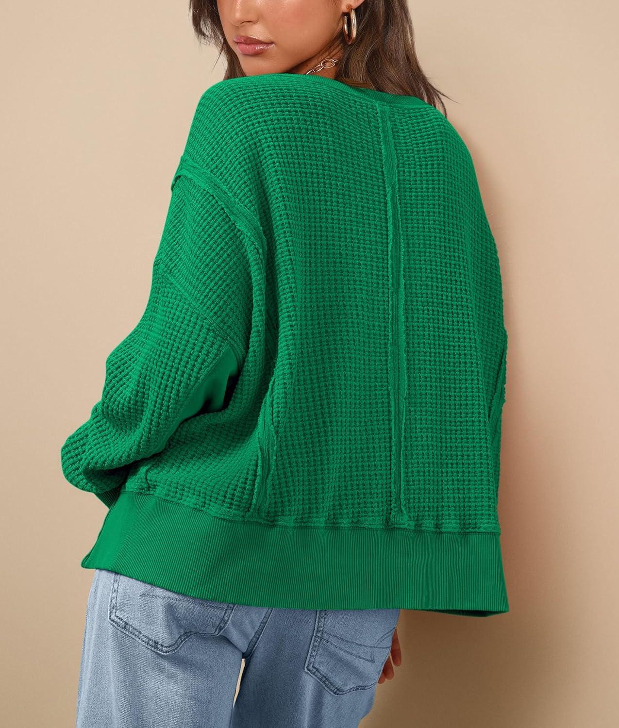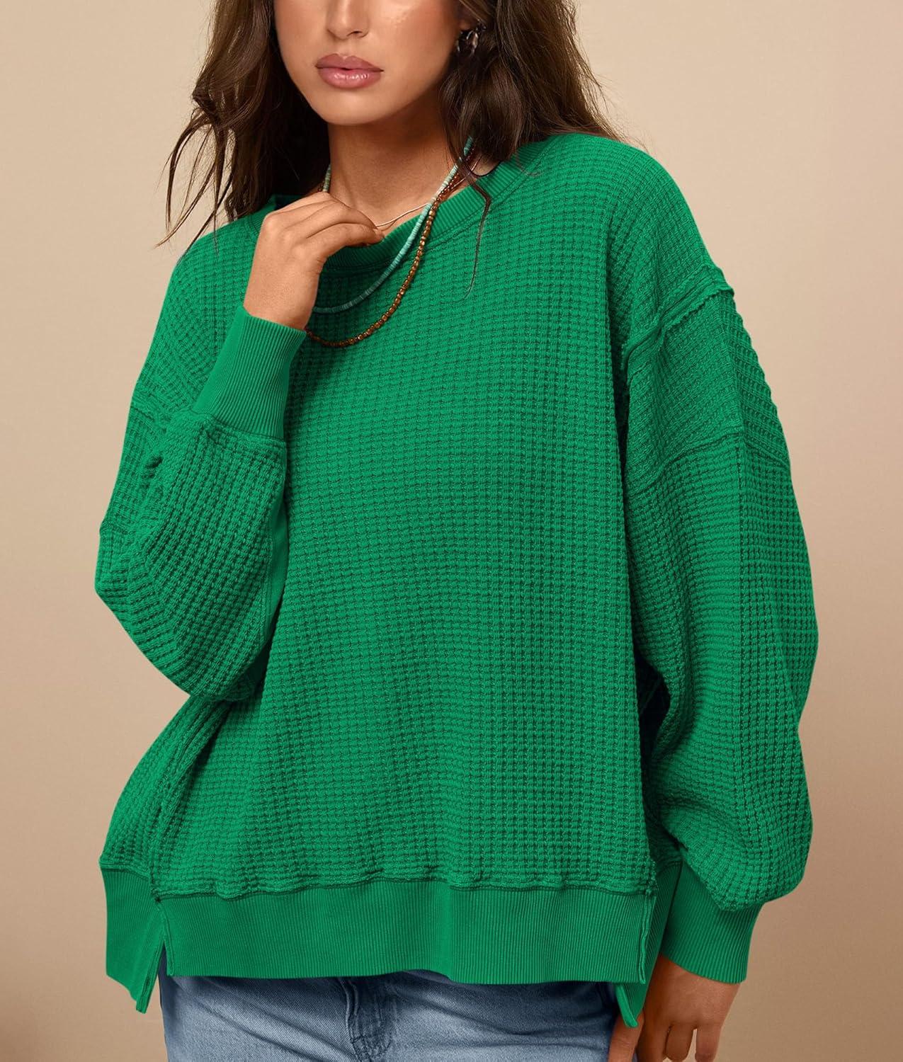 imagePRETTYGARDEN Oversized Sweatshirt for Women 2025 Fashion Crewneck Long Sleeve Pullover Waffle Knit Tops Fall Trendy ClothesGreen