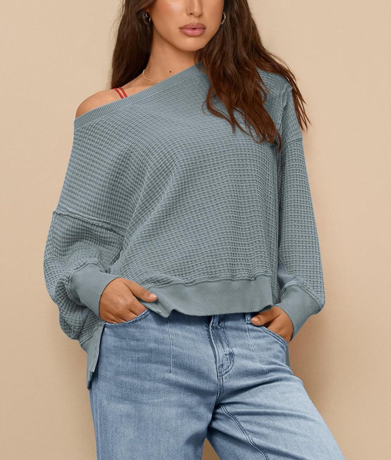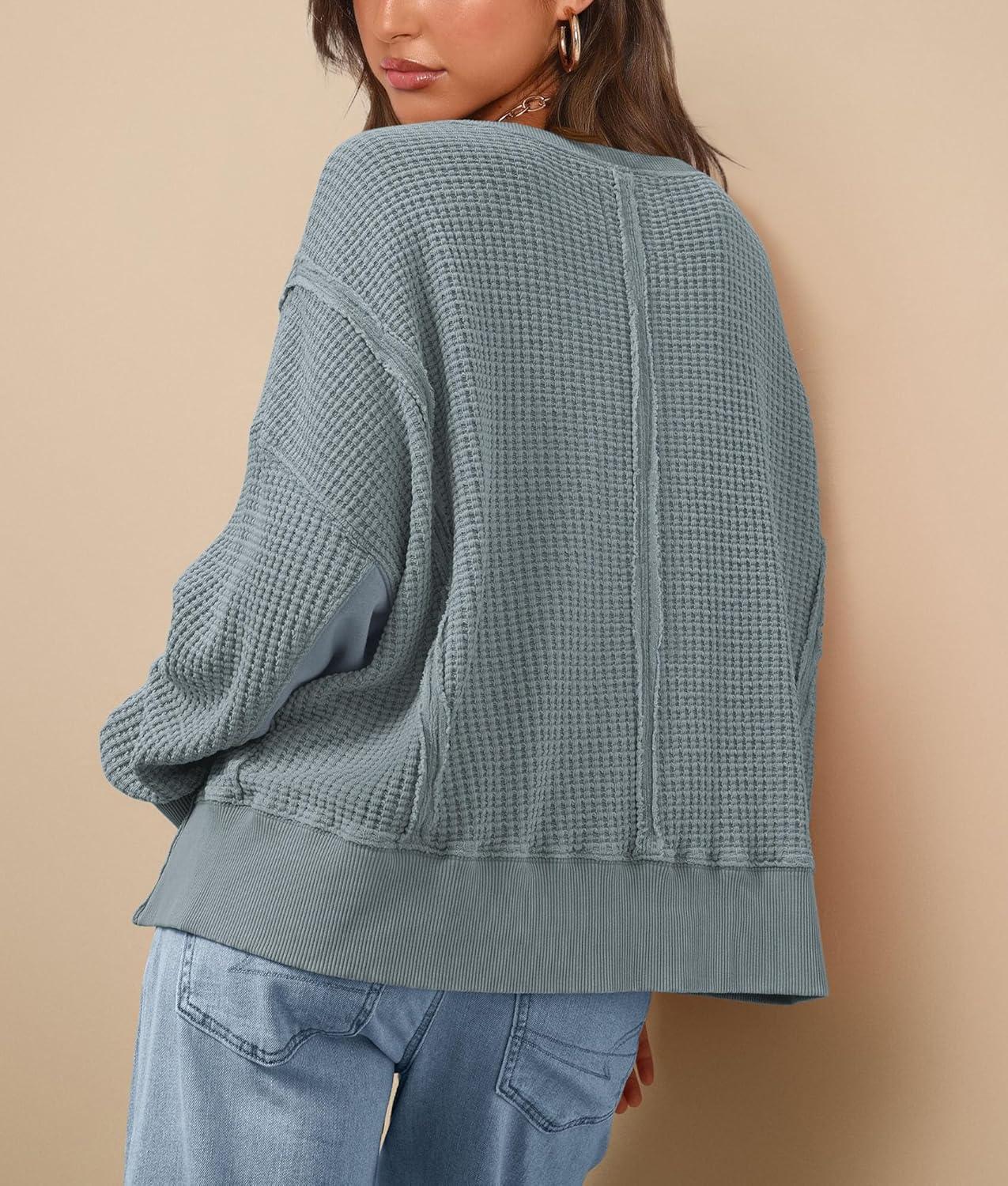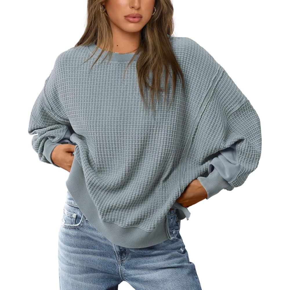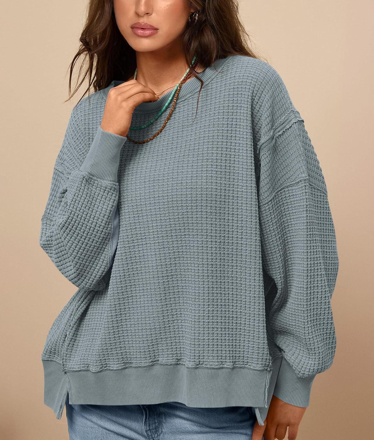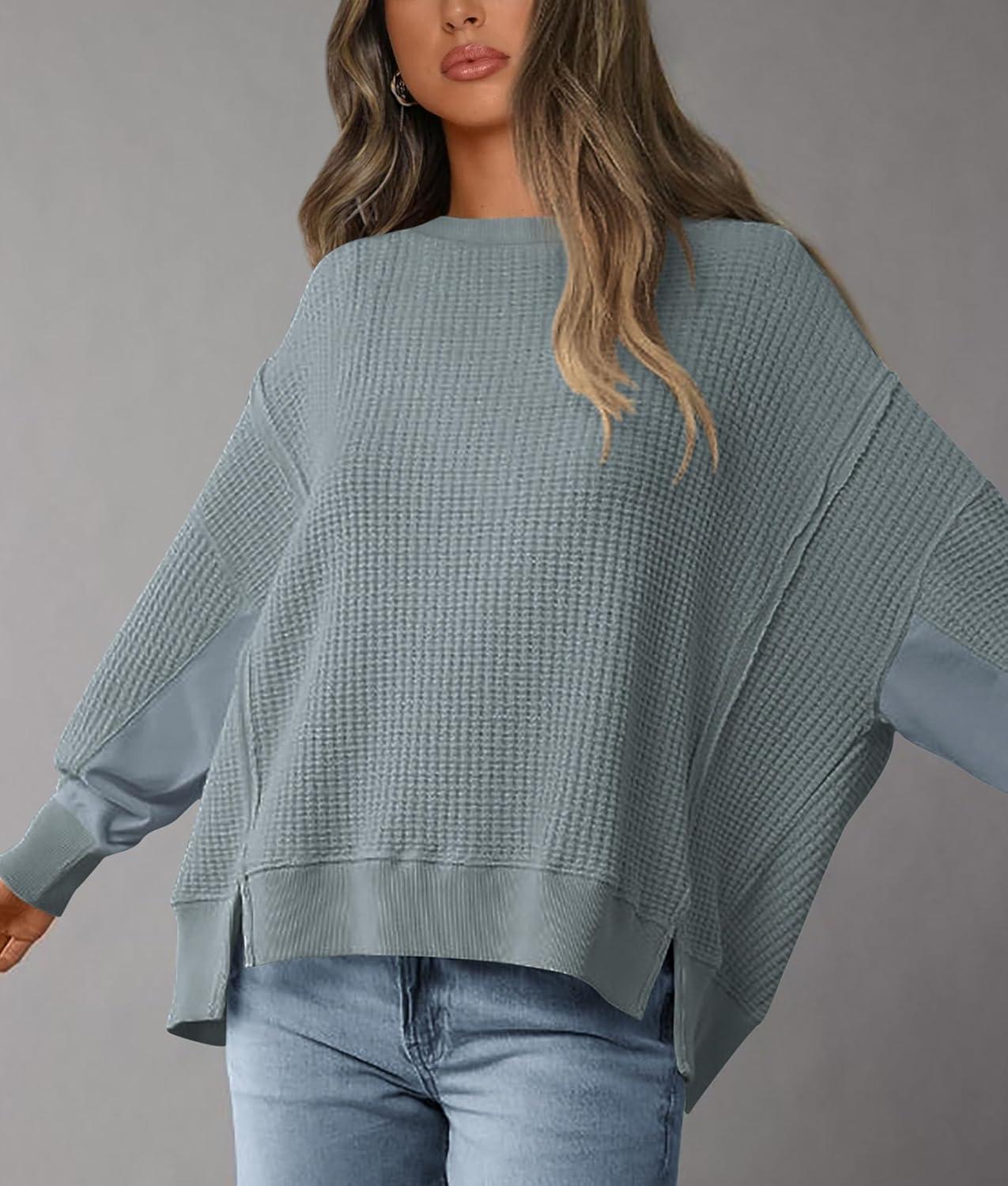 PRETTYGARDEN Oversized Sweatshirt for Women 2025 Fashion Crewneck Long Sleeve Pullover Waffle Knit Tops Fall Trendy Clothes(Grey Blue)