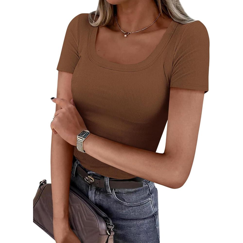 PRETTYGARDEN Short Sleeve Shirts for Women 2026 Summer Trendy Scoop Neck Ribbed Tops Spring Casual Slim Fitted Basic Tees(Khaki)