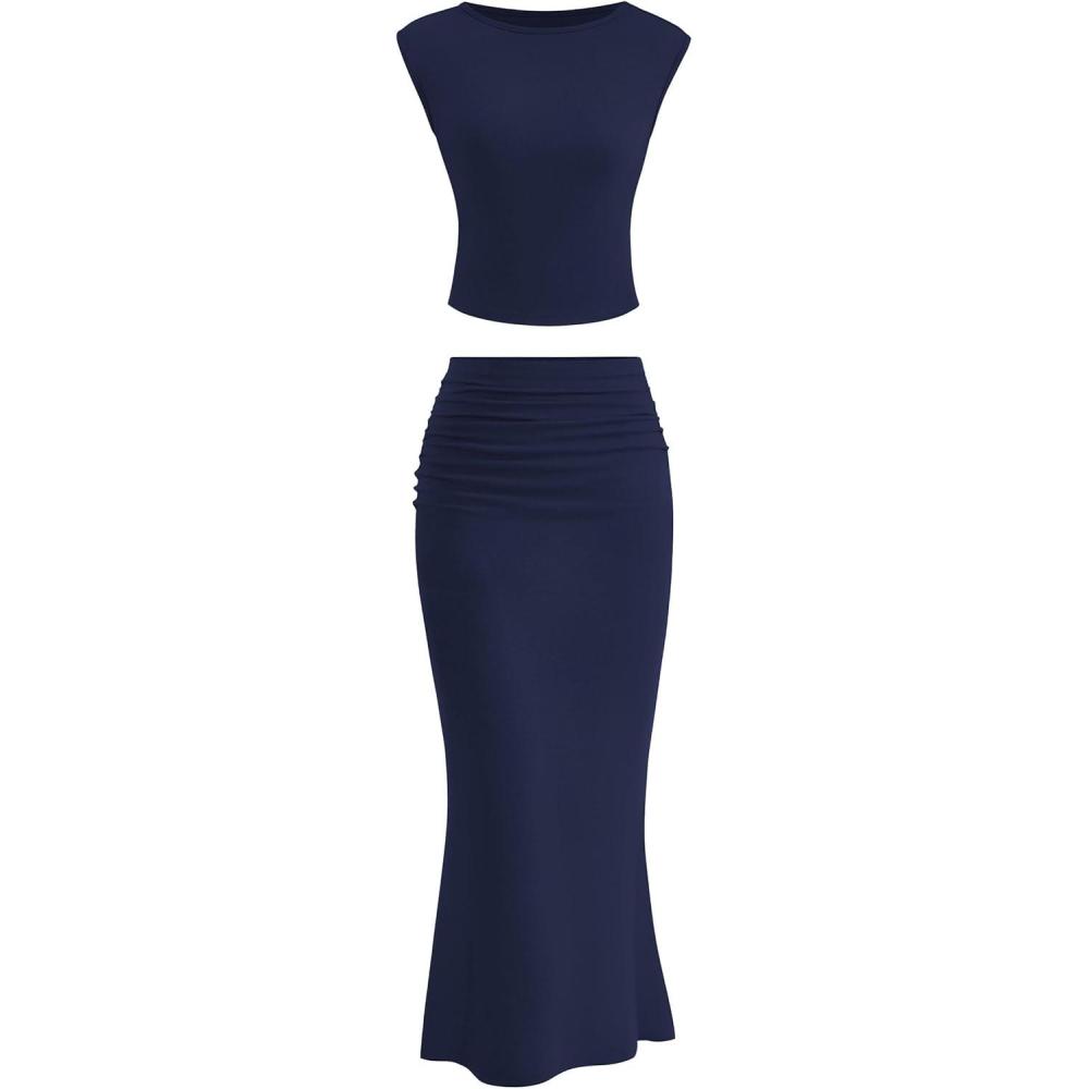 imagePRETTYGARDEN Skirt Sets Women 2 Piece Outfits Summer Outfits 2025 Going Out Crop Tops Long Maxi Skirts Beach Vacation ClothesNavy