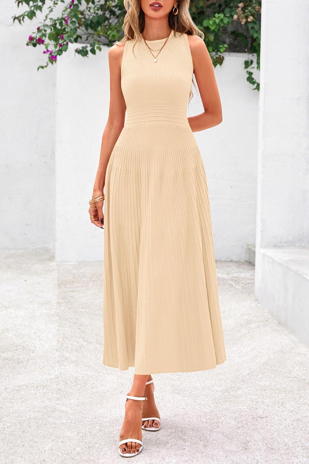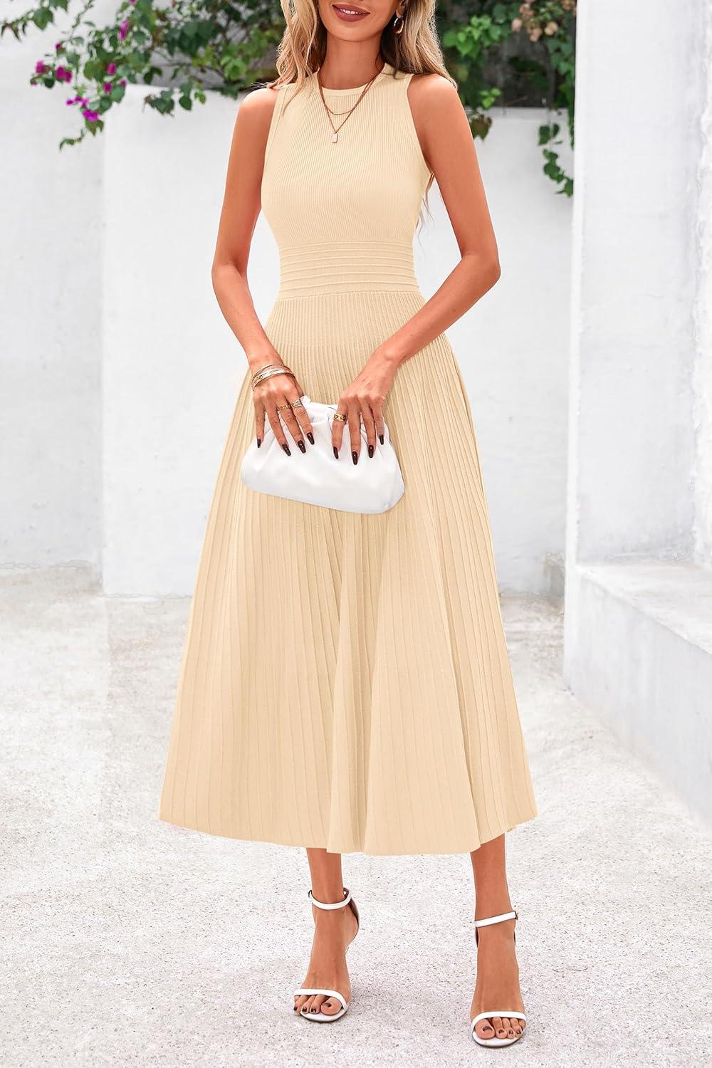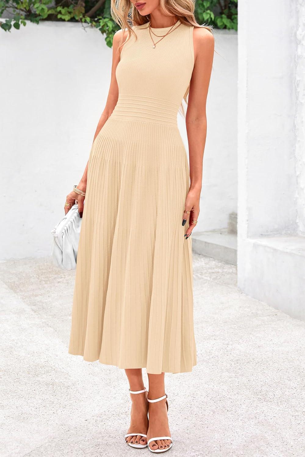 PRETTYGARDEN Spring Casual Dresses for Women 2025 Summer Business Work Midi Sleeveless A Line Pleated Cocktail Dress(Apricot)