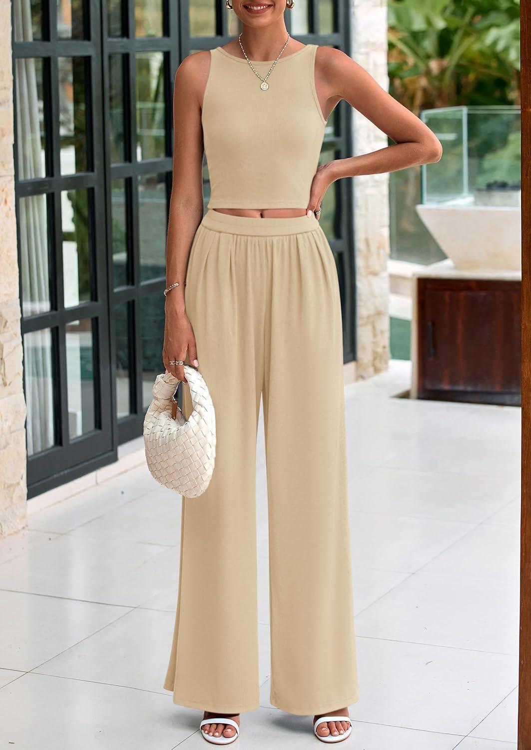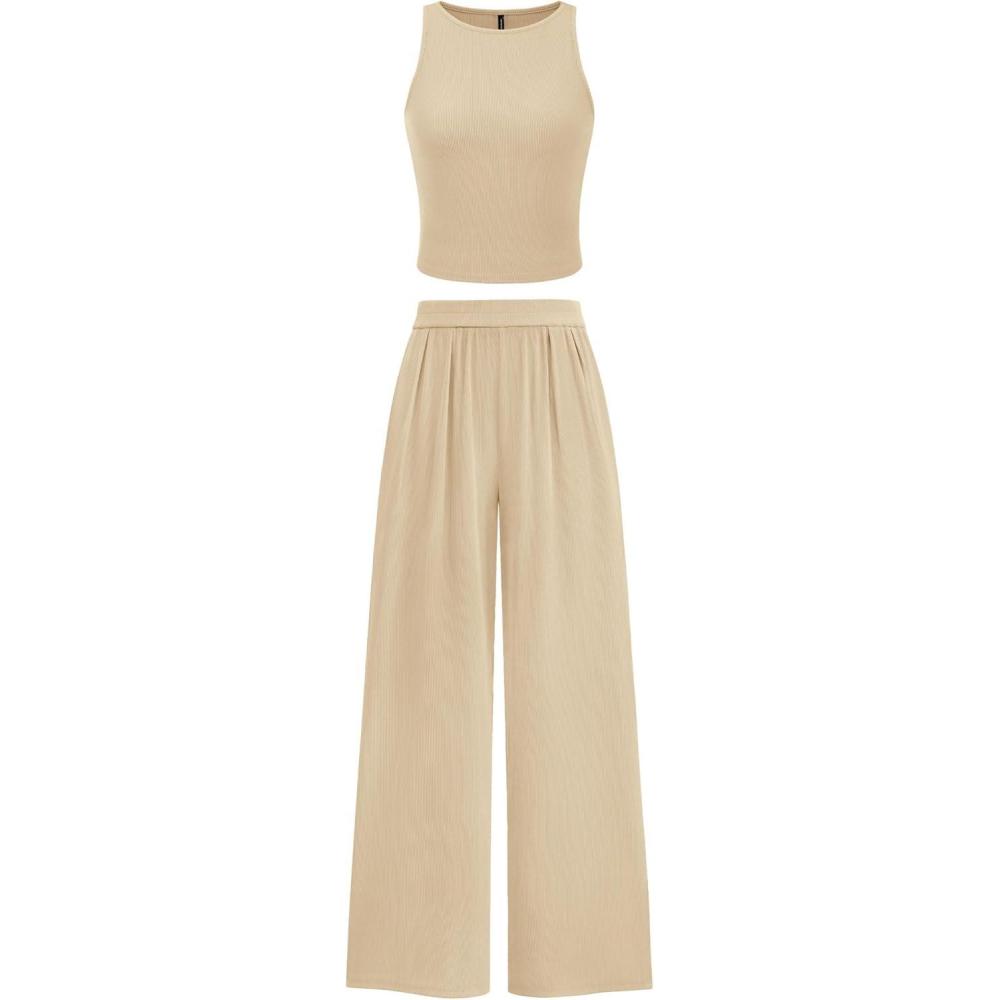 PRETTYGARDEN Spring Two Piece Sets For Women 2025 Ribbed Knit Crew Neck Sleeveless Tank Tops Wide Leg Pants Casual Lounge Set(Apricot)