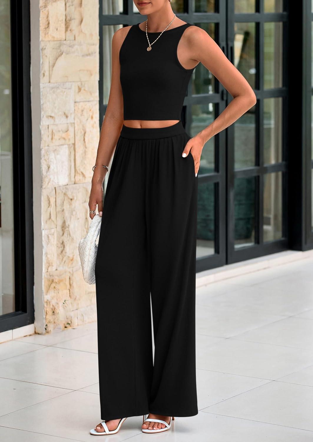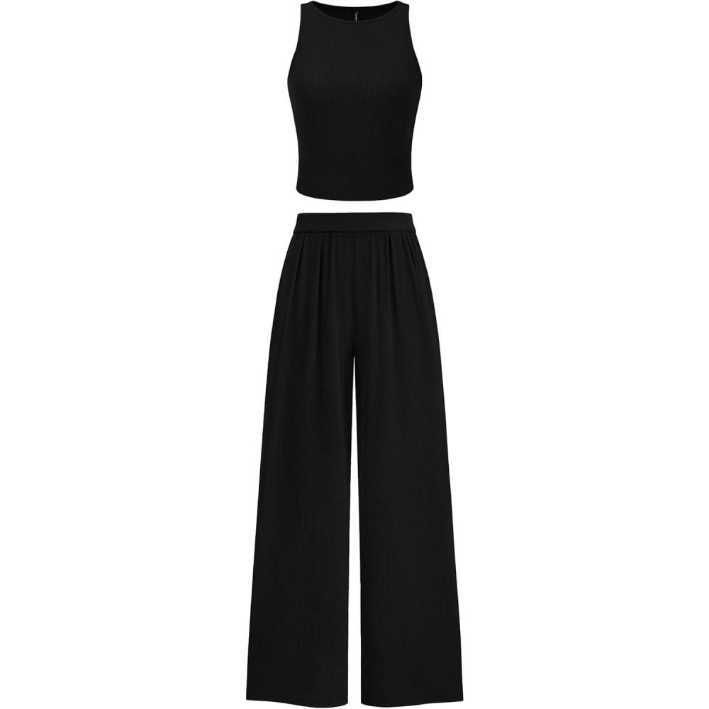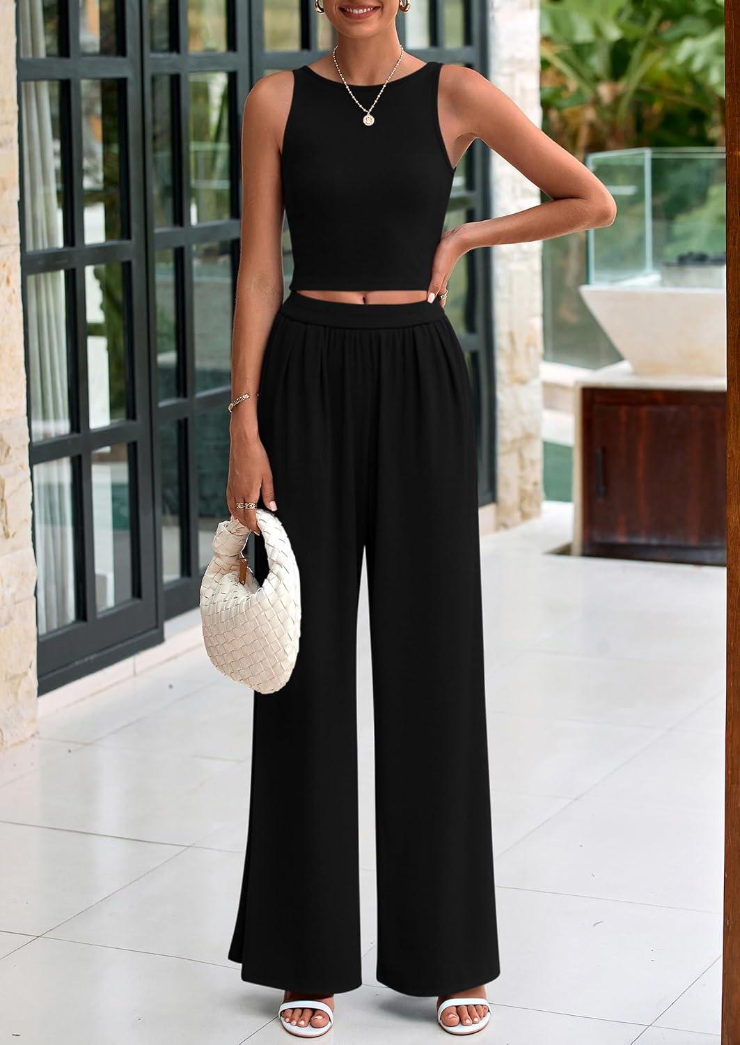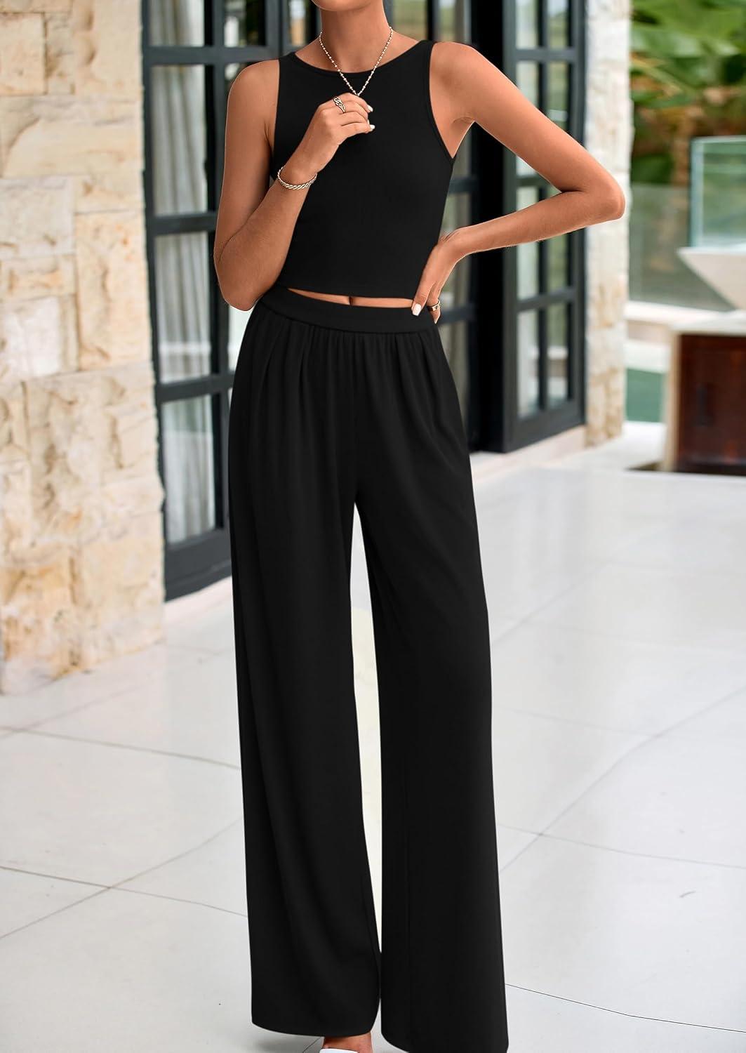 PRETTYGARDEN Spring Two Piece Sets For Women 2025 Ribbed Knit Crew Neck Sleeveless Tank Tops Wide Leg Pants Casual Lounge Set(Black)