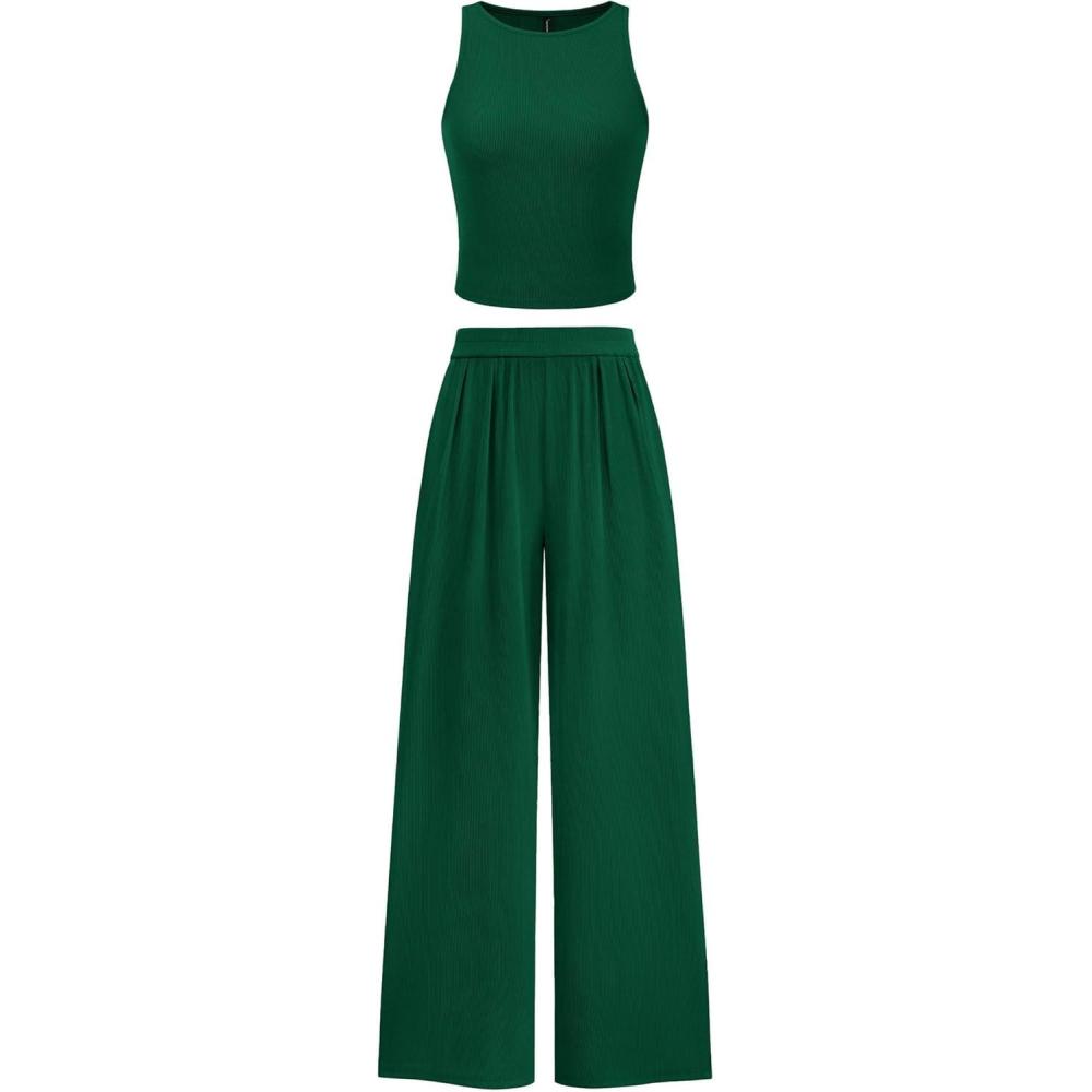 PRETTYGARDEN Spring Two Piece Sets For Women 2025 Ribbed Knit Crew Neck Sleeveless Tank Tops Wide Leg Pants Casual Lounge Set(Green)