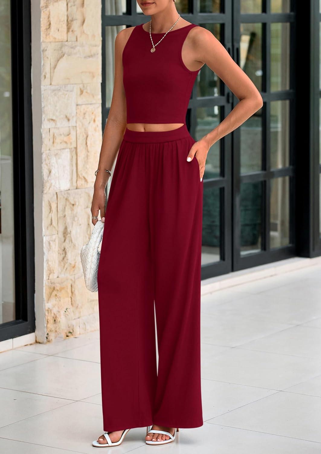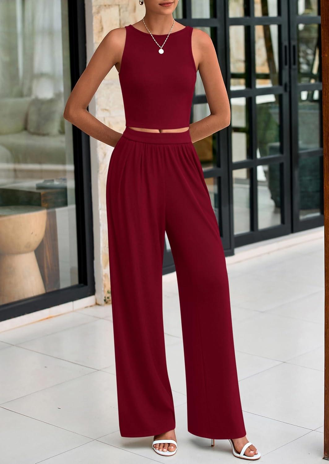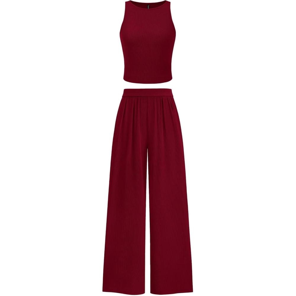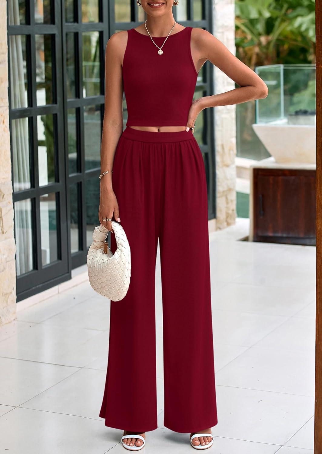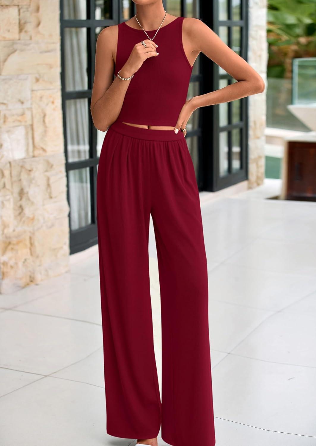 PRETTYGARDEN Spring Two Piece Sets For Women 2025 Ribbed Knit Crew Neck Sleeveless Tank Tops Wide Leg Pants Casual Lounge Set(Wine Red)