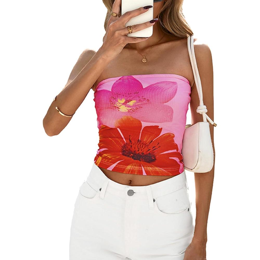 PRETTYGARDEN Strapless Tube Tops for Women 2025 Summer Mesh Floral Y2K Bandeau Cute Crop Top Trendy Going Out Outfits(Purple Orange)
