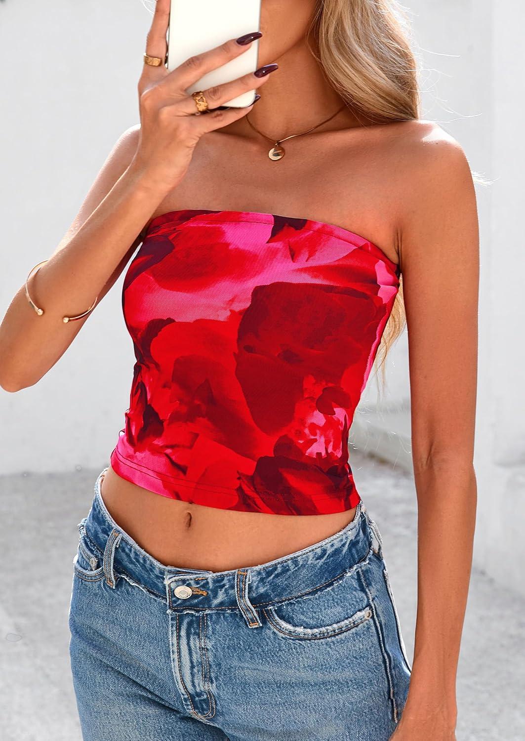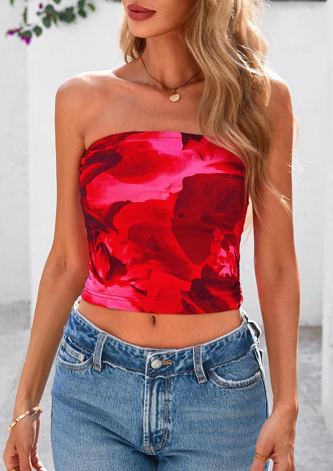 PRETTYGARDEN Strapless Tube Tops for Women 2025 Summer Mesh Floral Y2K Bandeau Cute Crop Top Trendy Going Out Outfits(Red)