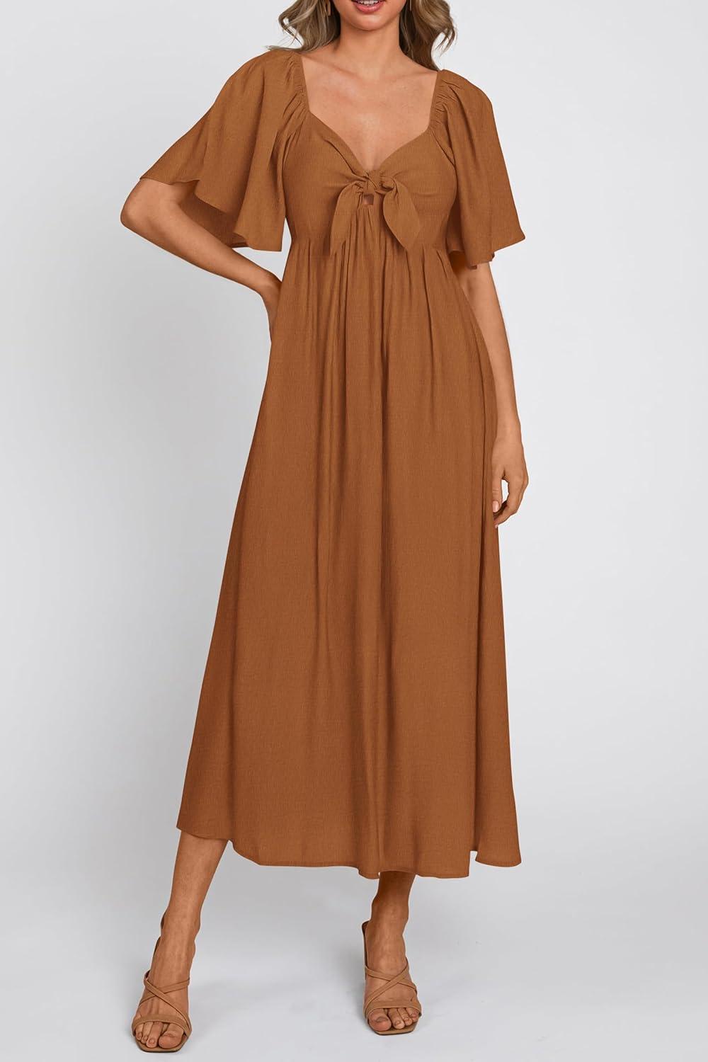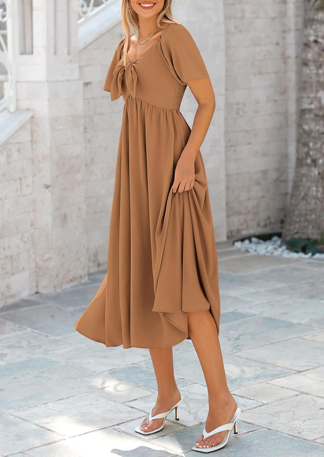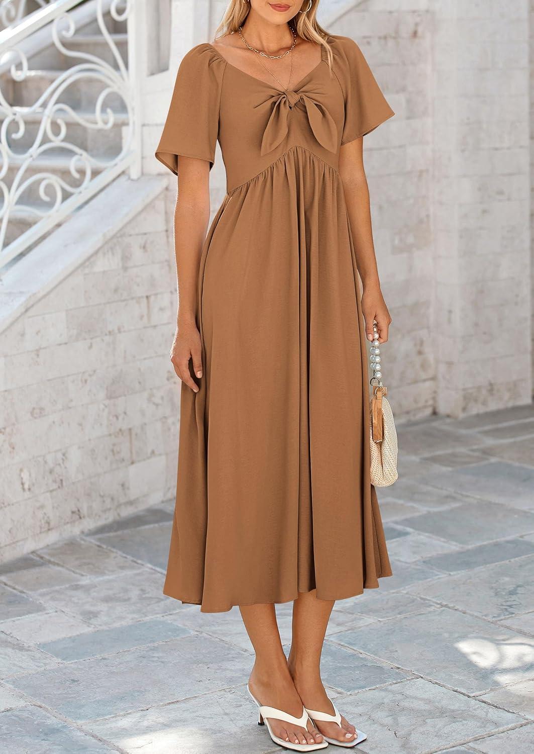 PRETTYGARDEN Summer Dress for Women 2025 Casual Short Sleeve Bow Tie V Neck Ruffle Midi Flowy Dresses(Brown)