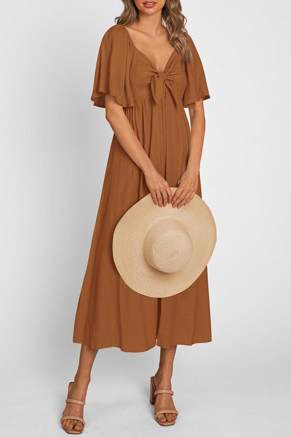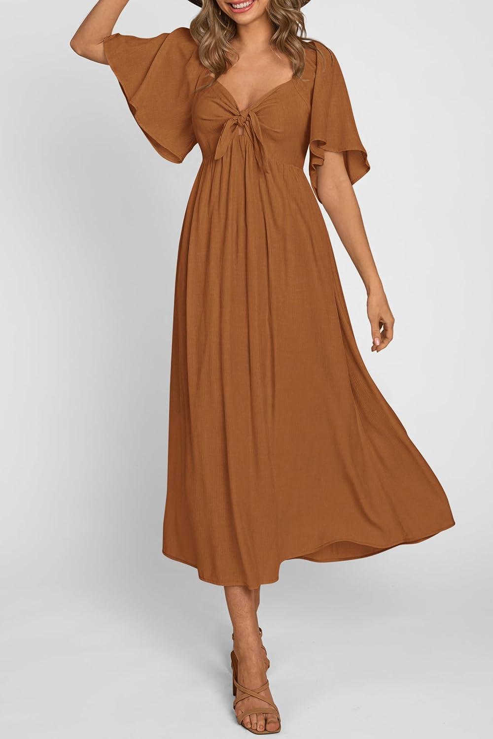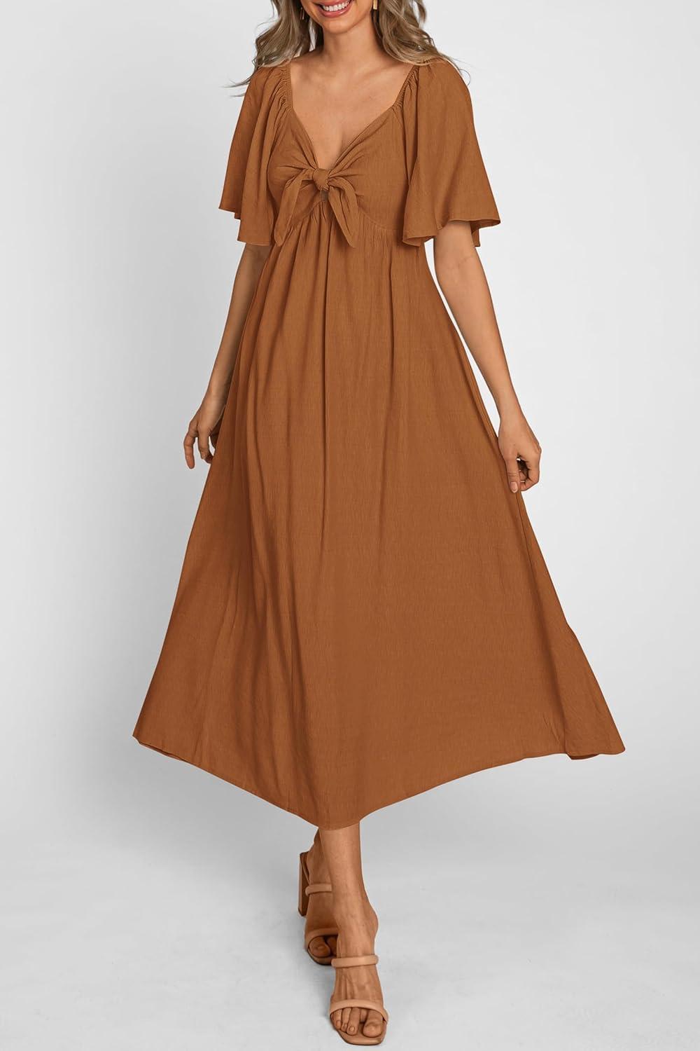PRETTYGARDEN Summer Dress for Women 2025 Casual Short Sleeve Bow Tie V Neck Ruffle Midi Flowy Dresses(Brown)