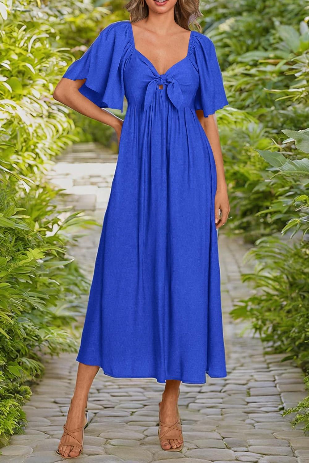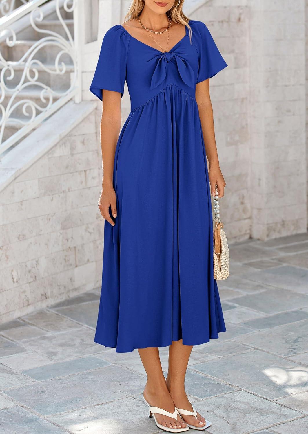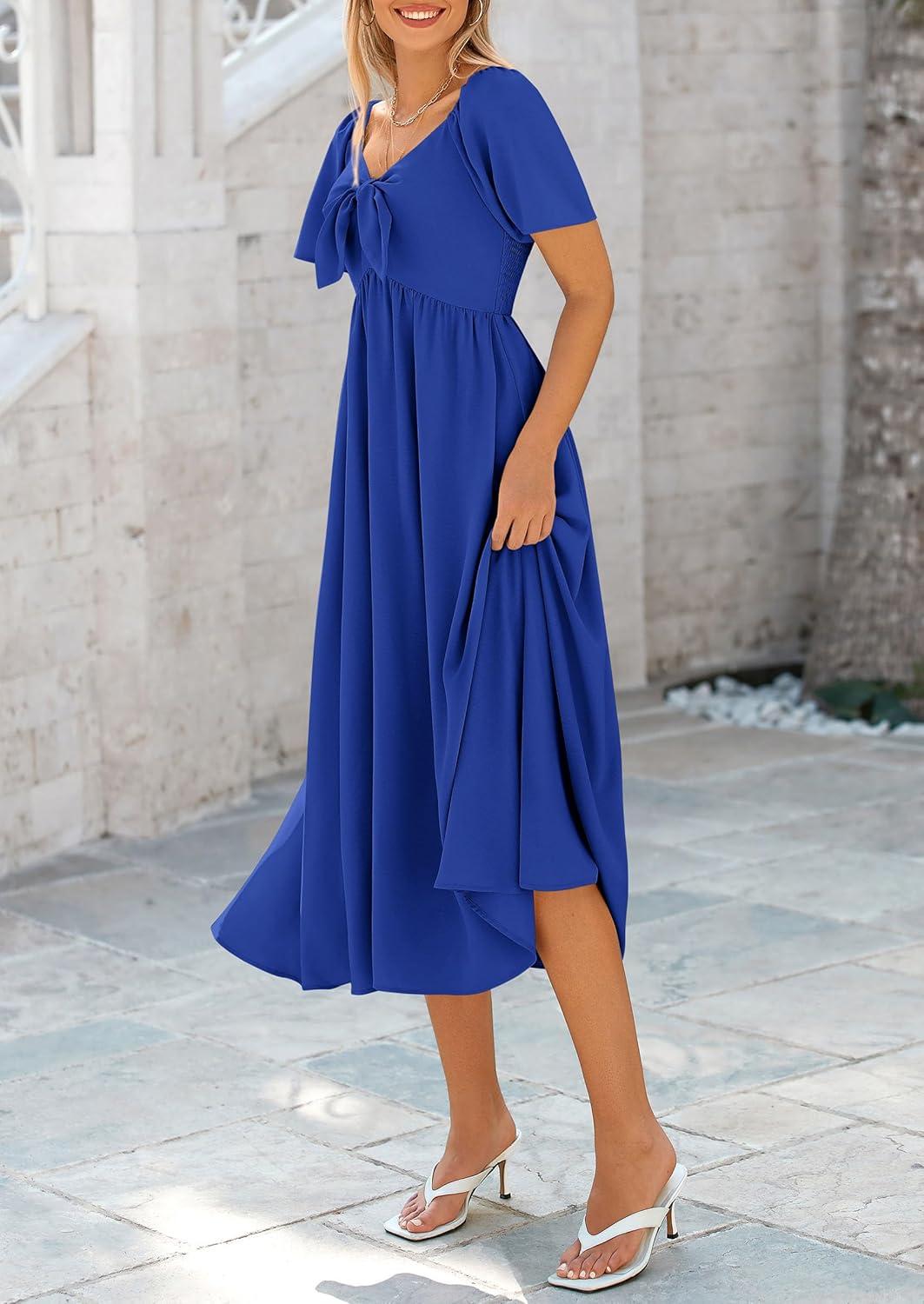 PRETTYGARDEN Summer Dress for Women 2025 Casual Short Sleeve Bow Tie V Neck Ruffle Midi Flowy Dresses(Royal Blue)