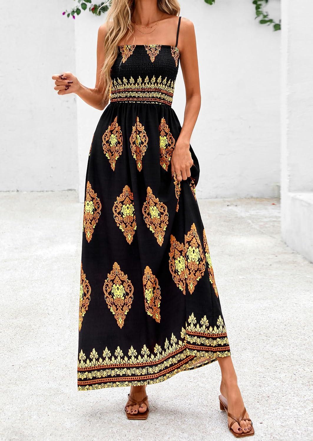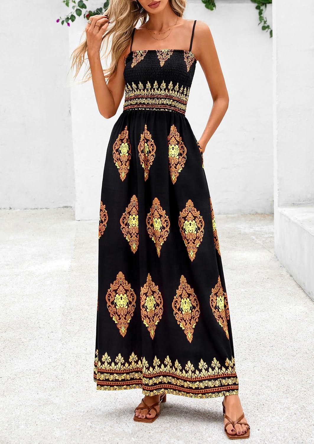 PRETTYGARDEN Summer Dress for Women 2025 Floral Sundress Spaghetti Strap Flowy Beach Vacation Boho Maxi Dresses(Black Floral)