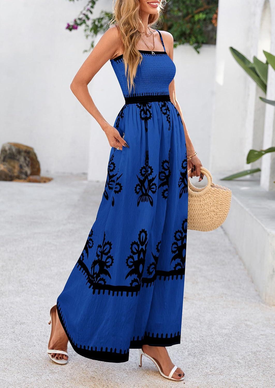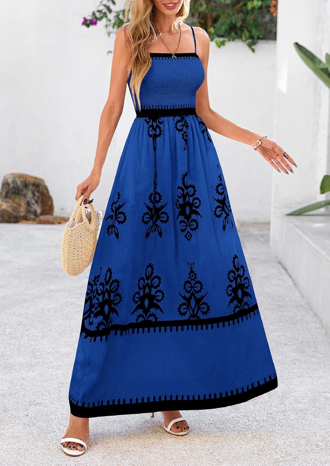 PRETTYGARDEN Summer Dress for Women 2025 Floral Sundress Spaghetti Strap Flowy Beach Vacation Boho Maxi Dresses(Blue Black Floral)