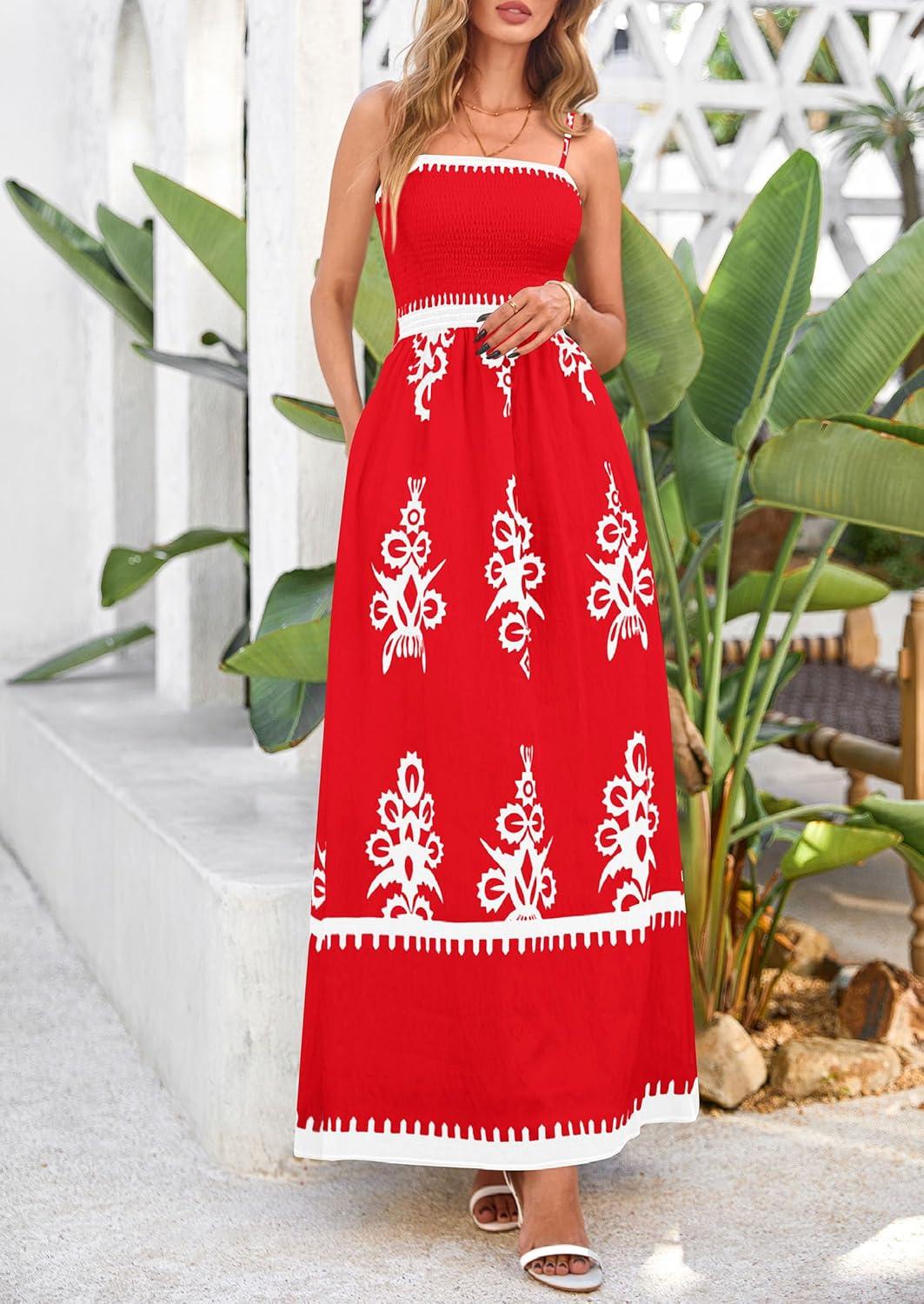 PRETTYGARDEN Summer Dress for Women 2025 Floral Sundress Spaghetti Strap Flowy Beach Vacation Boho Maxi Dresses(Red White Floral)