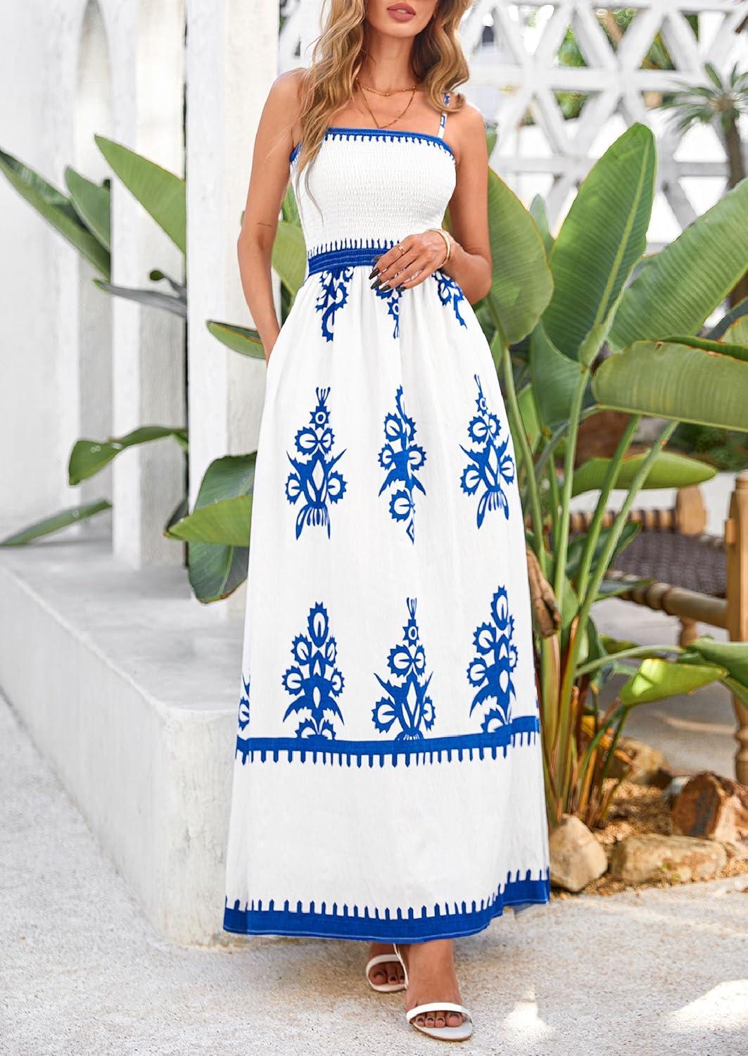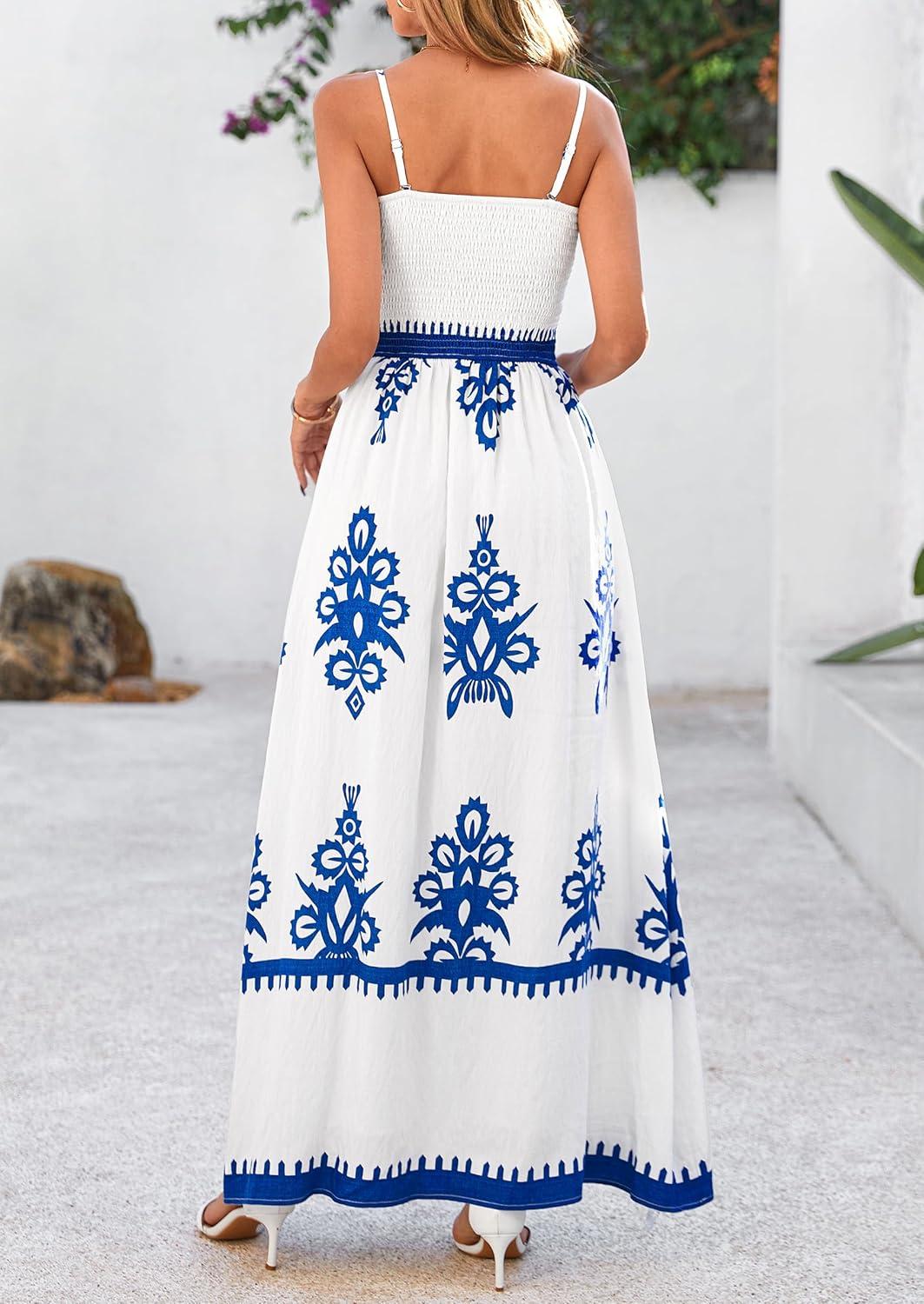 PRETTYGARDEN Summer Dress for Women 2025 Floral Sundress Spaghetti Strap Flowy Beach Vacation Boho Maxi Dresses(White Blue Floral)