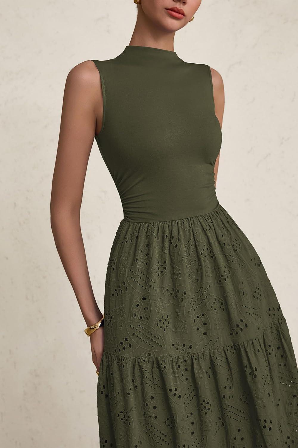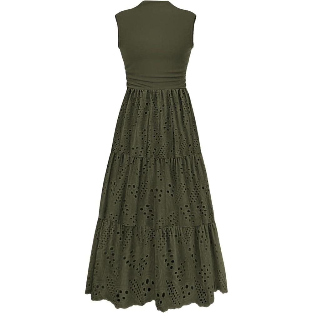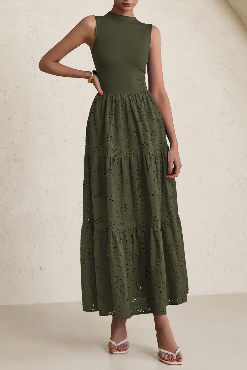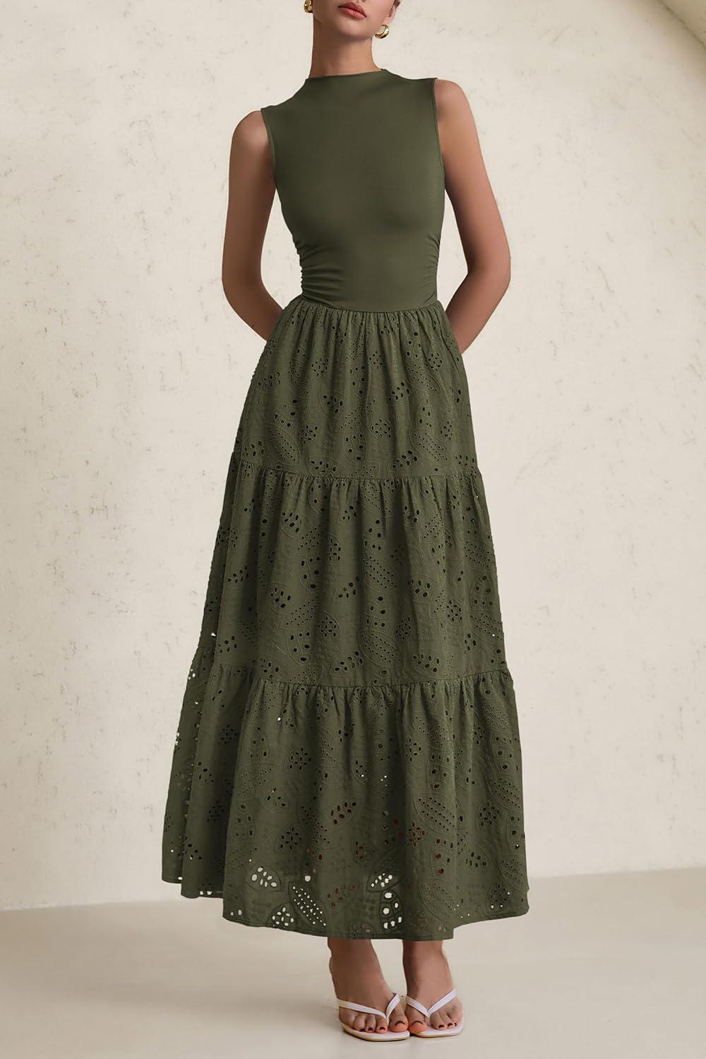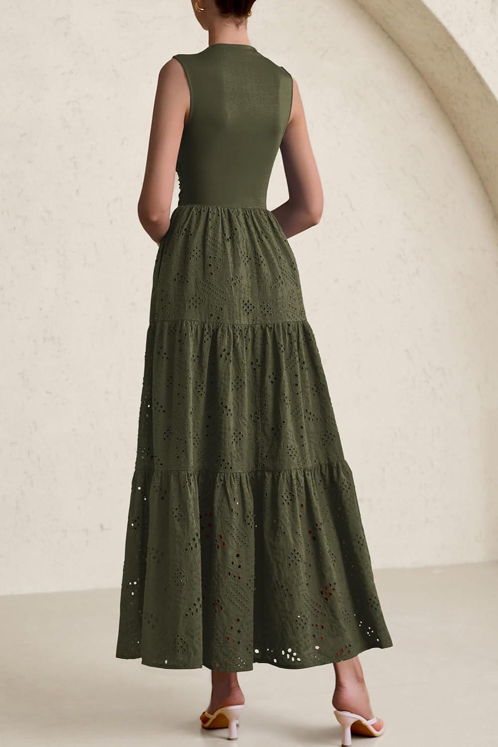 PRETTYGARDEN Summer Dresses for Women 2025 Casual Eyelet Sleeveless Wedding Guest Maxi Dress Tank Top Sundress with Pockets(Army Green)