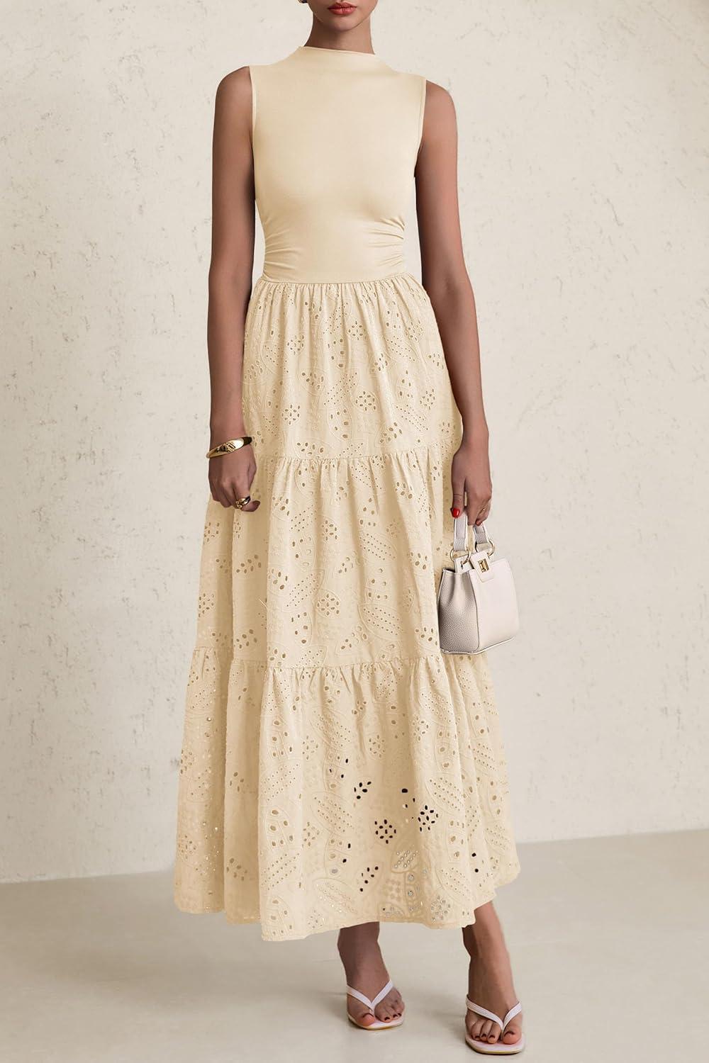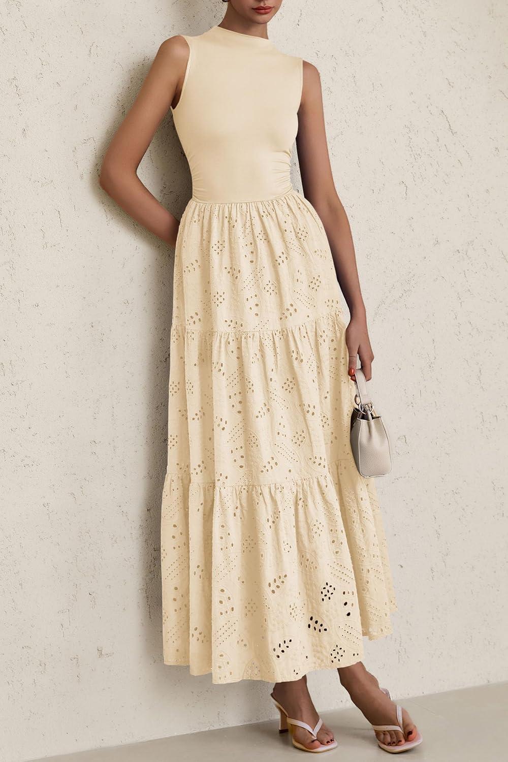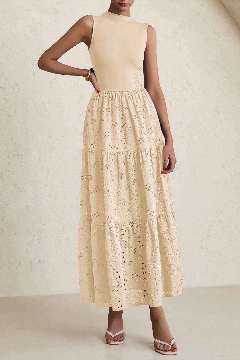 PRETTYGARDEN Summer Dresses for Women 2025 Casual Eyelet Sleeveless Wedding Guest Maxi Dress Tank Top Sundress with Pockets(Beige)