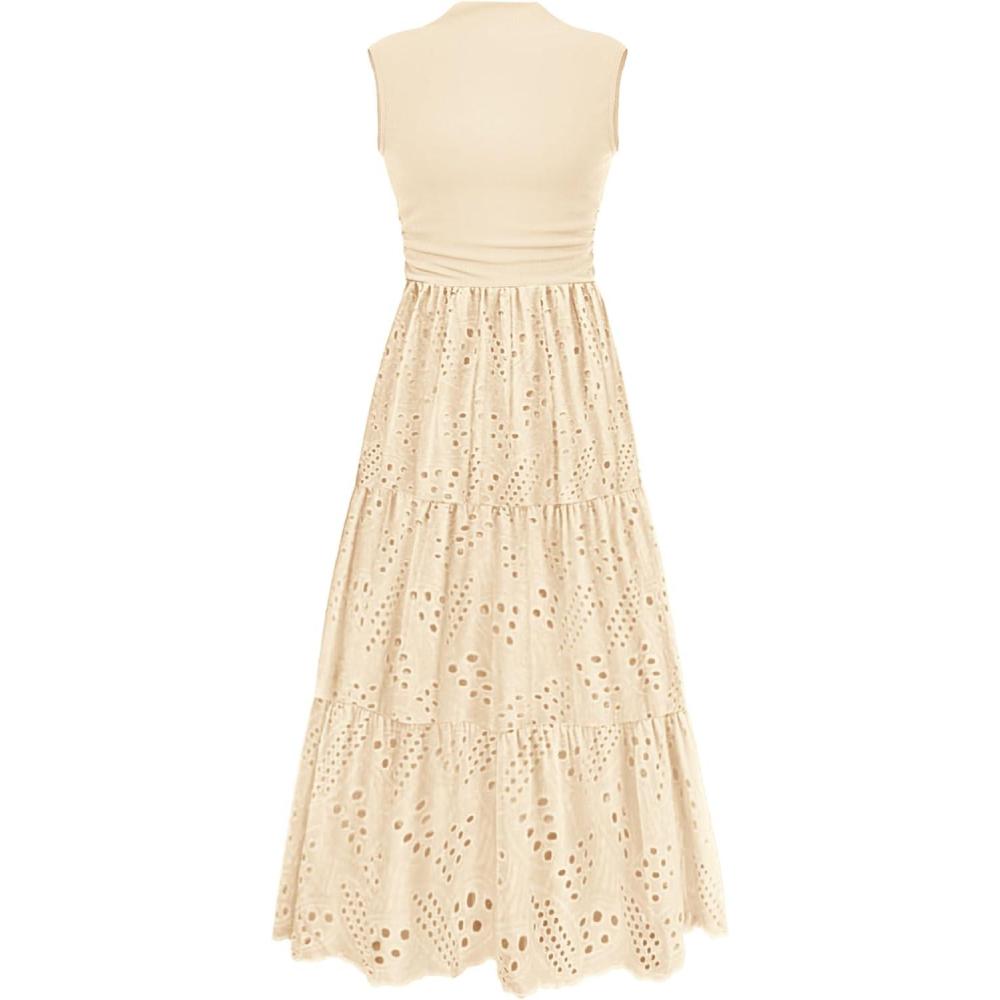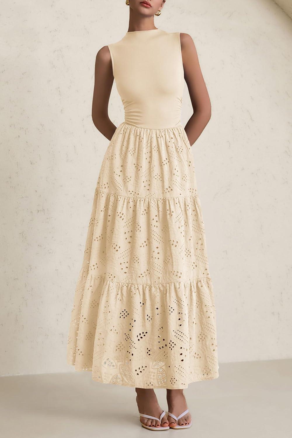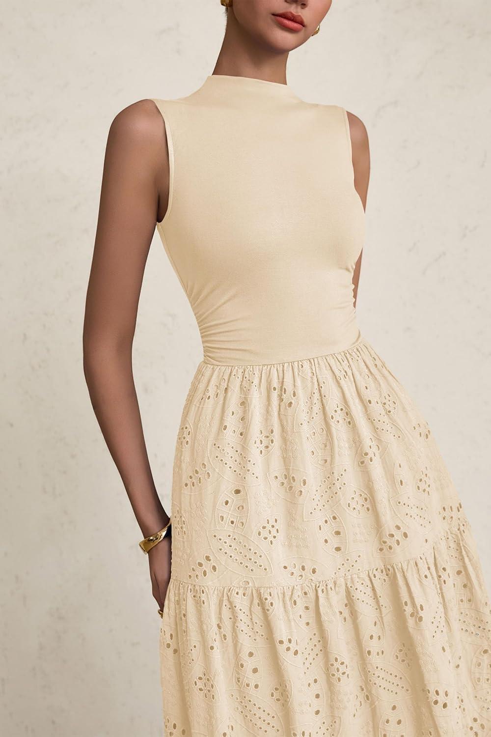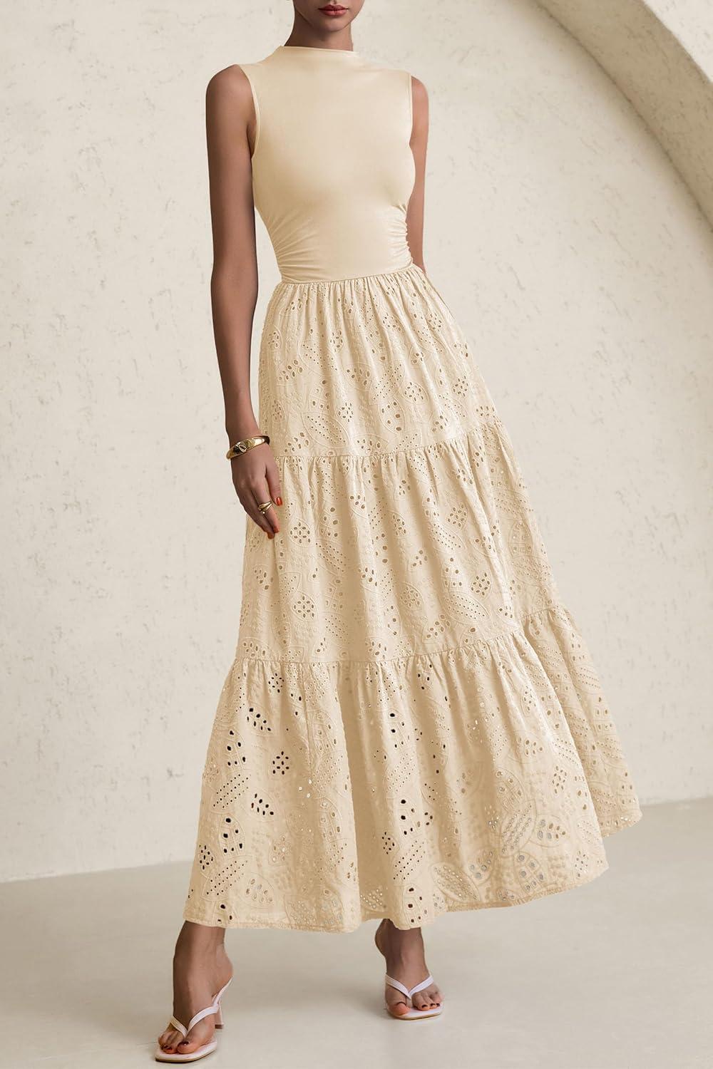 PRETTYGARDEN Summer Dresses for Women 2025 Casual Eyelet Sleeveless Wedding Guest Maxi Dress Tank Top Sundress with Pockets(Beige)