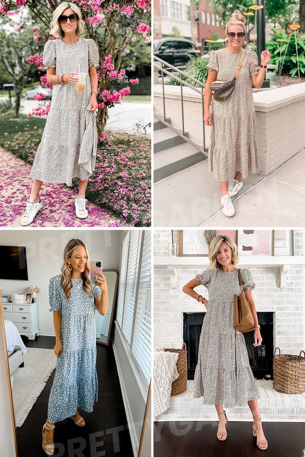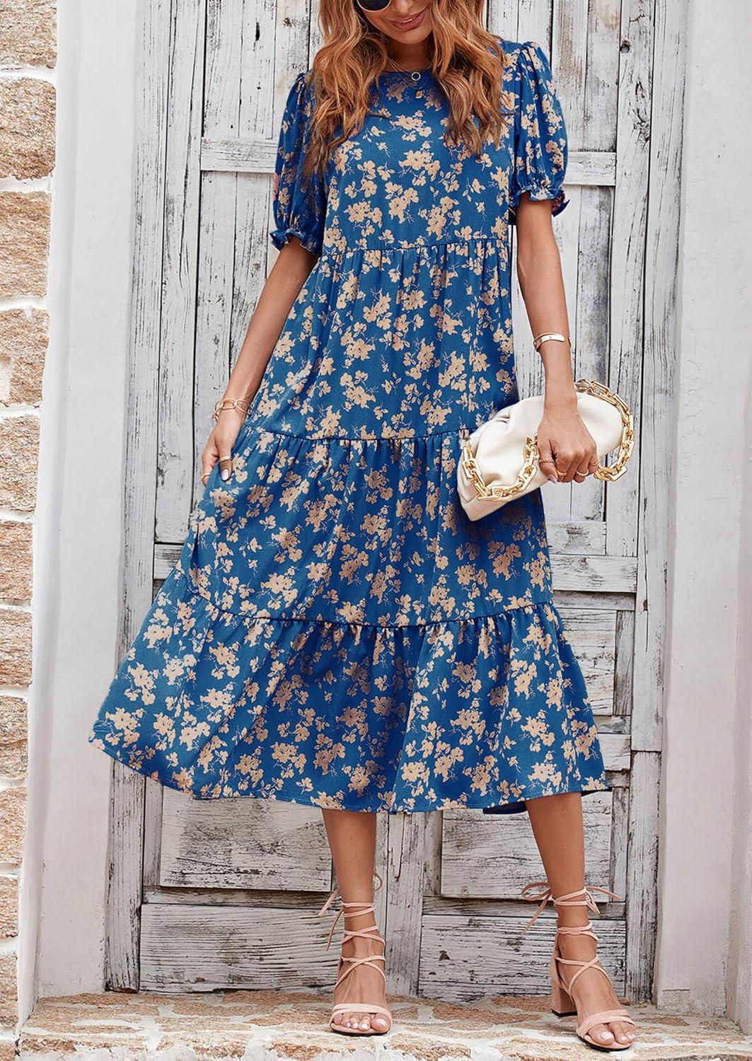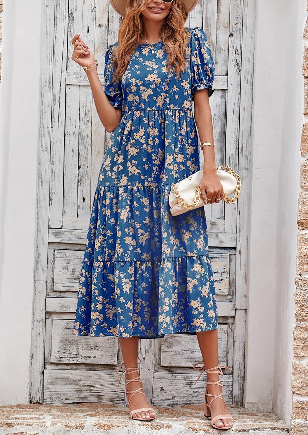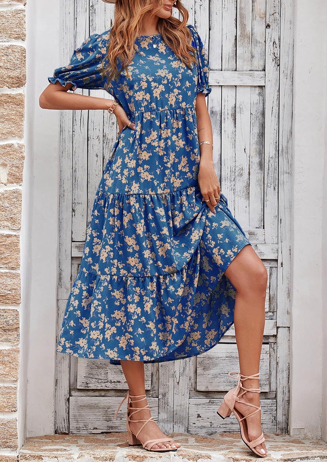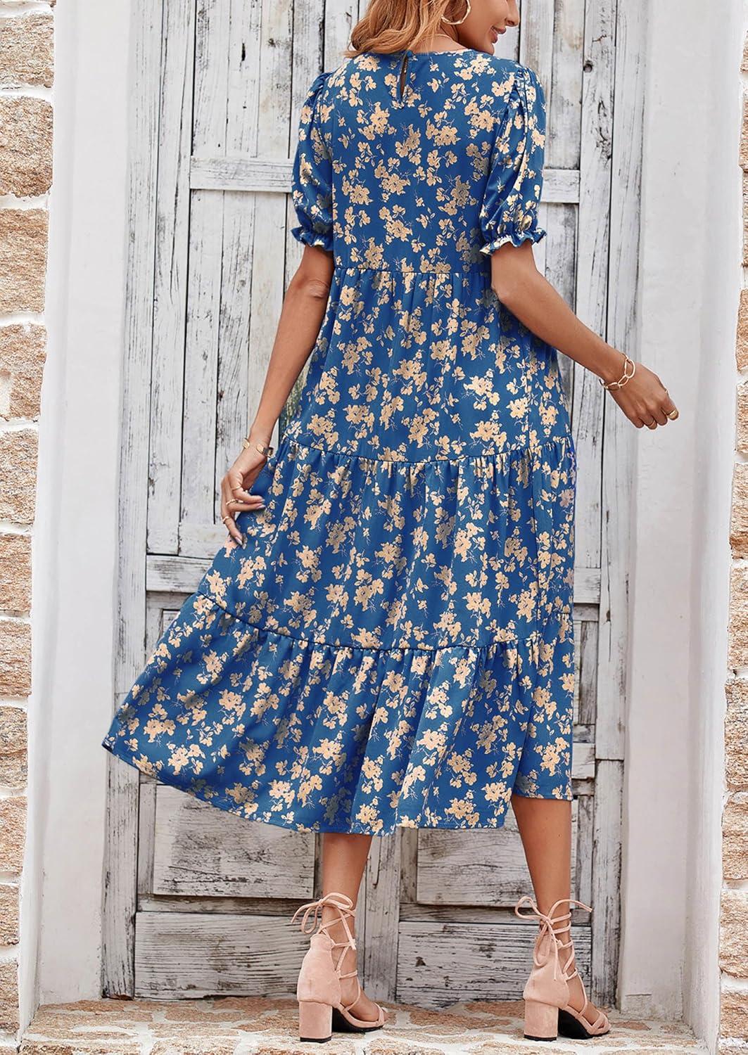 PRETTYGARDEN Summer Dresses for Women 2025 Casual Floral Boho Midi Sun Dress Puff Short Sleeve Flowy Beach Vacation Sundress(Blue)