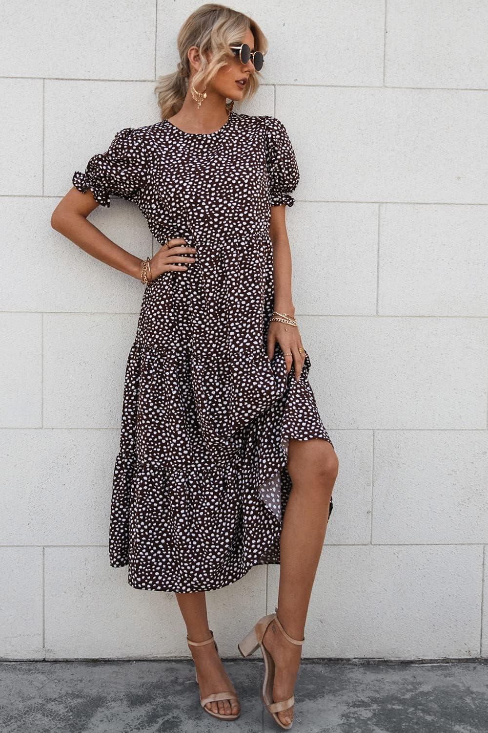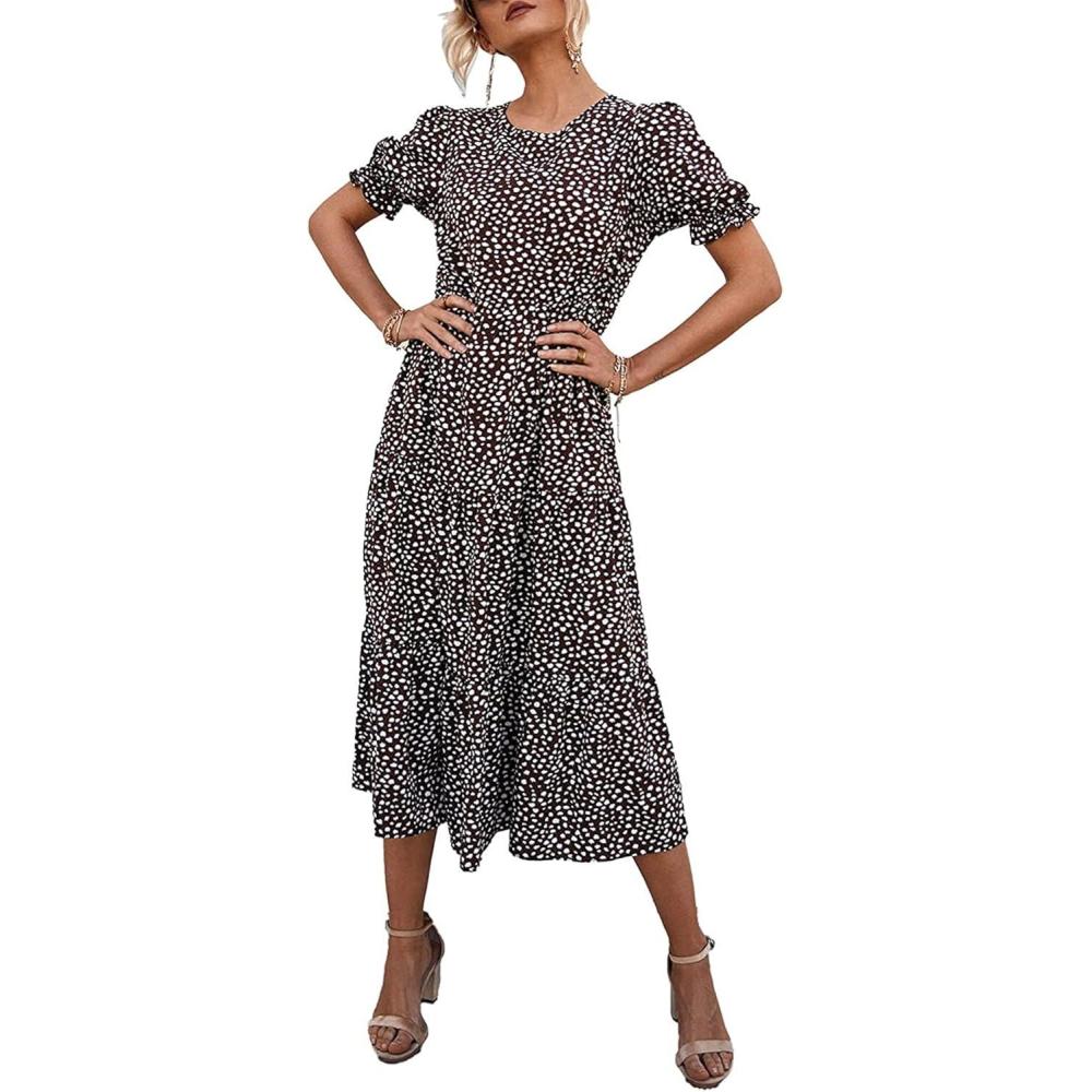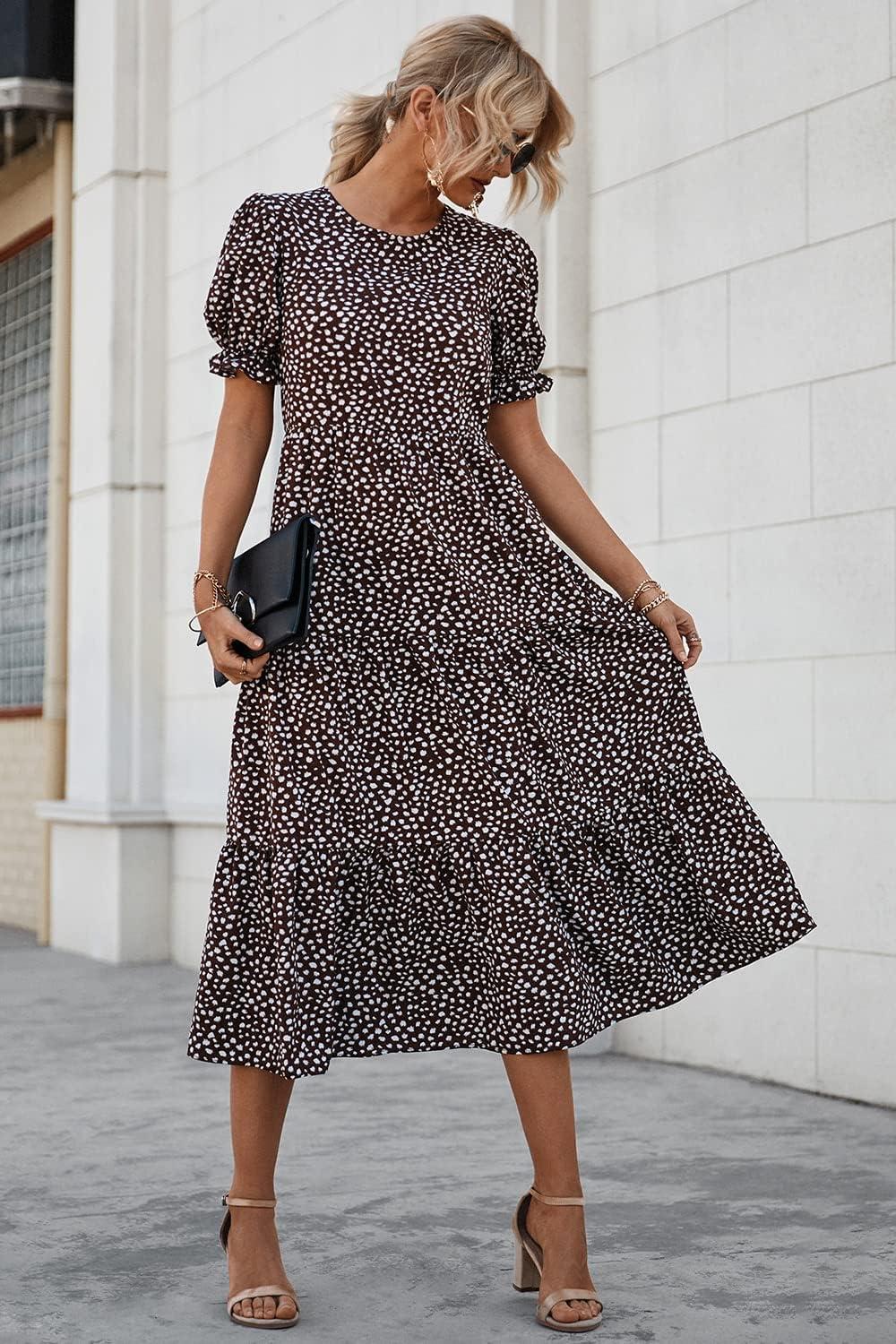 PRETTYGARDEN Summer Dresses for Women 2025 Casual Floral Boho Midi Sun Dress Puff Short Sleeve Flowy Beach Vacation Sundress(Coffee)