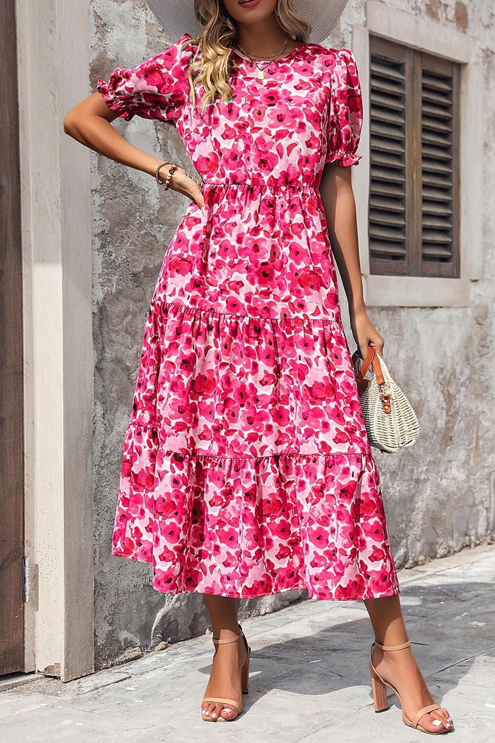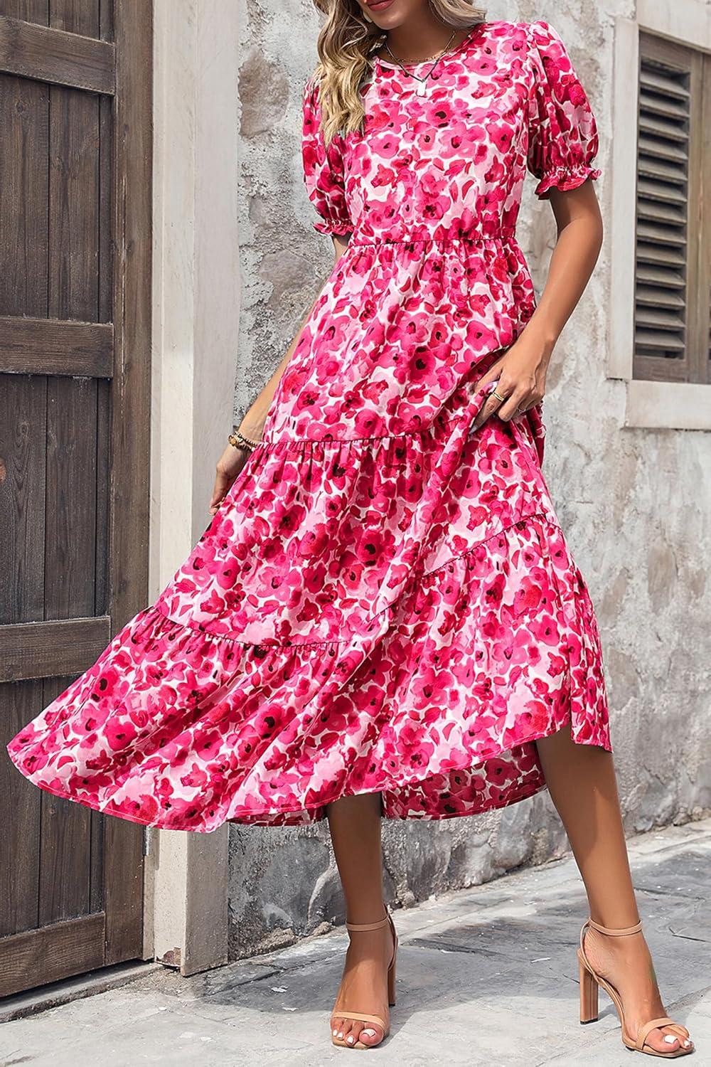 PRETTYGARDEN Summer Dresses for Women 2025 Casual Floral Boho Midi Sun Dress Puff Short Sleeve Flowy Beach Vacation Sundress(Floral Rose Red)