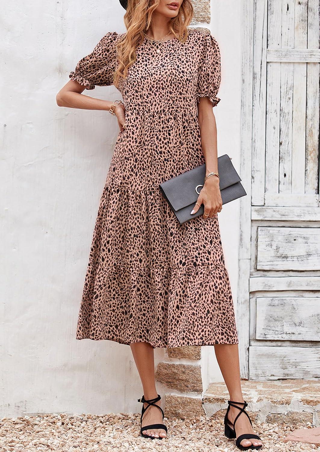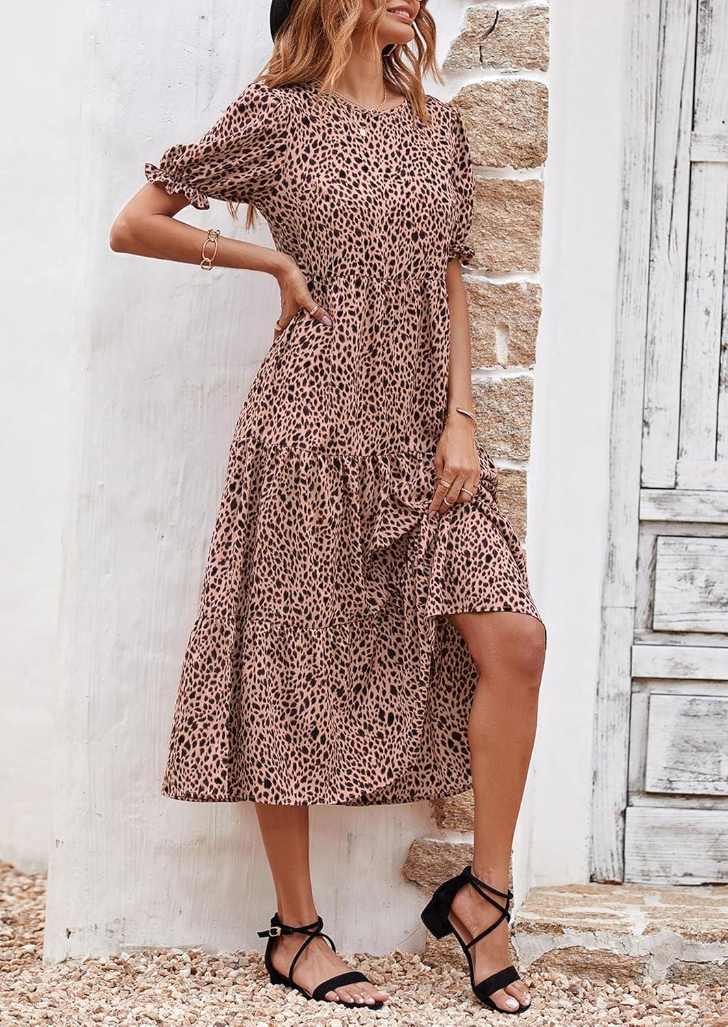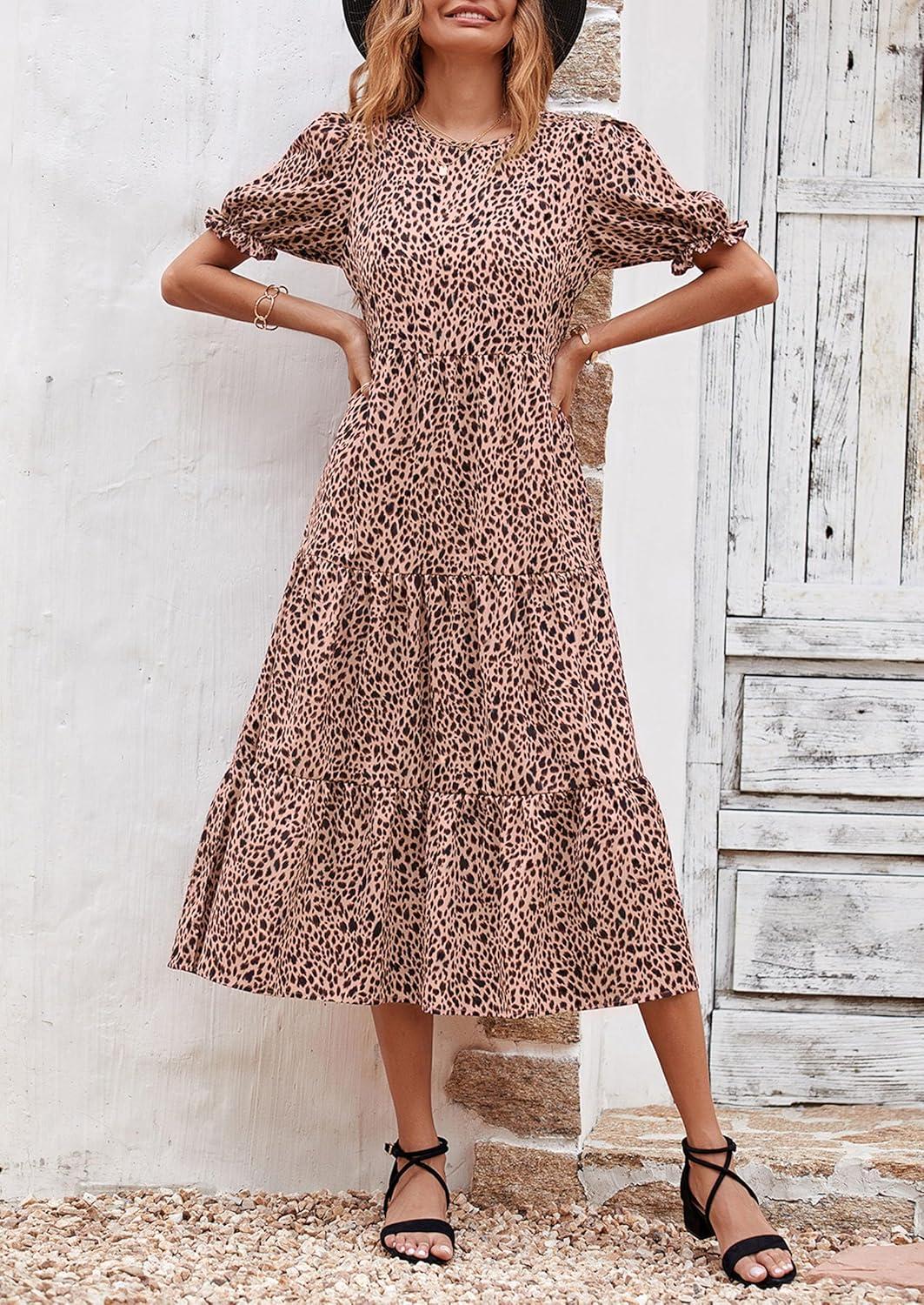 PRETTYGARDEN Summer Dresses for Women 2025 Casual Floral Boho Midi Sun Dress Puff Short Sleeve Flowy Beach Vacation Sundress(Khaki Black Leopard)