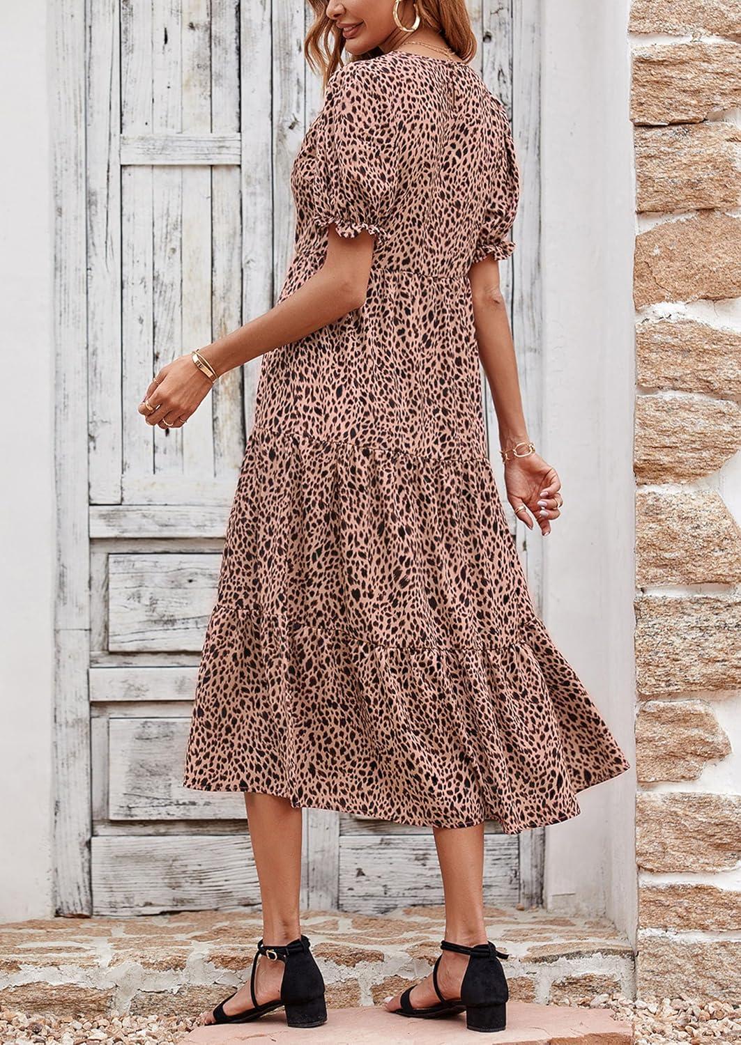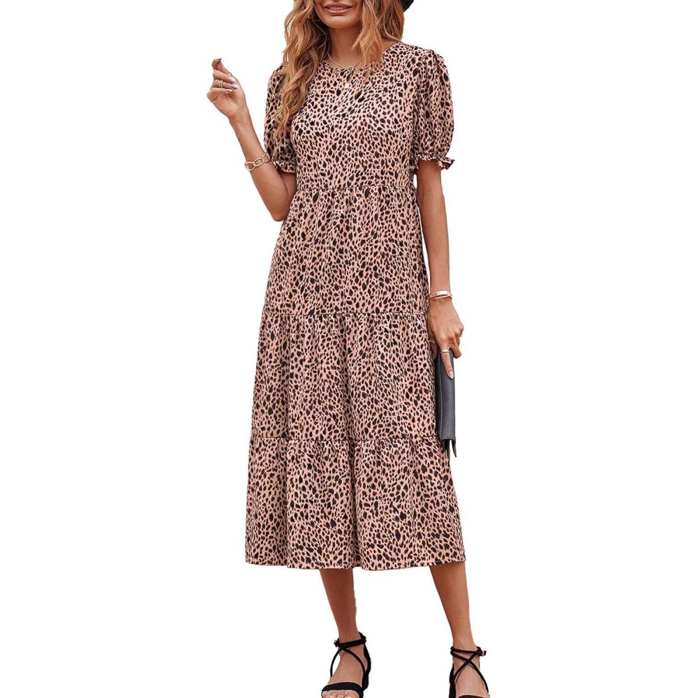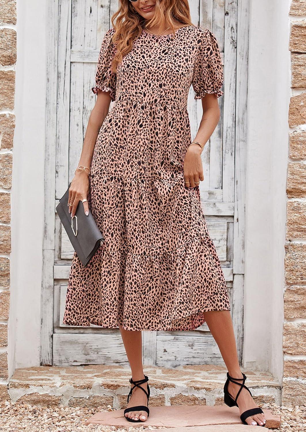 PRETTYGARDEN Summer Dresses for Women 2025 Casual Floral Boho Midi Sun Dress Puff Short Sleeve Flowy Beach Vacation Sundress(Khaki Black Leopard)
