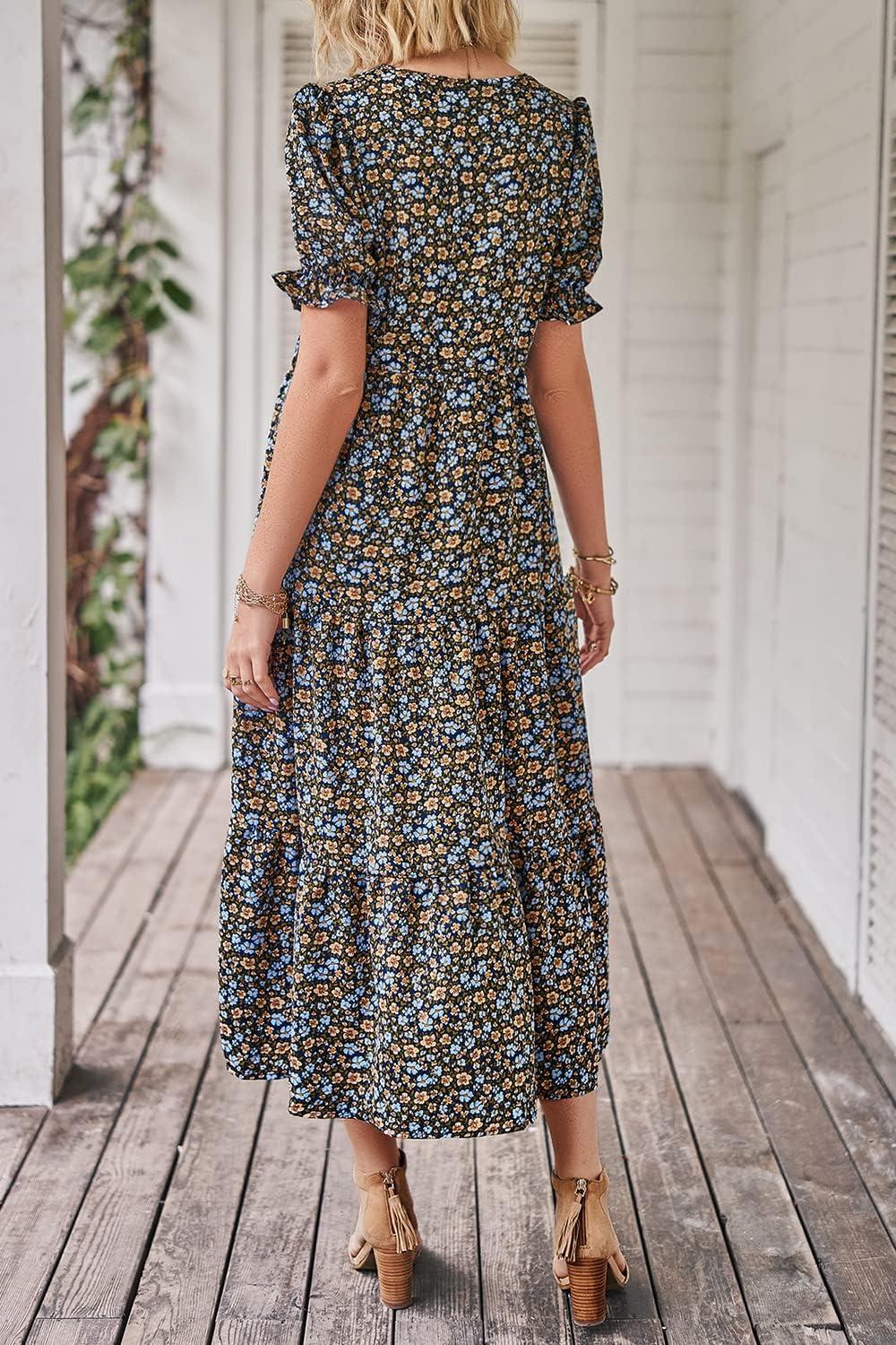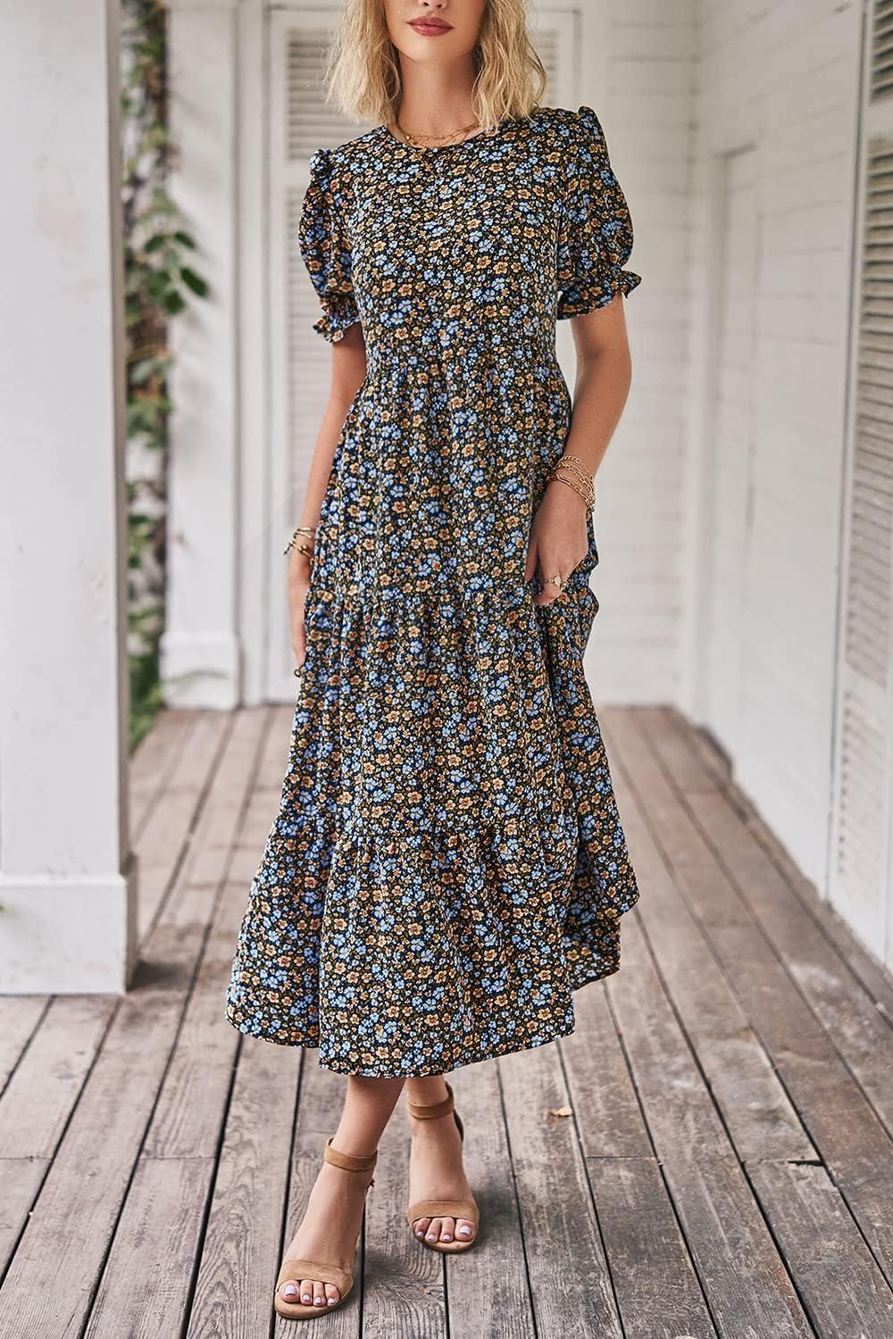 PRETTYGARDEN Summer Dresses for Women 2025 Casual Floral Boho Midi Sun Dress Puff Short Sleeve Flowy Beach Vacation Sundress(Navy Floral)