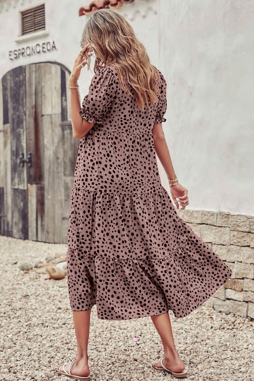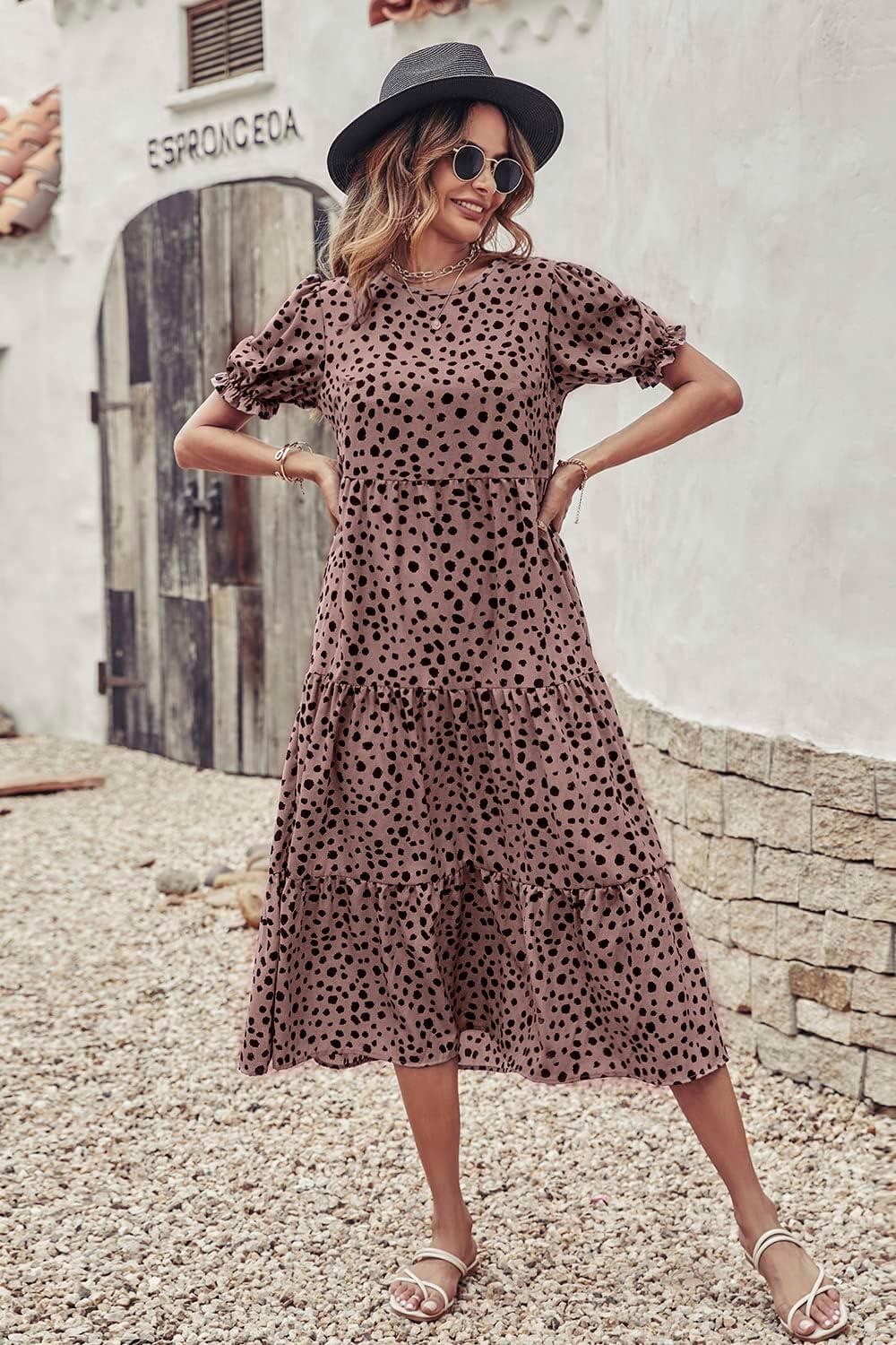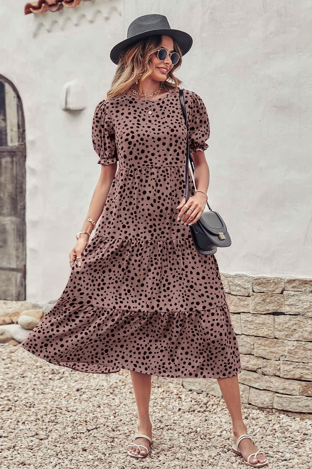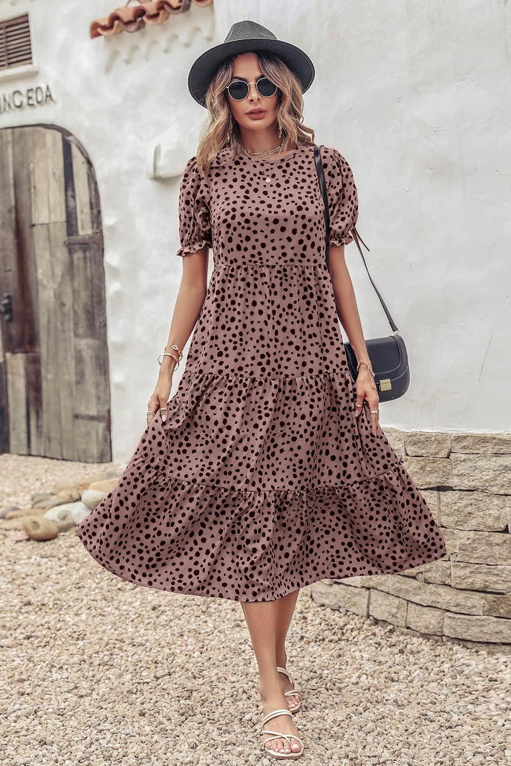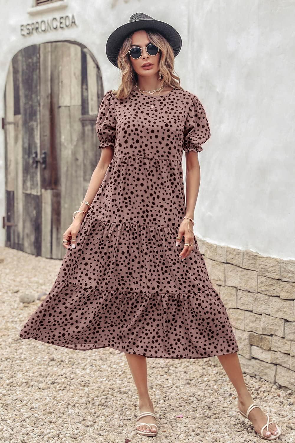 PRETTYGARDEN Summer Dresses for Women 2025 Casual Floral Boho Midi Sun Dress Puff Short Sleeve Flowy Beach Vacation Sundress(Polk Black)
