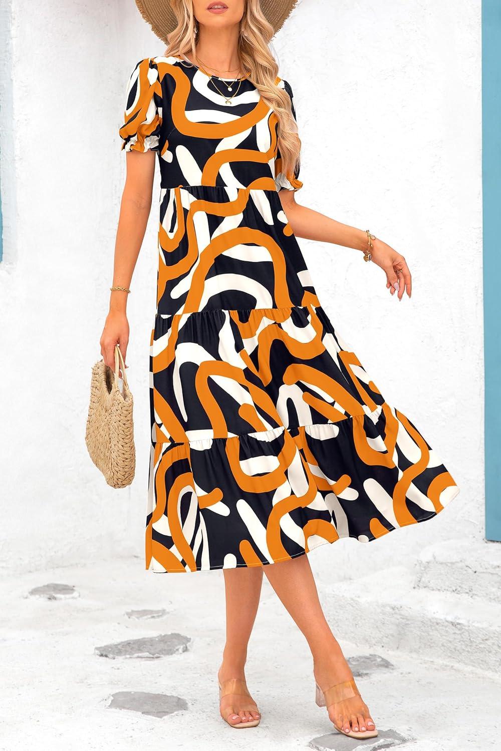 PRETTYGARDEN Summer Dresses for Women 2025 Casual Floral Boho Midi Sun Dress Puff Short Sleeve Flowy Beach Vacation Sundress(Print Red)