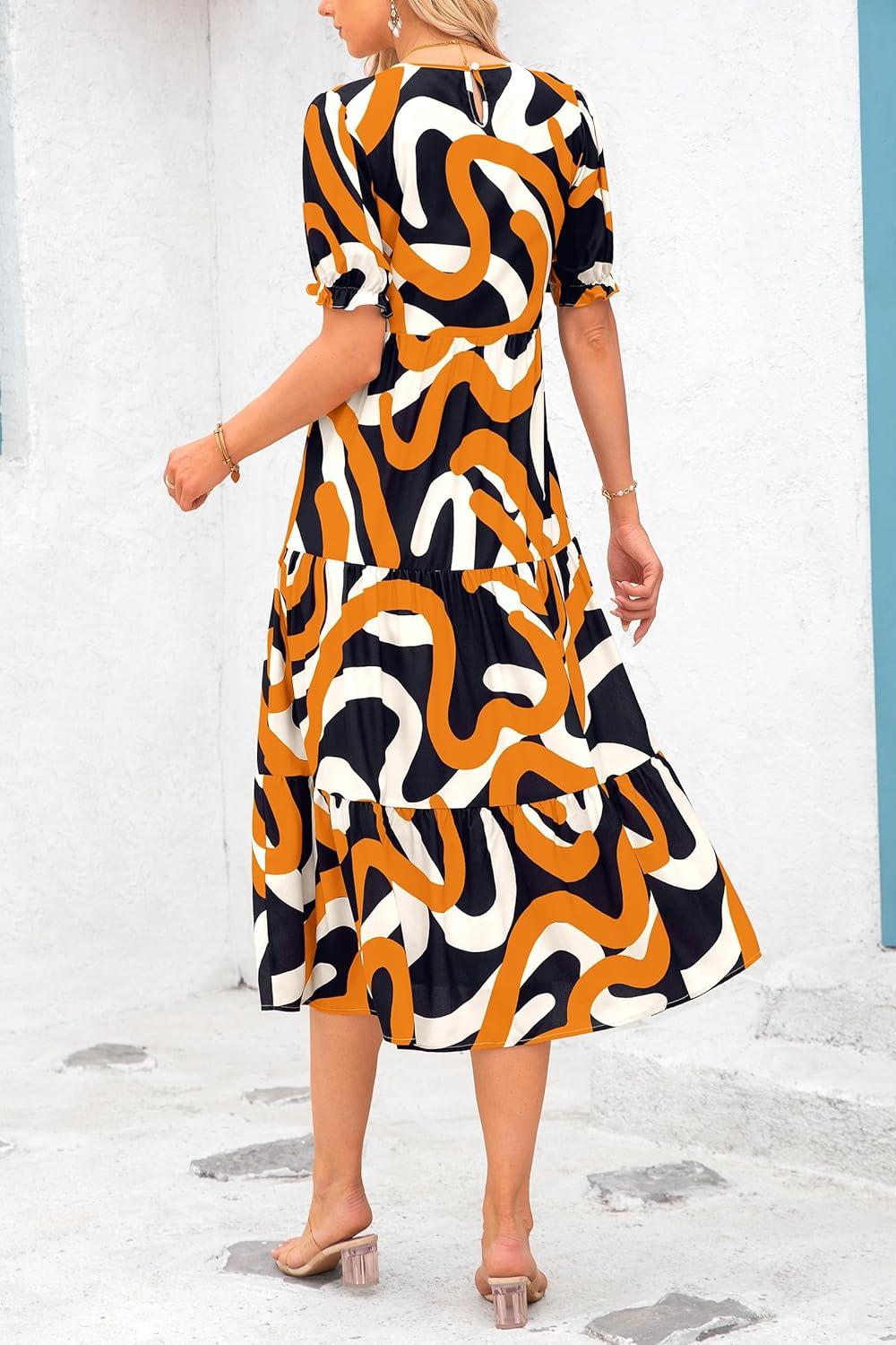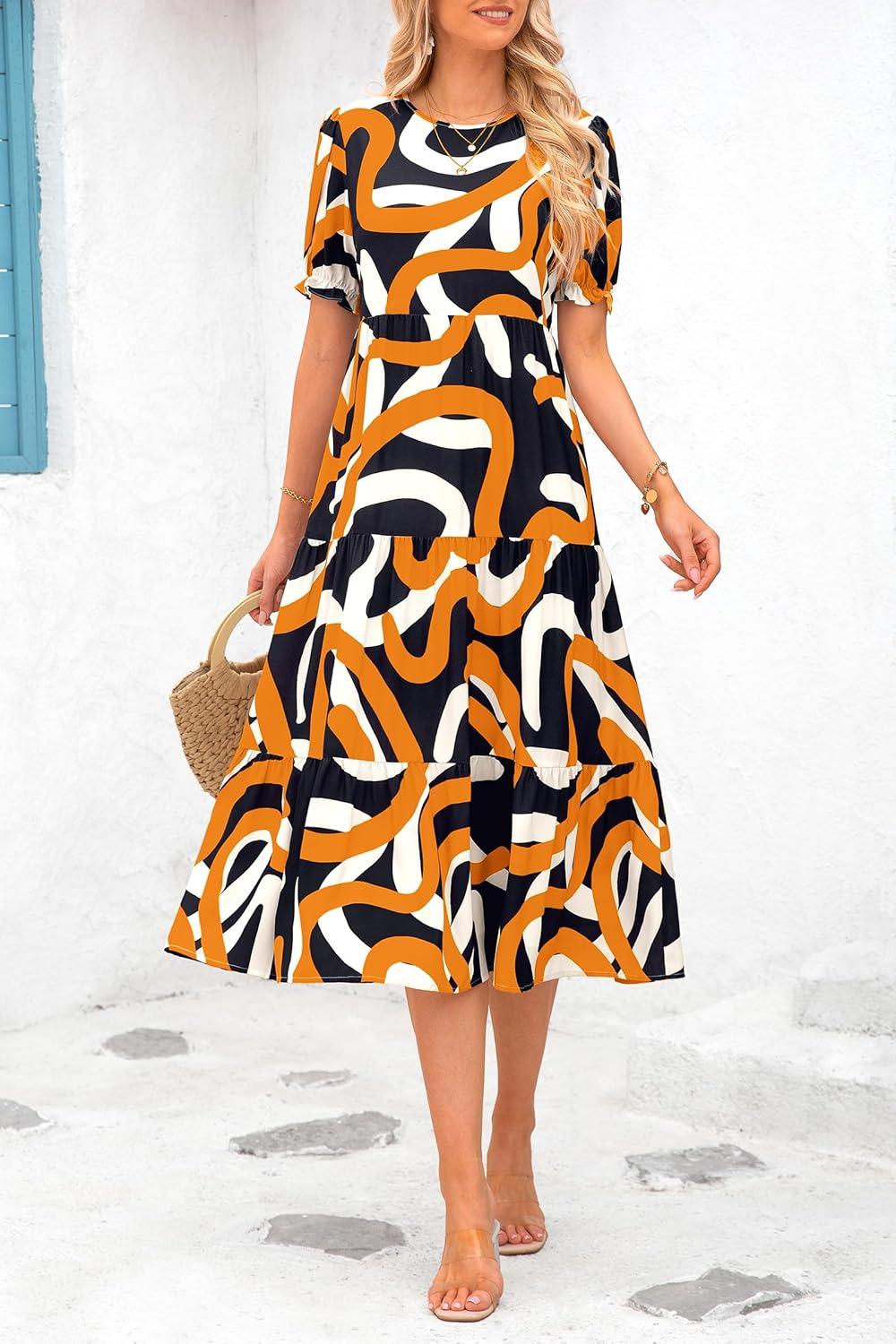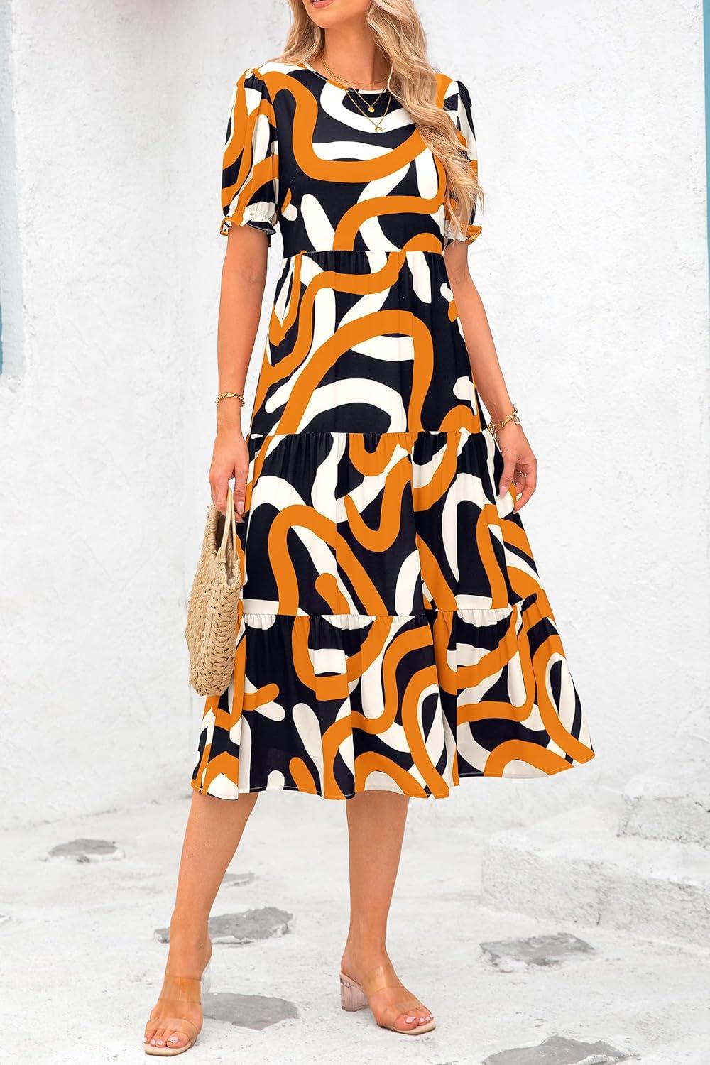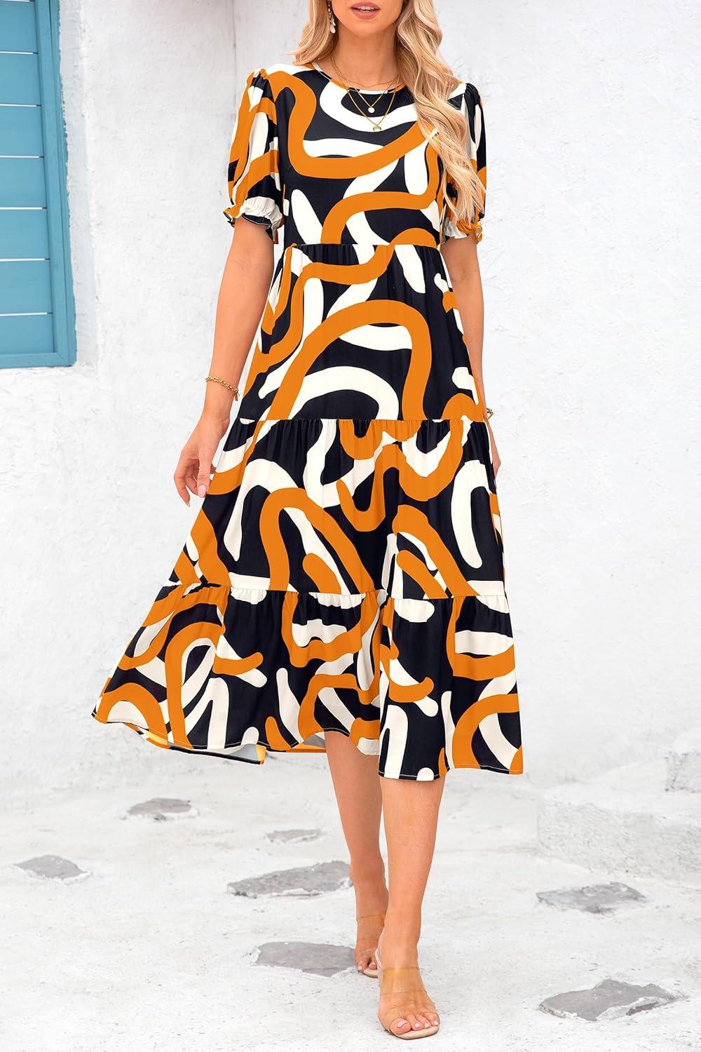 PRETTYGARDEN Summer Dresses for Women 2025 Casual Floral Boho Midi Sun Dress Puff Short Sleeve Flowy Beach Vacation Sundress(Print Yellow White)