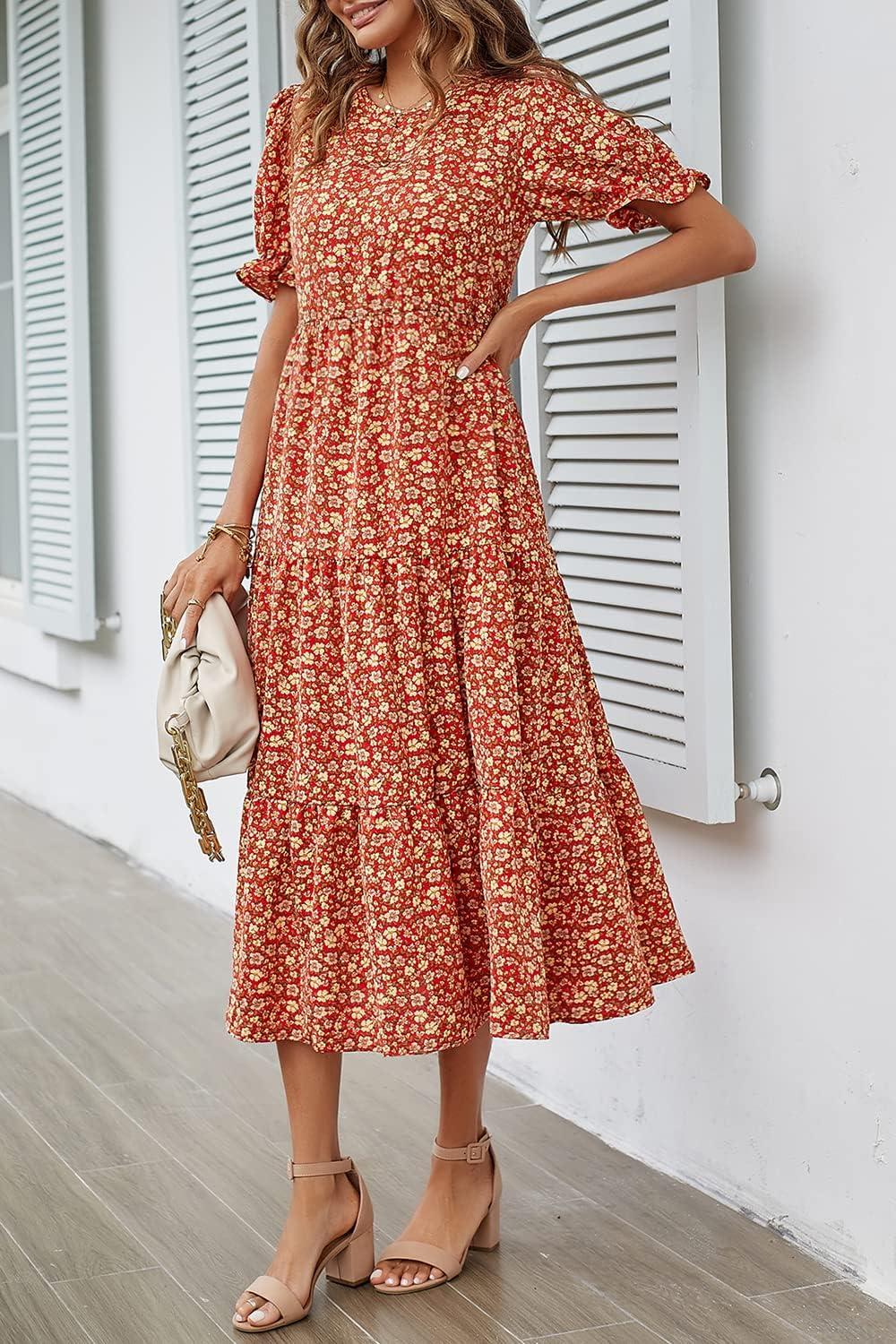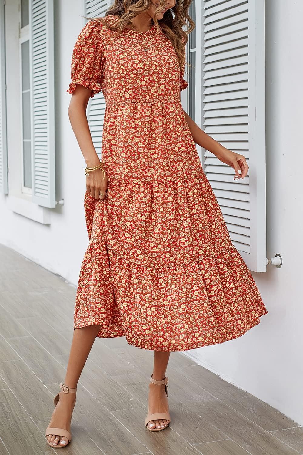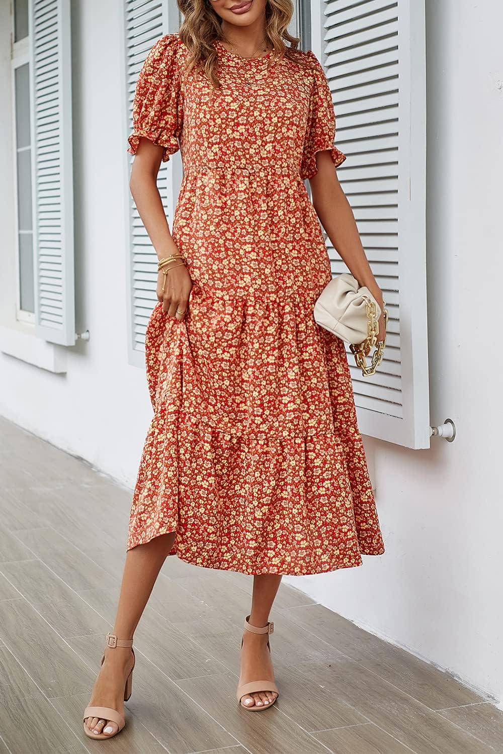 PRETTYGARDEN Summer Dresses for Women 2025 Casual Floral Boho Midi Sun Dress Puff Short Sleeve Flowy Beach Vacation Sundress(Red Orange Floral)