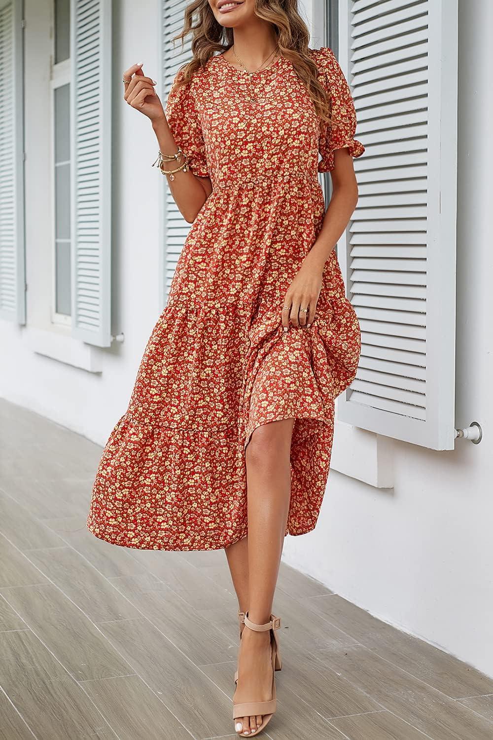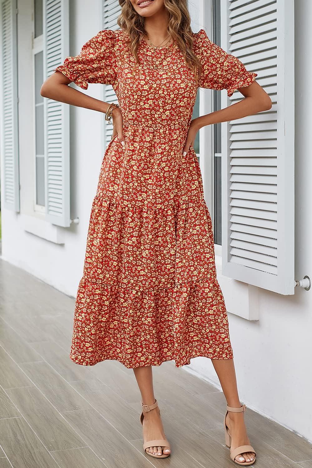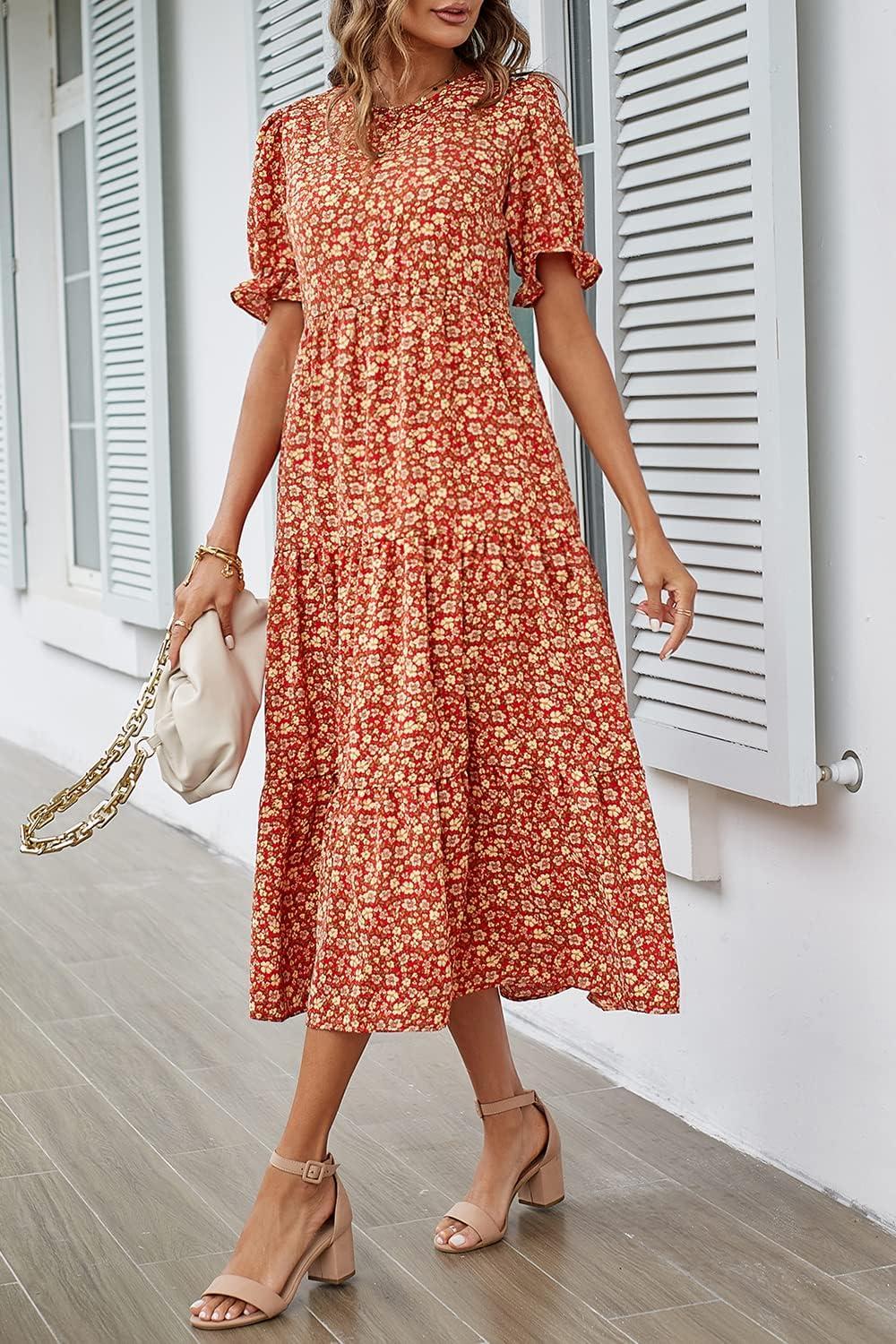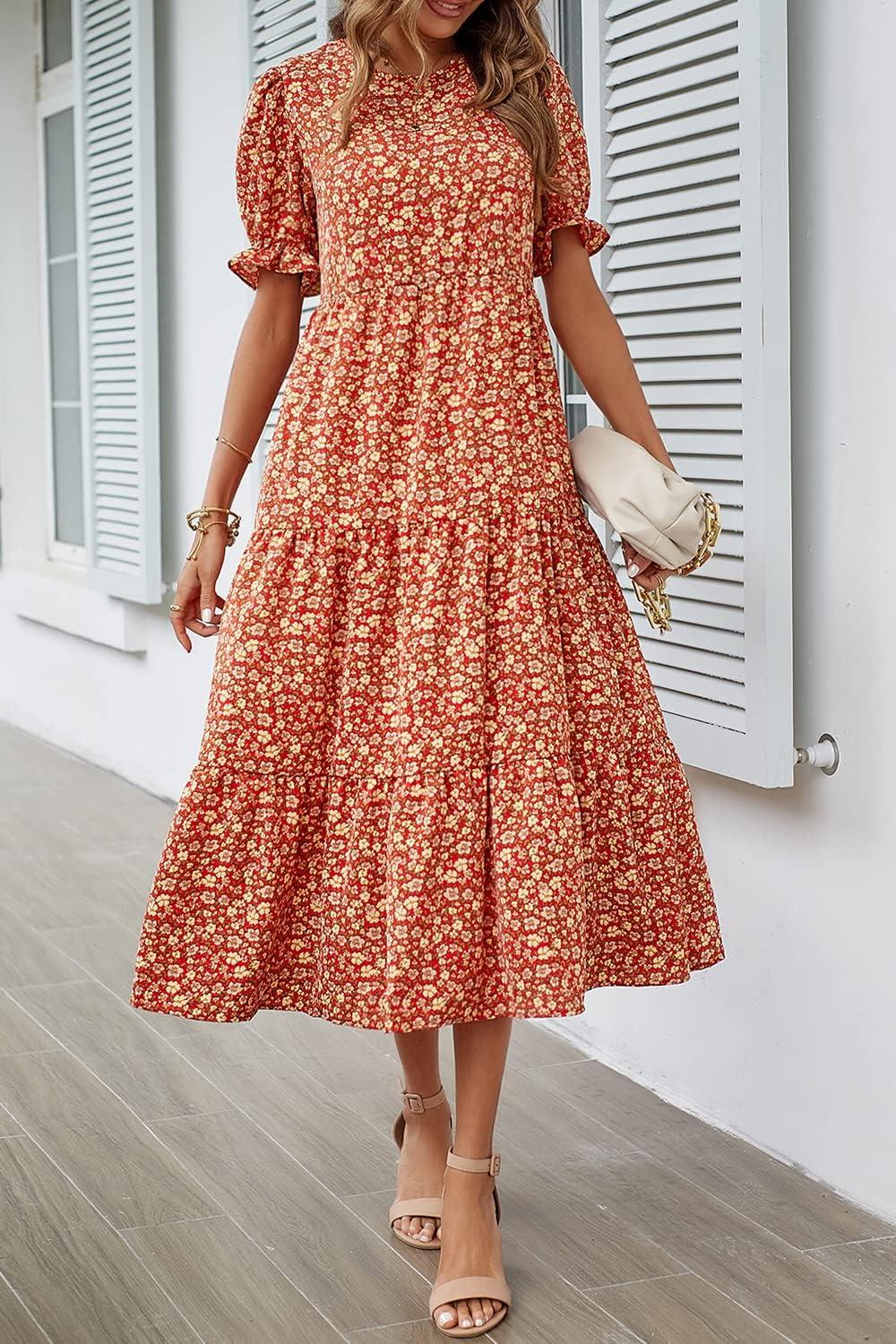 PRETTYGARDEN Summer Dresses for Women 2025 Casual Floral Boho Midi Sun Dress Puff Short Sleeve Flowy Beach Vacation Sundress(Red Orange Floral)