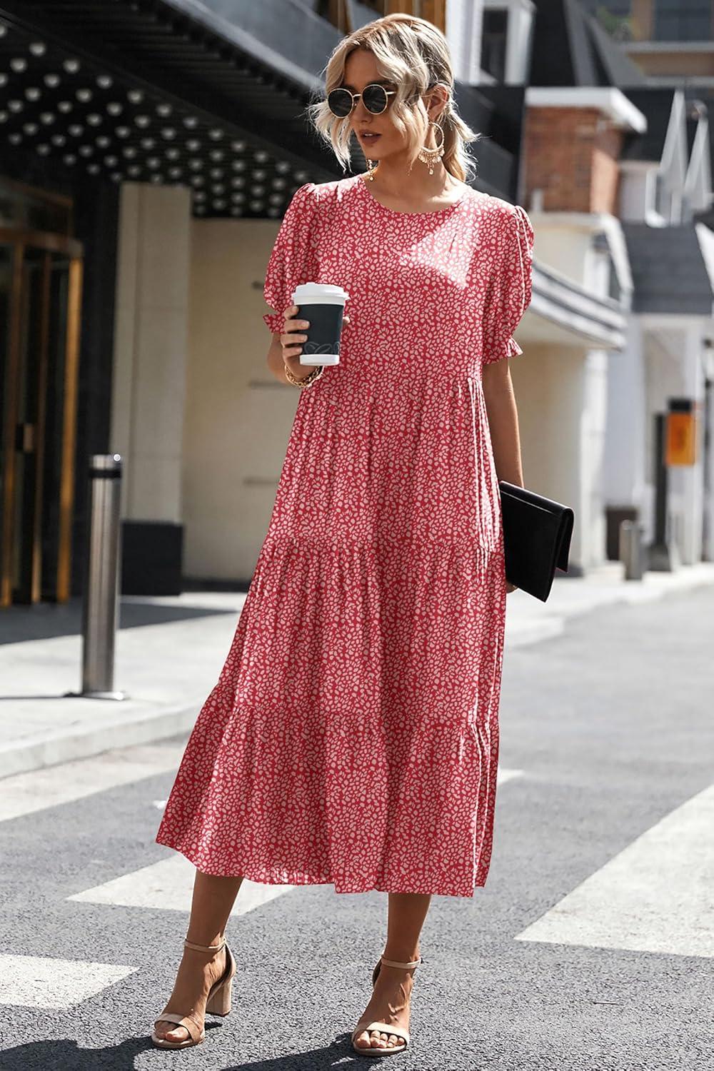 PRETTYGARDEN Summer Dresses for Women 2025 Casual Floral Boho Midi Sun Dress Puff Short Sleeve Flowy Beach Vacation Sundress(Red Block)