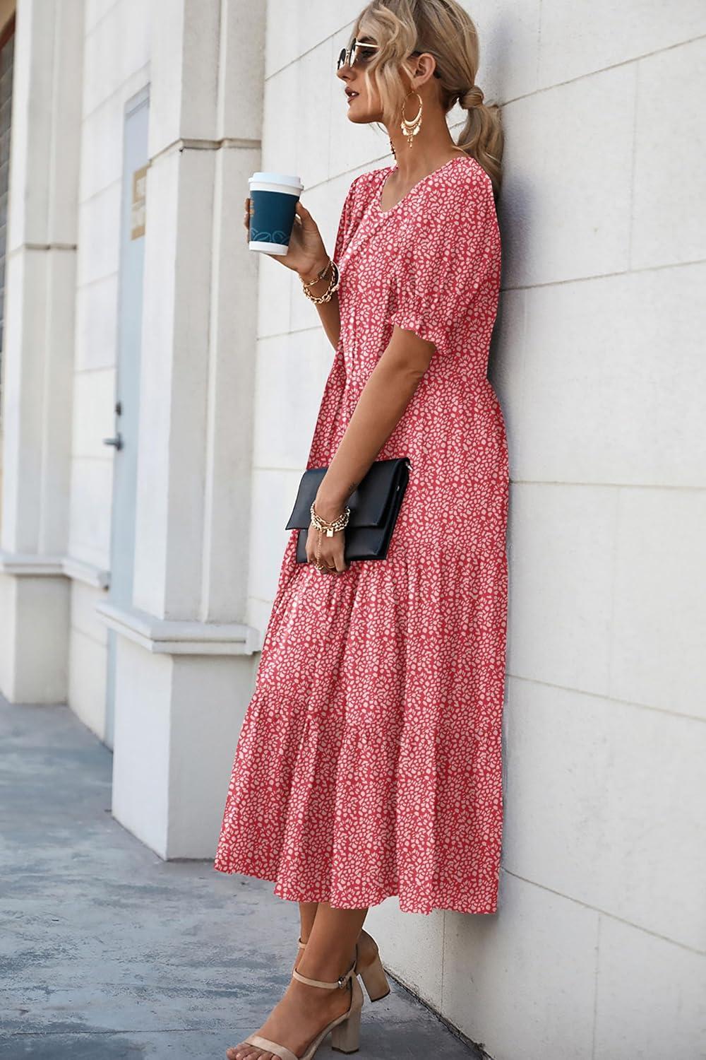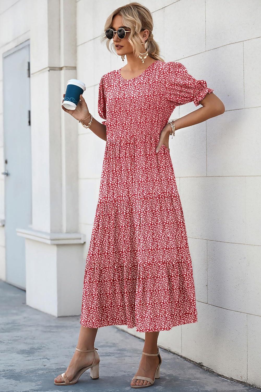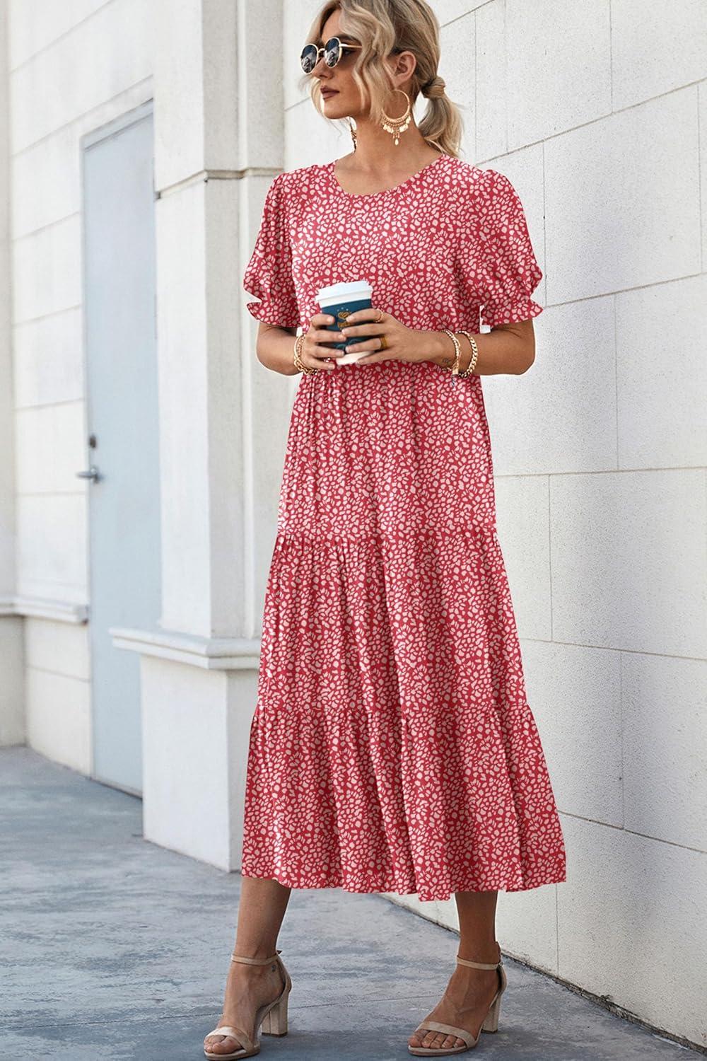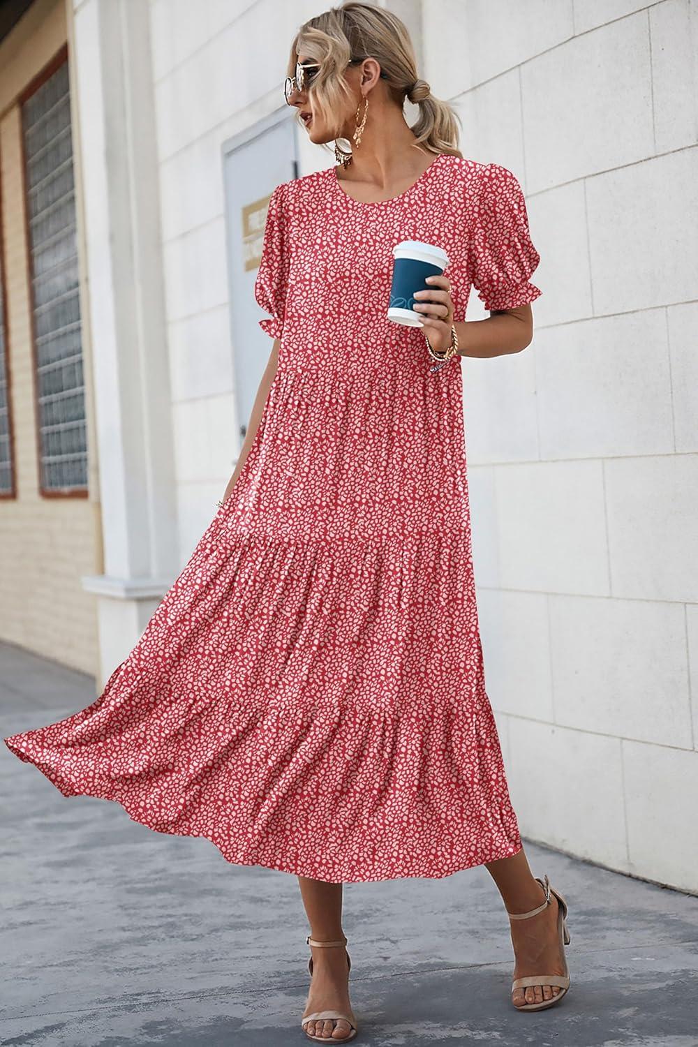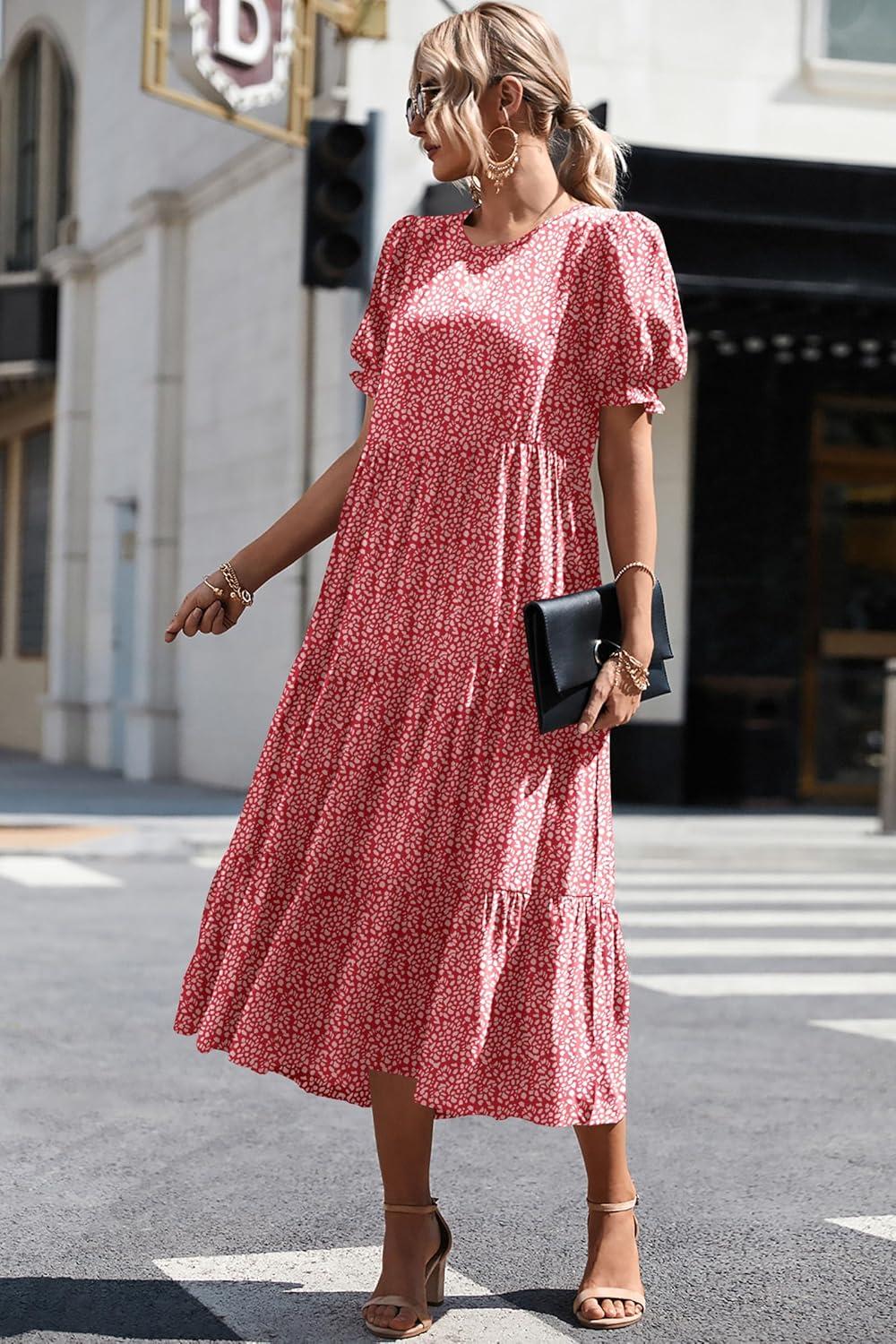 PRETTYGARDEN Summer Dresses for Women 2025 Casual Floral Boho Midi Sun Dress Puff Short Sleeve Flowy Beach Vacation Sundress(Red)