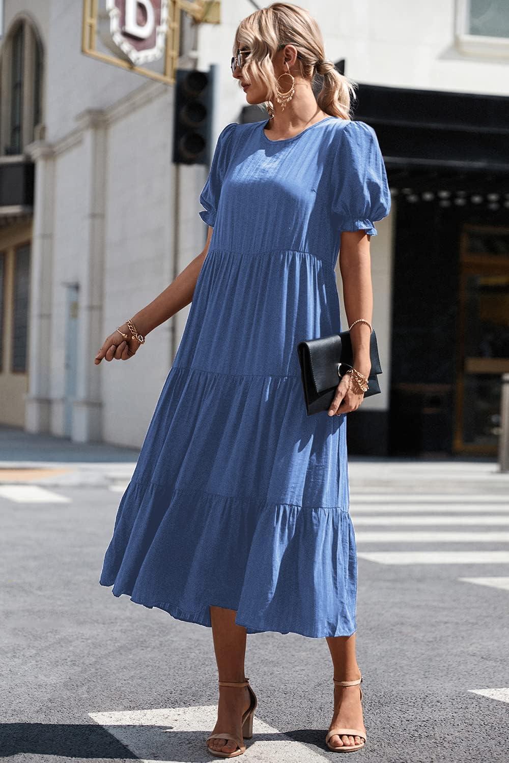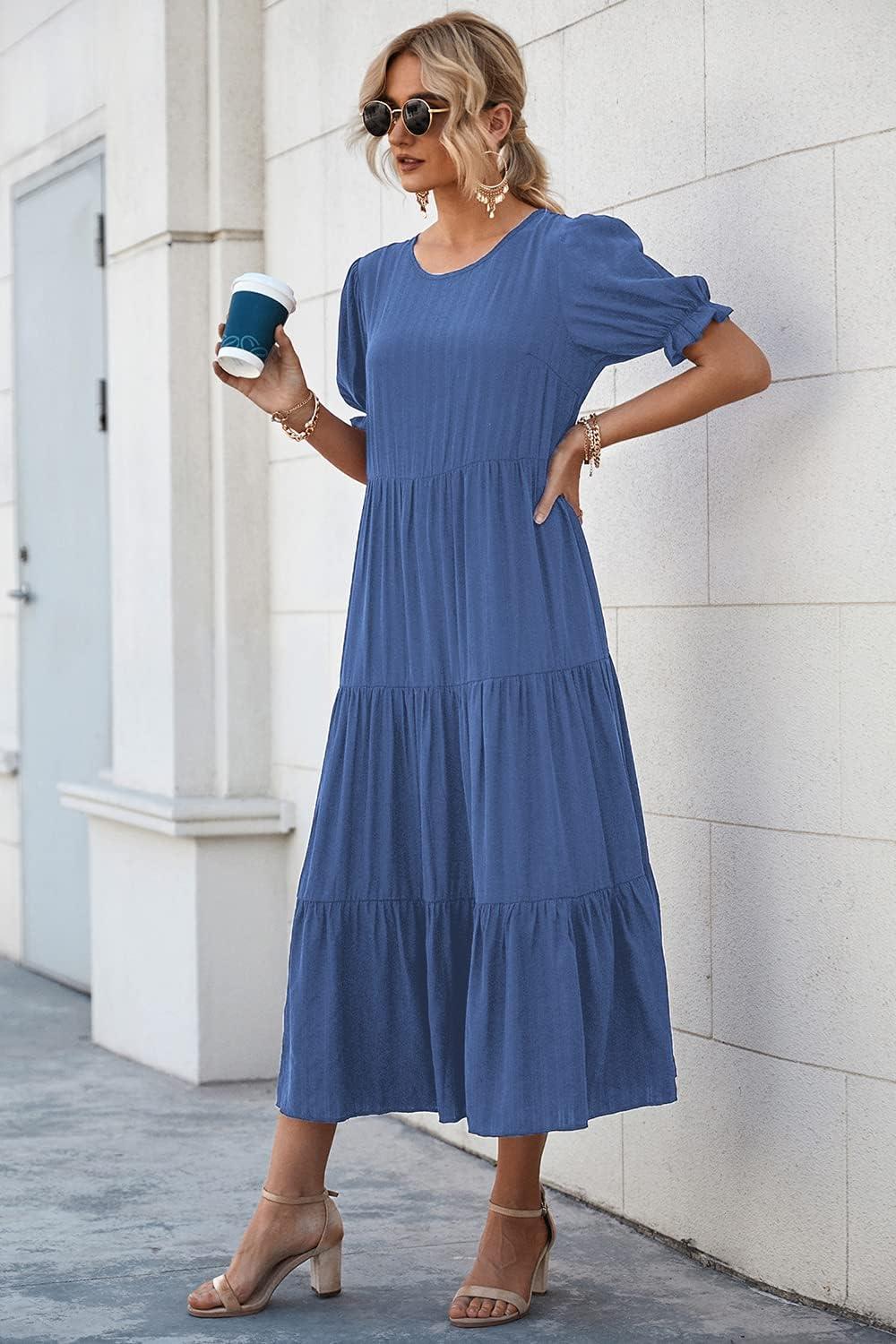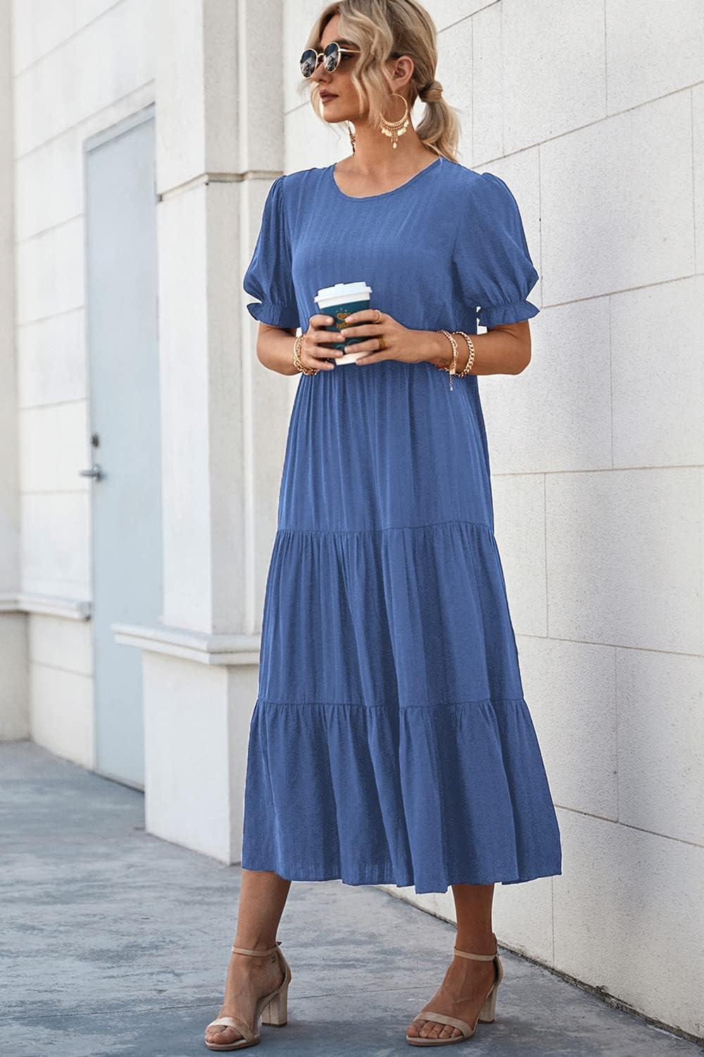 PRETTYGARDEN Summer Dresses for Women 2025 Casual Floral Boho Midi Sun Dress Puff Short Sleeve Flowy Beach Vacation Sundress(Solid Blue)
