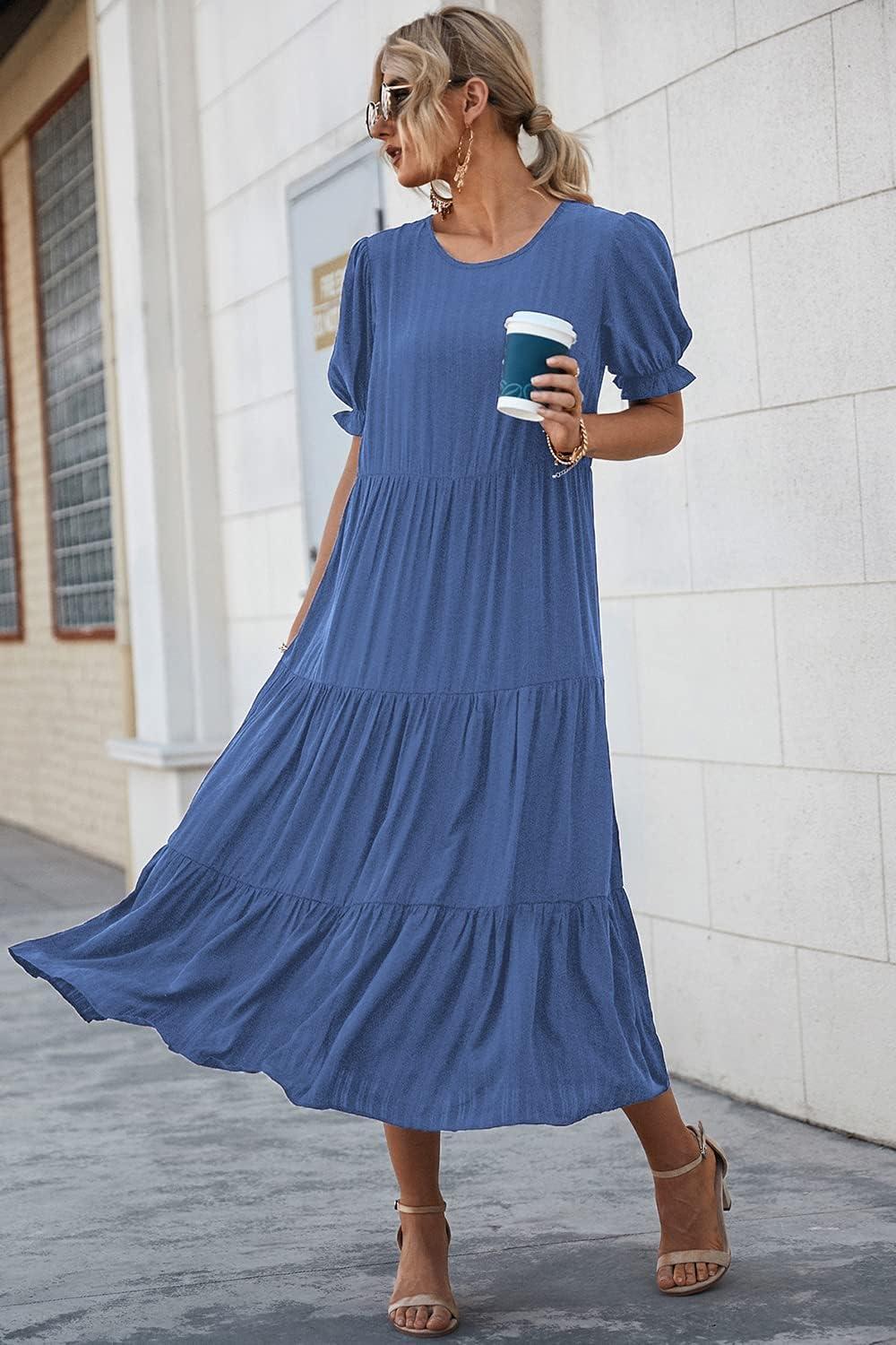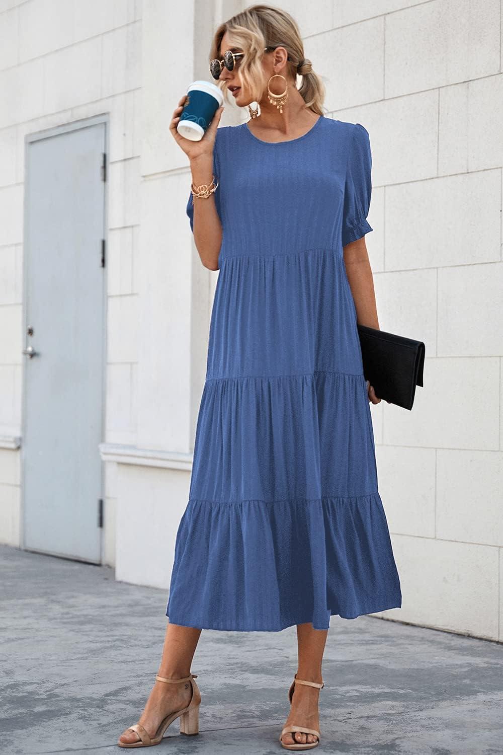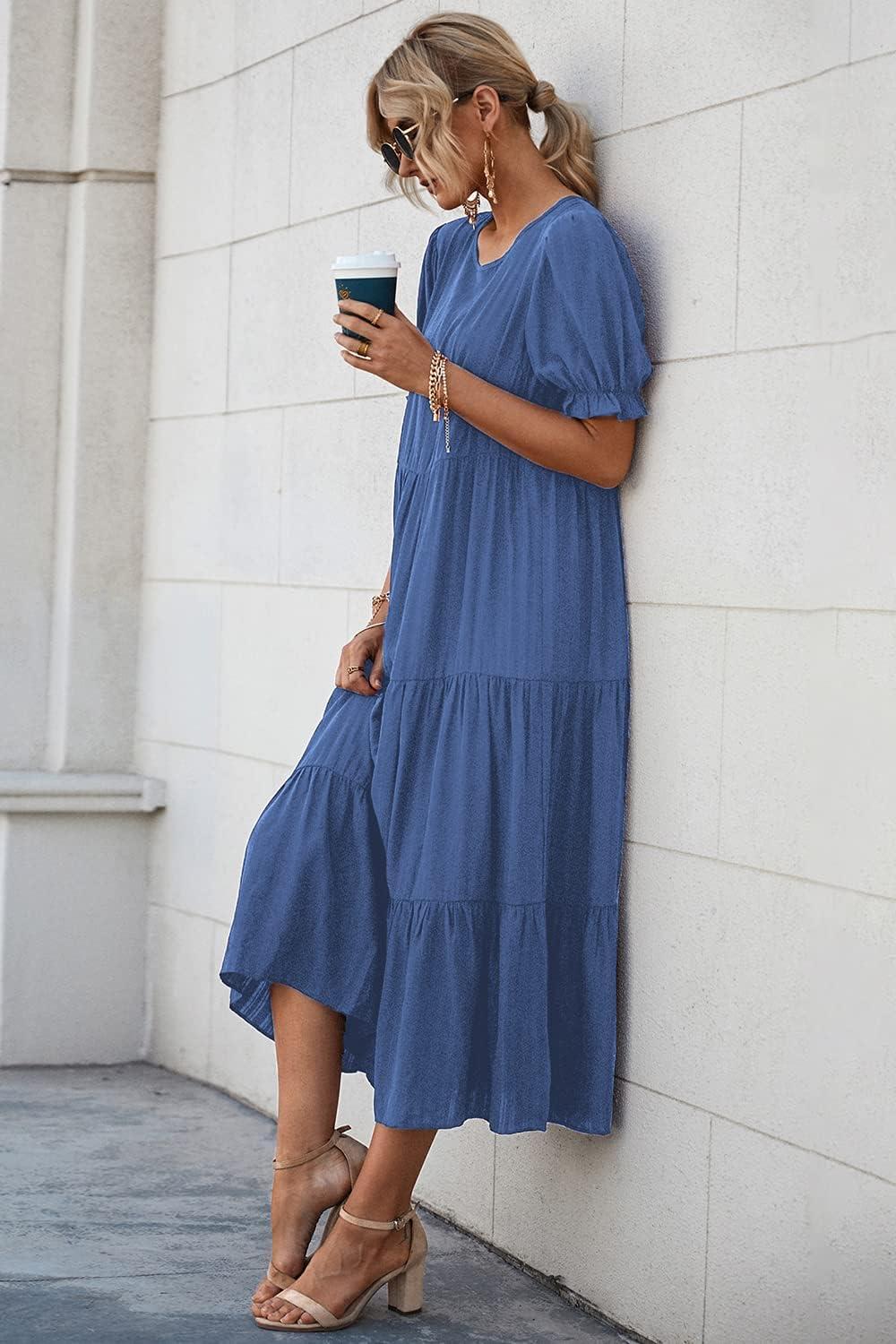 PRETTYGARDEN Summer Dresses for Women 2025 Casual Floral Boho Midi Sun Dress Puff Short Sleeve Flowy Beach Vacation Sundress(Solid Blue)