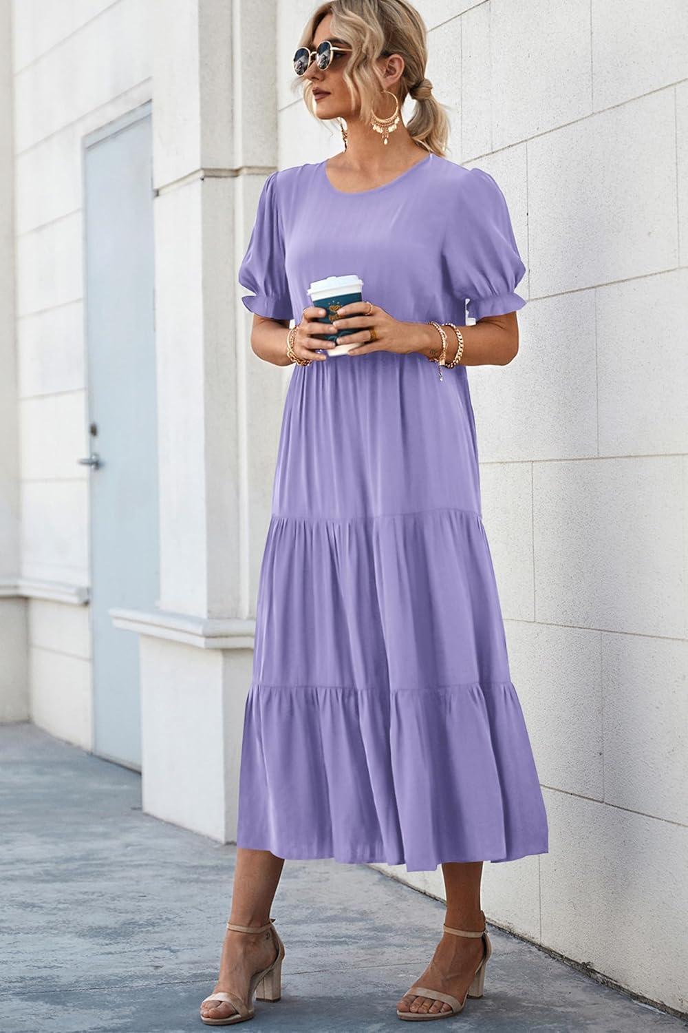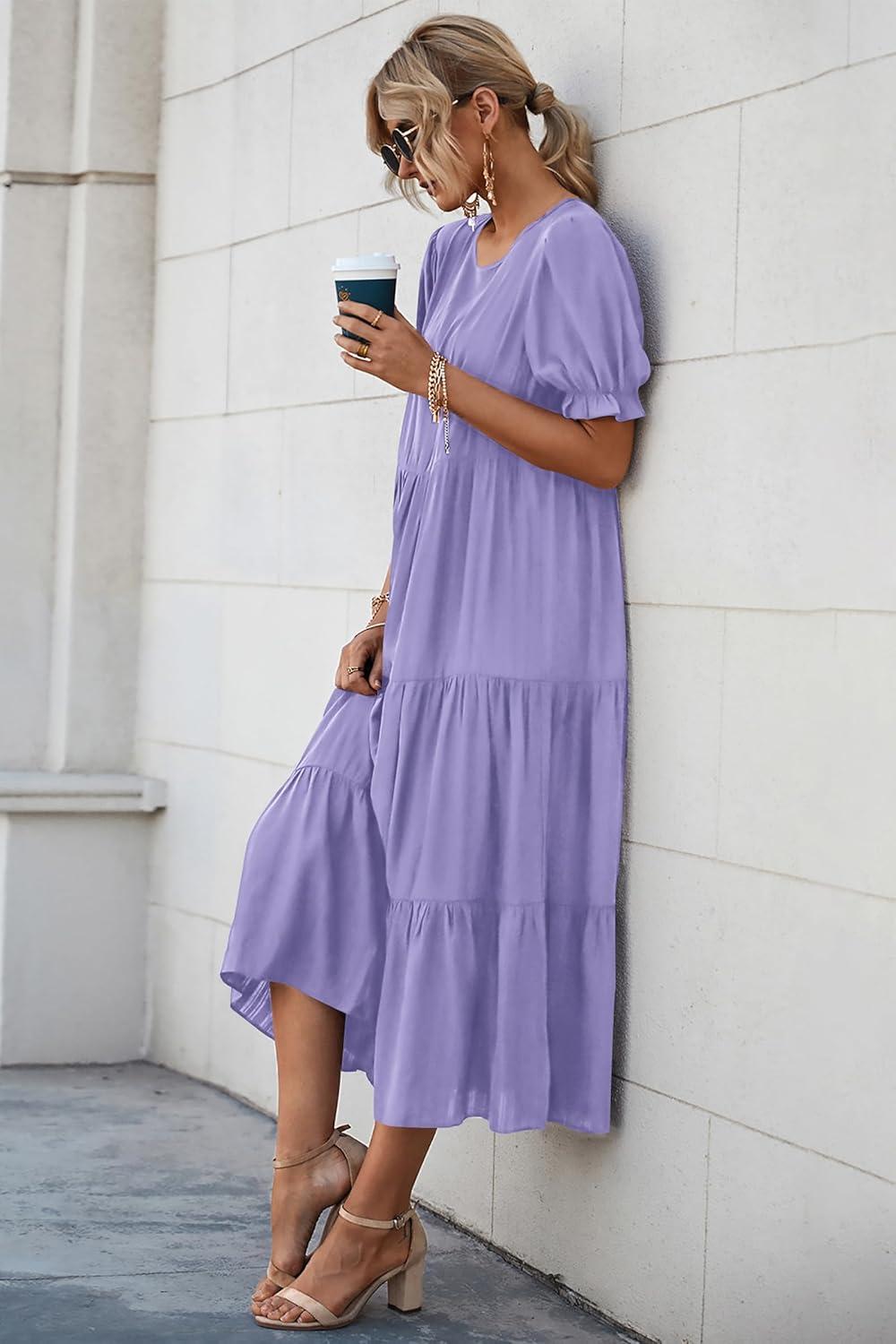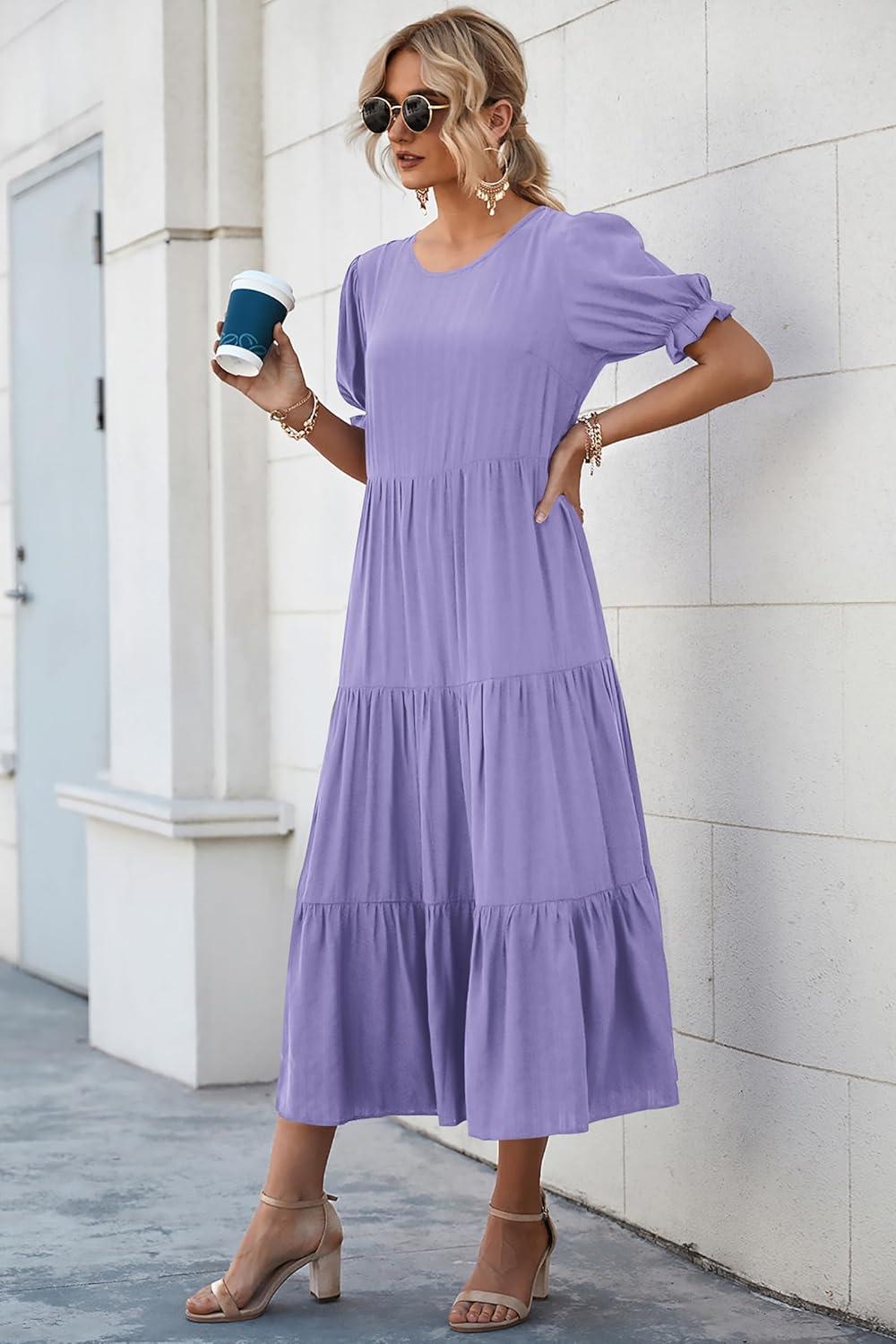 PRETTYGARDEN Summer Dresses for Women 2025 Casual Floral Boho Midi Sun Dress Puff Short Sleeve Flowy Beach Vacation Sundress(Solid Purple)