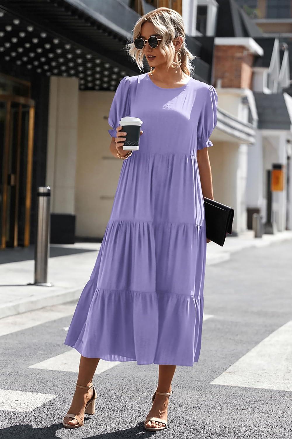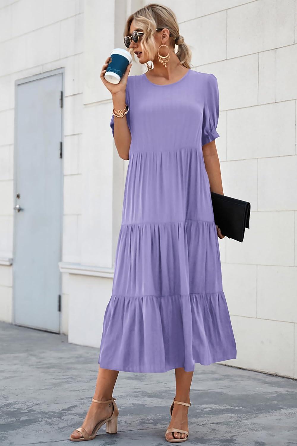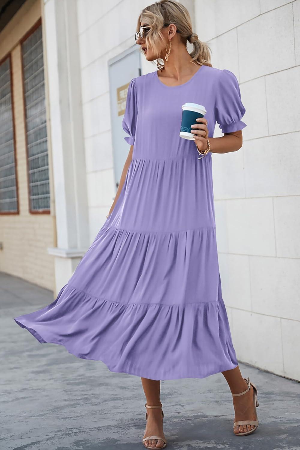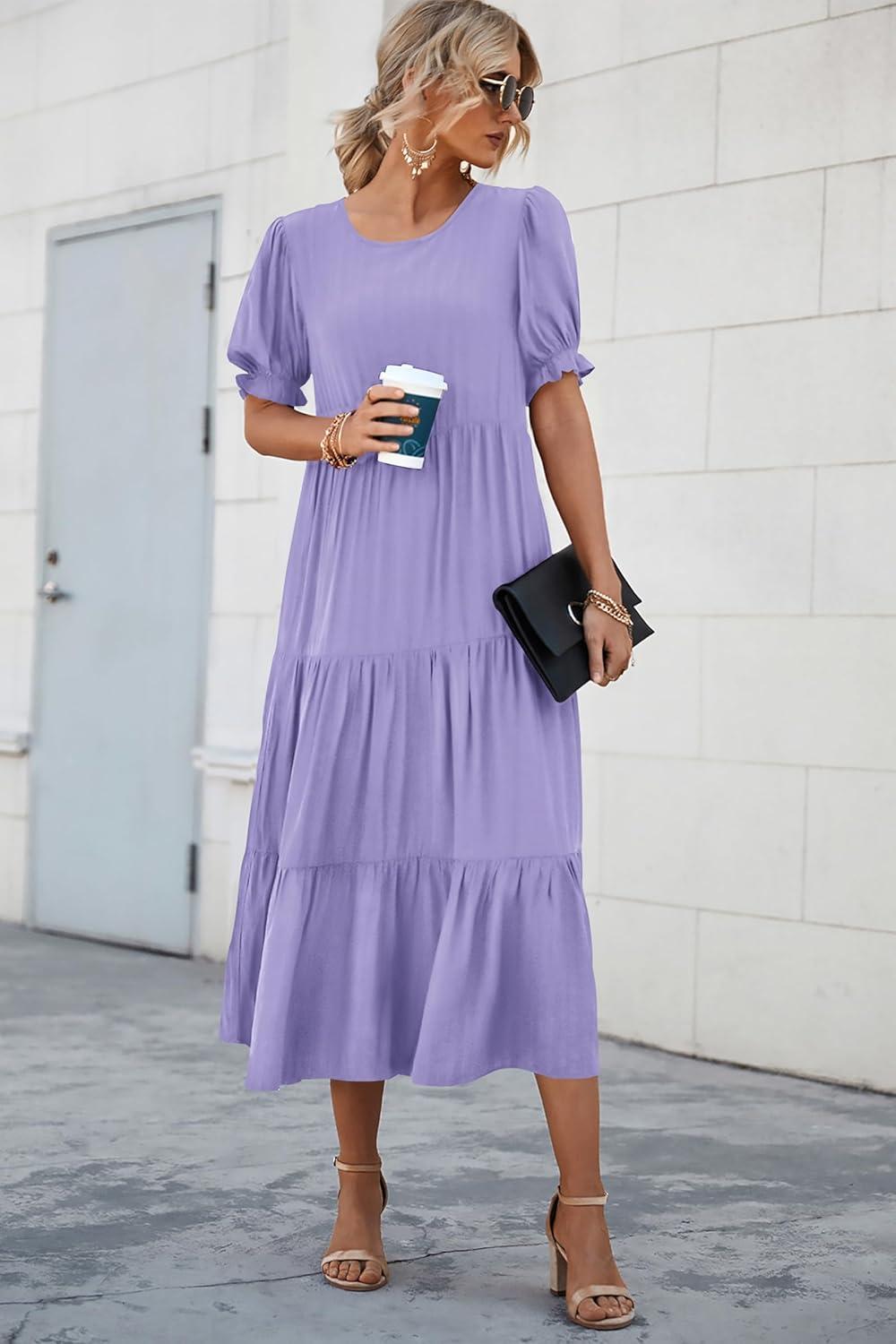 PRETTYGARDEN Summer Dresses for Women 2025 Casual Floral Boho Midi Sun Dress Puff Short Sleeve Flowy Beach Vacation Sundress(Solid Purple)