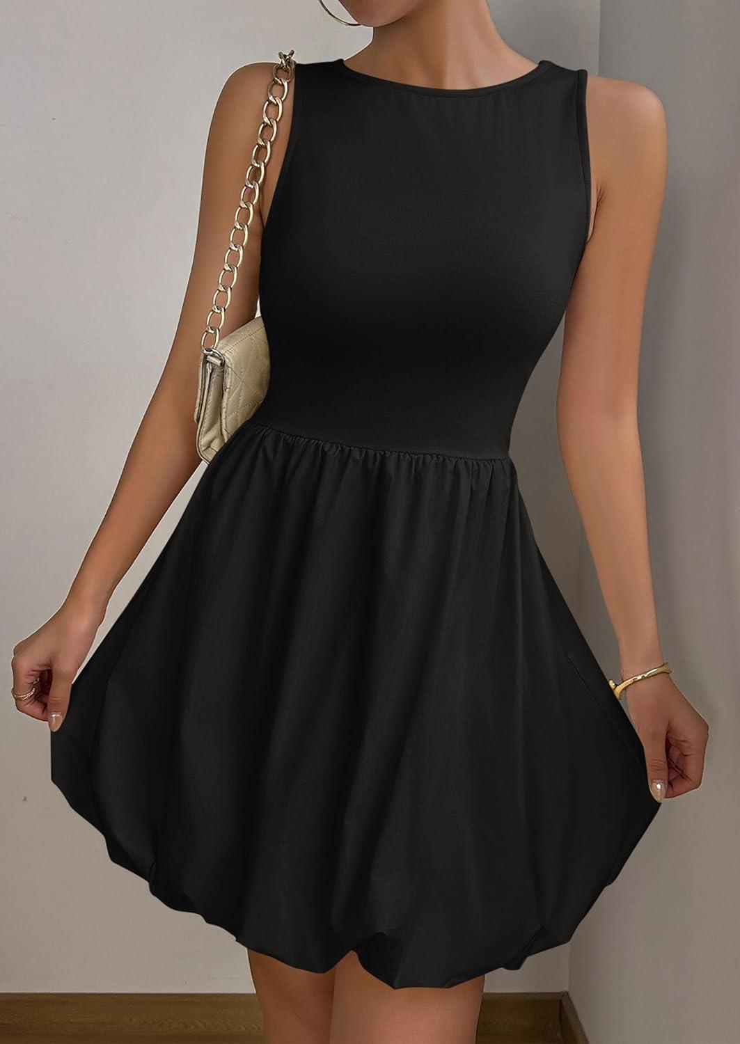 PRETTYGARDEN Summer Dresses for Women 2025 Casual Sleeveless Tank Mini Short Dress Crew Neck Bubble Sundress with Pockets(Black)