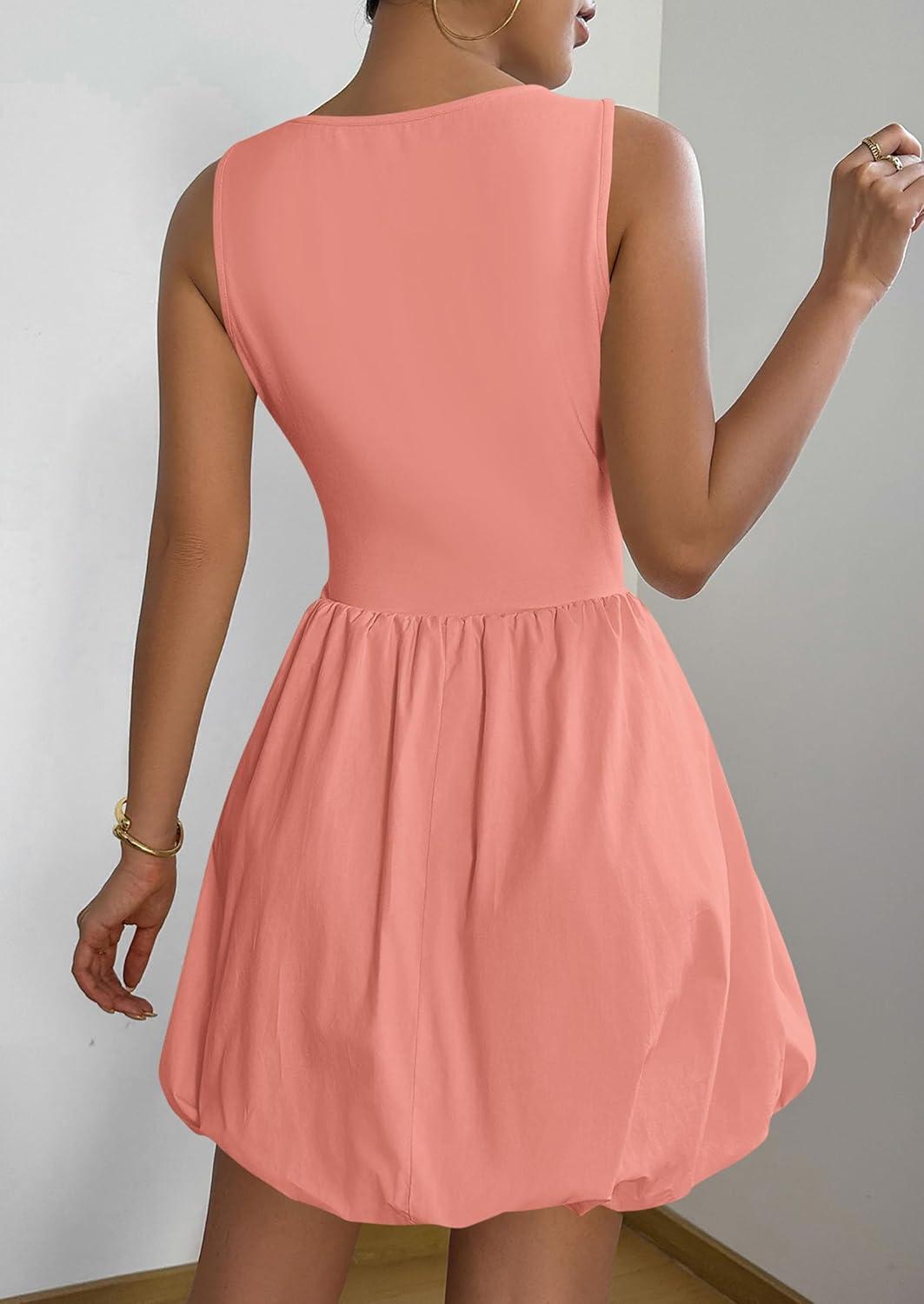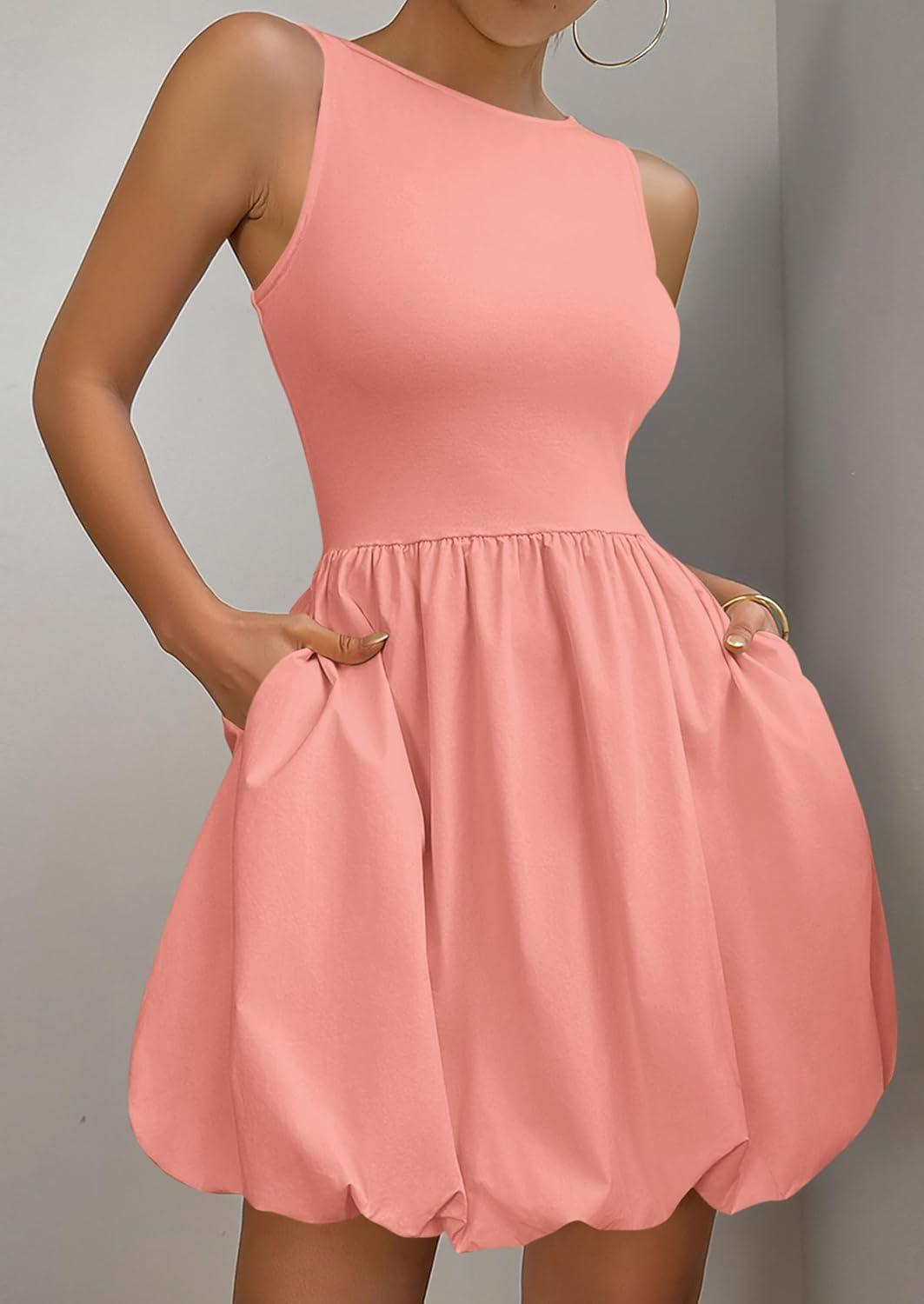 PRETTYGARDEN Summer Dresses for Women 2025 Casual Sleeveless Tank Mini Short Dress Crew Neck Bubble Sundress with Pockets(Pink)