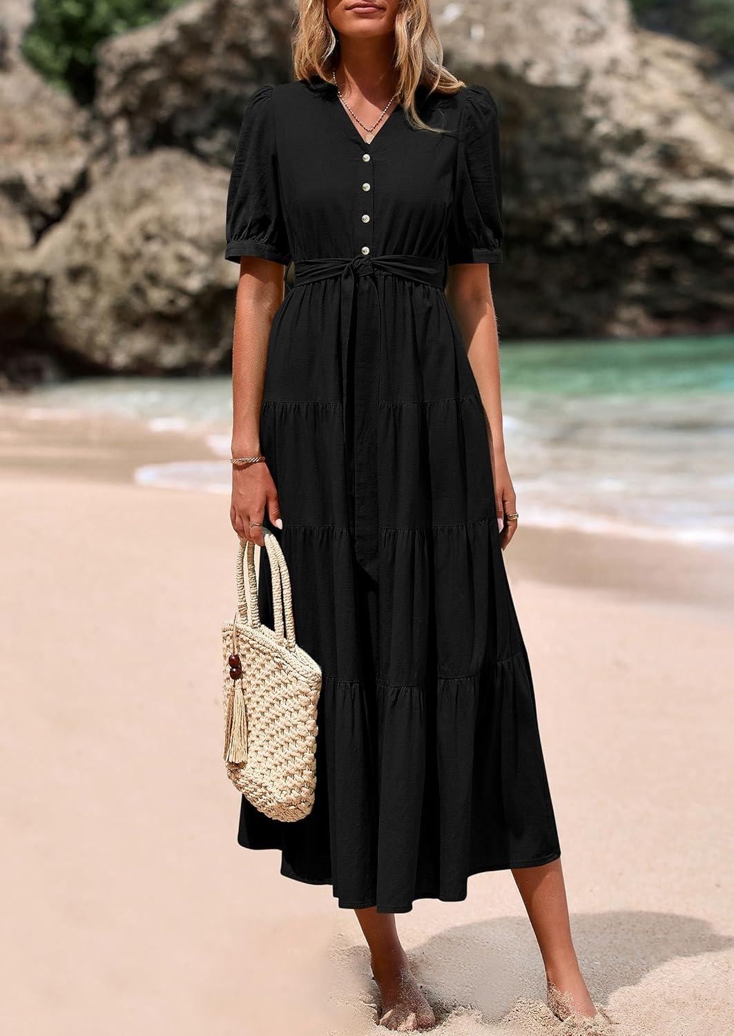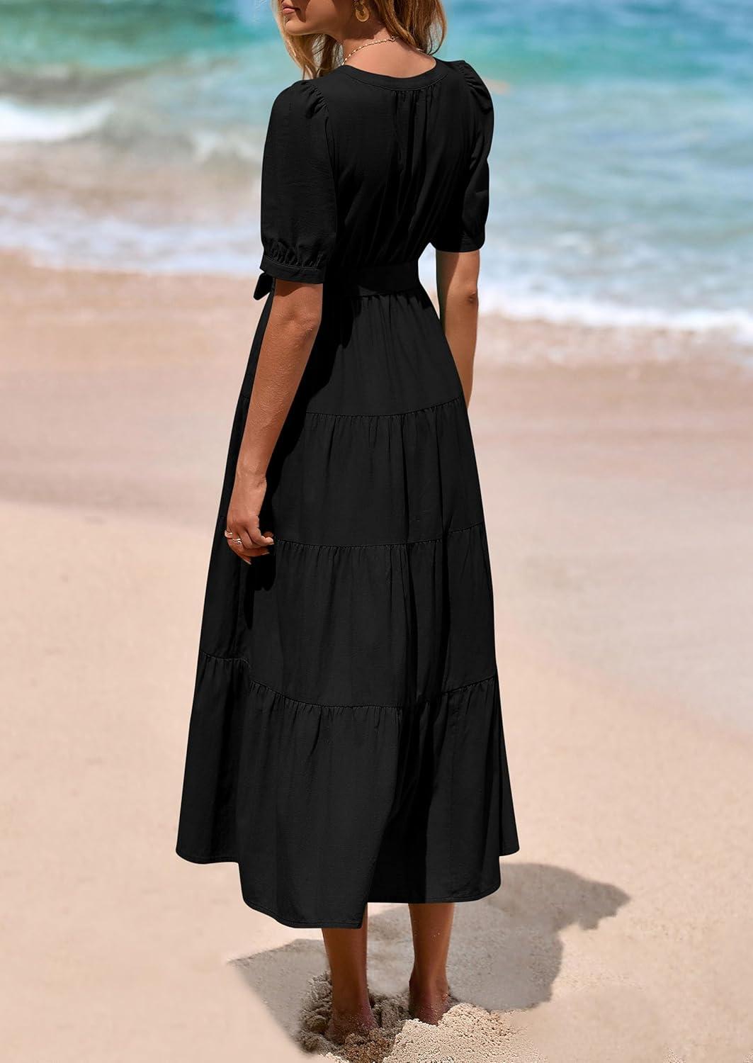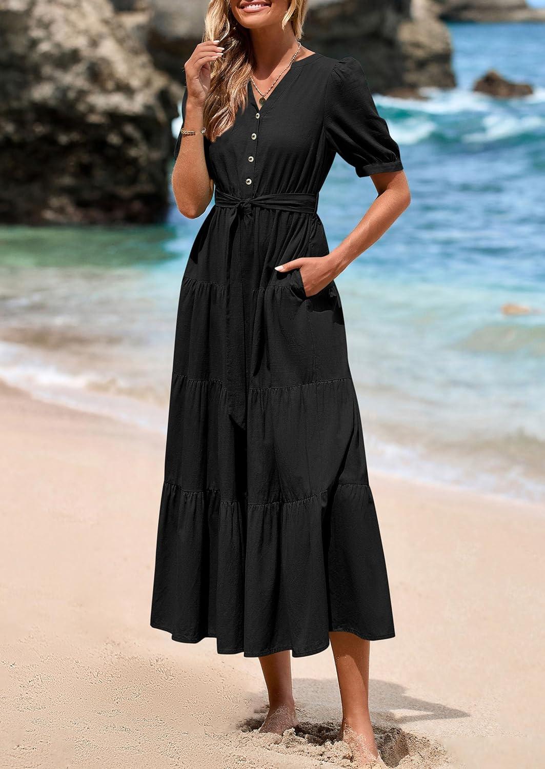 PRETTYGARDEN Summer Dresses for Women 2025 Elegant Classy Short Sleeve V Neck Ruffle A Line Belted Long Flowy Beach Dress(Black)