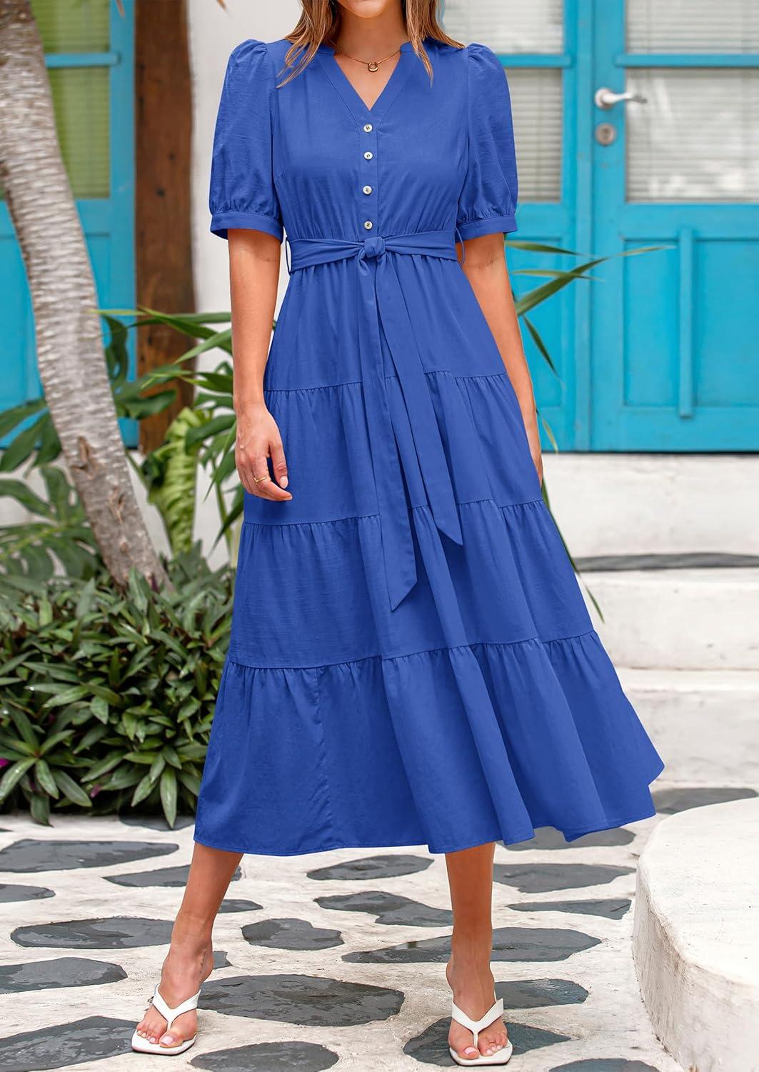 PRETTYGARDEN Summer Dresses for Women 2025 Elegant Classy Short Sleeve V Neck Ruffle A Line Belted Long Flowy Beach Dress(Blue)