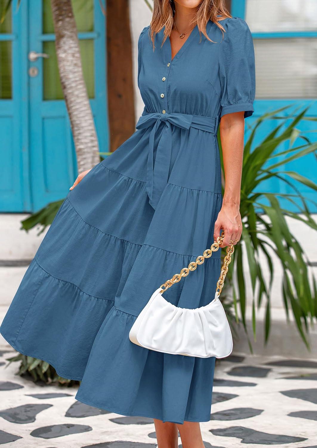 PRETTYGARDEN Summer Dresses for Women 2025 Elegant Classy Short Sleeve V Neck Ruffle A Line Belted Long Flowy Beach Dress(Grey Blue)
