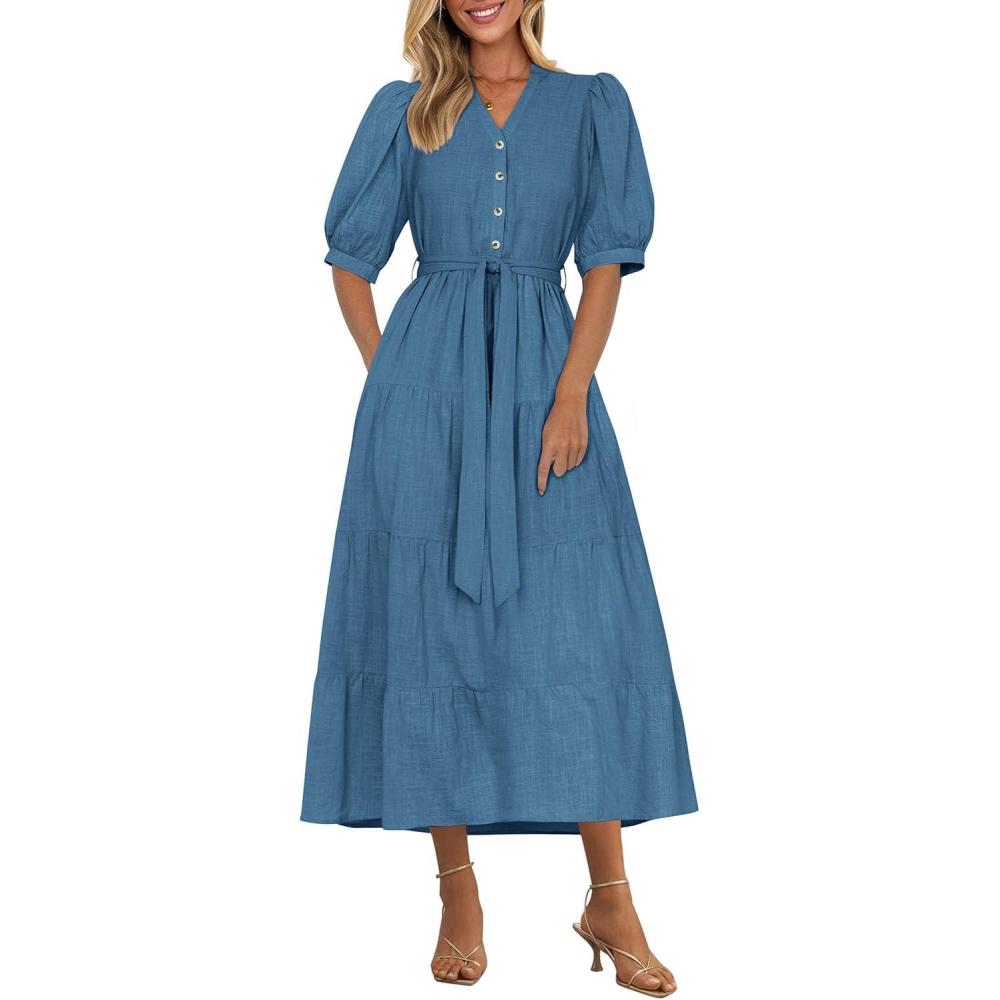 Be the first to review “PRETTYGARDEN Summer Dresses for Women 2025 Elegant Classy Short Sleeve V Neck Ruffle A Line Belted Long Flowy Beach Dress(Grey Blue)”