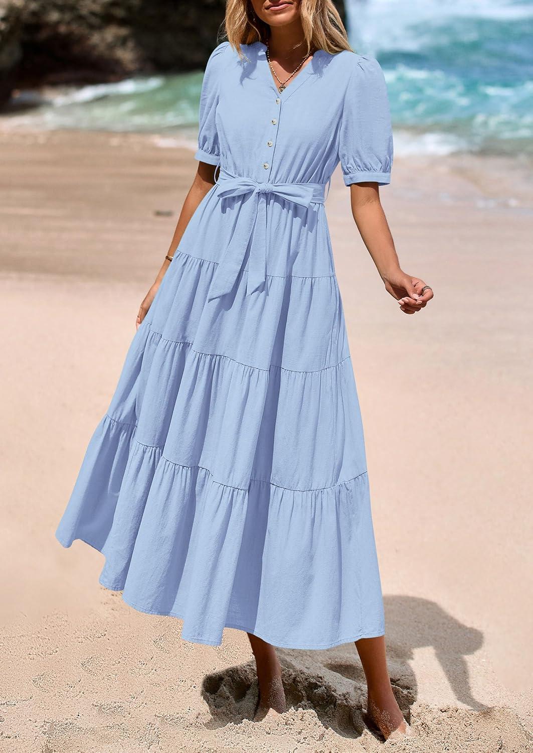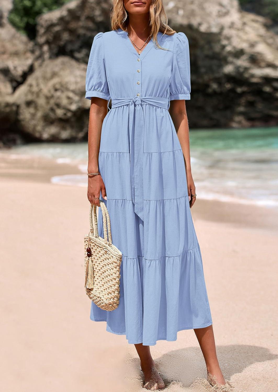 PRETTYGARDEN Summer Dresses for Women 2025 Elegant Classy Short Sleeve V Neck Ruffle A Line Belted Long Flowy Beach Dress(Light Blue)